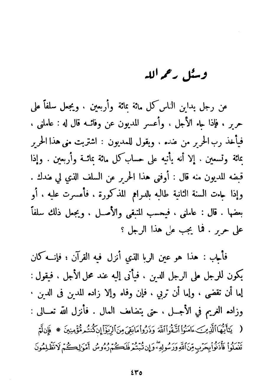 هَذَا هُوَ عَيْنُ الرِّبَا الَّذِي أُنْزِلَ فِيهِ الْقُرْآنُ. فَإِنَّهُ كَانَ يَكُونُ لِلرَّجُلِ عَلَى الرَّجُلِ الدَّيْنُ فَيَأْتِي إلَيْهِ عِنْدَ مَحَلِّ الْأَجَلِ فَيَقُولُ: إمَّا أَنْ تَقْضِيَ وَإِمَّا أَنْ تُرْبِيَ فَإِنْ وَفَّاهُ وَإِلَّا زَادَهُ الْمَدِينُ فِي الدَّيْنِ وَزَادَهُ الْغَرِيمُ فِي الْأَجَلِ حَتَّى يَتَضَاعَفَ الْمَالُ. فَأَنْزَلَ اللَّهُ تَعَالَى: {يَا أَيُّهَا الَّذِينَ آمَنُوا اتَّقُوا اللَّهَ وَذَرُوا مَا بَقِيَ مِنَ الرِّبَا إنْ كُنْتُمْ مُؤْمِنِينَ} {فَإِنْ لَمْ تَفْعَلُوا فَأْذَنُوا بِحَرْبٍ مِنَ اللَّهِ وَرَسُولِهِ وَإِنْ تُبْتُمْ فَلَكُمْ