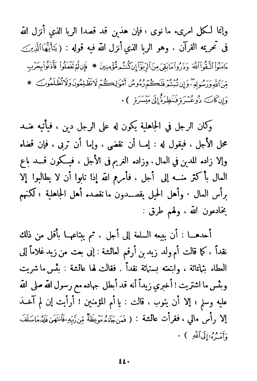 وَإِنَّمَا لِكُلِّ امْرِئٍ مَا نَوَى؛ فَإِنَّ هَذَيْنِ قَدْ قَصَدَا الرِّبَا الَّذِي أَنْزَلَ اللَّهُ فِي تَحْرِيمِهِ الْقُرْآنَ وَهُوَ الرِّبَا الَّذِي أَنْزَلَ اللَّهُ فِيهِ قَوْلَهُ: {يَا أَيُّهَا الَّذِينَ آمَنُوا اتَّقُوا اللَّهَ وَذَرُوا مَا بَقِيَ مِنَ الرِّبَا إنْ كُنْتُمْ مُؤْمِنِينَ} {فَإِنْ لَمْ تَفْعَلُوا فَأْذَنُوا بِحَرْبٍ مِنَ اللَّهِ وَرَسُولِهِ وَإِنْ تُبْتُمْ فَلَكُمْ رُءُوسُ أَمْوَالِكُمْ لَا تَظْلِمُونَ وَلَا تُظْلَمُونَ} {وَإِنْ كَانَ ذُو عُسْرَةٍ فَنَظِرَةٌ إلَى مَيْسَرَةٍ} . وَكَانَ الرَّجُلُ فِي الْجَاهِلِيَّةِ يَكُونُ لَهُ عَلَى الرَّجُلِ دَيْنٌ فَيَأْتِيه عِنْدَ مَحَلِّ الْأَجَلِ فَيَقُولُ لَهُ: إمَّا أَنْ تَقْضِيَ وَإِمَّا أَنْ تُرْبِيَ فَإِنْ قَضَاهُ وَإِلَّا زَادَهُ الْمَدِينُ فِي الْمَالِ وَزَادَهُ الْغَرِيمُ فِي الْأَجَلِ فَيَكُونُ قَدْ بَاعَ الْمَالَ بِأَكْثَرَ مِنْهُ إلَى أَجَلٍ فَأَمَرَهُمْ اللَّهُ إذَا تَابُوا أَنْ لَا يُطَالِبُوا إلَّا بِرَأْسِ الْمَالِ وَأَهْلُ الْحِيَلِ يَقْصِدُونَ مَا تَقْصِدُهُ أَهْلُ الْجَاهِلِيَّةِ؛ لَكِنَّهُمْ يُخَادِعُونَ اللَّهَ وَلَهُمْ طُرُقٌ: أَحَدُهَا: أَنْ يَبِيعَهُ السِّلْعَةَ إلَى أَجَلٍ ثُمَّ يَبْتَاعُهَا بِأَقَلَّ مِنْ ذَلِكَ نَقْدًا كَمَا قَالَتْ أُمُّ وَلَدِ زَيْدِ بْنِ أَرْقَمَ لِعَائِشَةَ: إنِّي بِعْت مِنْ زَيْدٍ غُلَامًا إلَى الْعَطَاءِ بِثَمَانِمِائَةِ وَابْتَعْته بِسِتِّمِائَةِ نَقْدًا. فَقَالَتْ لَهَا عَائِشَةُ: بِئْسَ مَا شَرَيْت وَبِئْسَ مَا اشْتَرَيْت أَخْبِرِي زَيْدًا أَنَّهُ قَدْ أَبْطَلَ جِهَادَهُ مَعَ رَسُولِ اللَّهِ صَلَّى اللَّهُ عَلَيْهِ وَسَلَّمَ إلَّا أَنْ يَتُوبَ قَالَتْ: يَا أُمَّ الْمُؤْمِنِينَ أَرَأَيْت إنْ لَمْ آخُذْ إلَّا رَأْسَ مَالِي فَقَرَأَتْ عَائِشَةُ: {فَمَنْ جَاءَهُ مَوْعِظَةٌ مِنْ رَبِّهِ فَانْتَهَى فَلَهُ مَا سَلَفَ وَأَمْرُهُ إلَى اللَّهِ} .