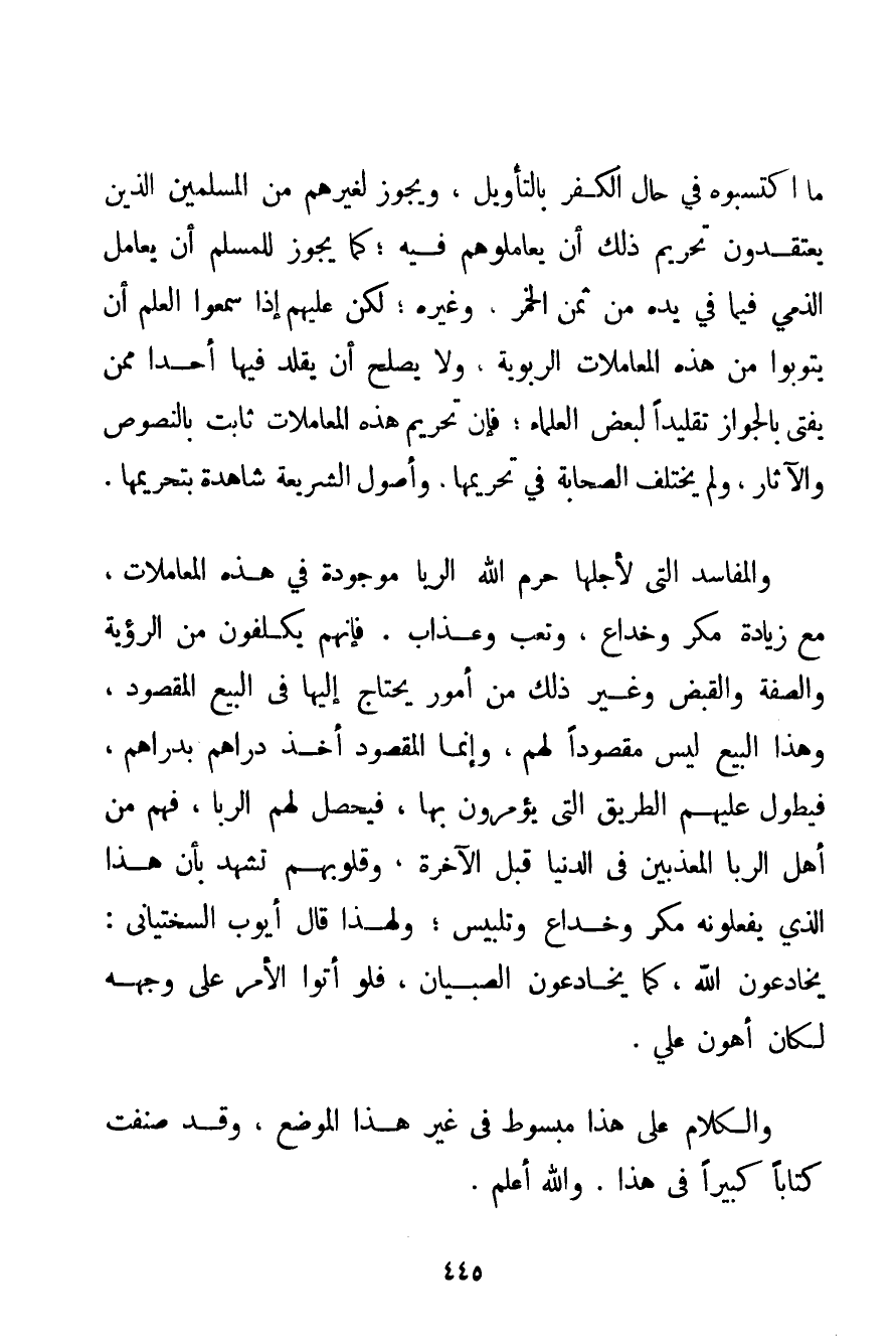 مَا اكْتَسَبُوهُ فِي حَالِ الْكُفْرِ بِالتَّأْوِيلِ وَيَجُوزُ لِغَيْرِهِمْ مِنْ الْمُسْلِمِينَ الَّذِينَ يَعْتَقِدُونَ تَحْرِيمَ ذَلِكَ أَنْ يُعَامِلُوهُمْ فِيهِ؛ كَمَا يَجُوزُ لِلْمُسْلِمِ أَنْ يُعَامِلَ الذِّمِّيَّ فِيمَا فِي يَدِهِ مِنْ ثَمَنِ الْخَمْرِ وَغَيْرِهِ؛ لَكِنْ عَلَيْهِمْ إذَا سَمِعُوا الْعِلْمَ أَنْ يَتُوبُوا مِنْ هَذِهِ الْمُعَامَلَاتِ الرِّبَوِيَّةِ وَلَا يَصْلُحَ أَنْ يُقَلِّدَ فِيهَا أَحَدًا مِمَّنْ يُفْتِي بِالْجَوَازِ تَقْلِيدًا لِبَعْضِ الْعُلَمَاءِ؛ فَإِنَّ تَحْرِيمَ هَذِهِ الْمُعَامَلَاتِ ثَابِتٌ بِالنُّصُوصِ وَالْآثَارِ وَلَمْ يَخْتَلِفْ الصَّحَابَةُ فِي تَحْرِيمِهَا وَأُصُولُ الشَّرِيعَةِ شَاهِدَةٌ بِتَحْرِيمِهَا. وَالْمَفَاسِدُ الَّتِي لِأَجْلِهَا حَرَّمَ اللَّهُ الرِّبَا مَوْجُودَةٌ فِي هَذِهِ الْمُعَامَلَاتِ مَعَ زِيَادَةِ مَكْرٍ وَخِدَاعٍ وَتَعَبٍ وَعَذَابٍ. فَإِنَّهُمْ يُكَلِّفُونَ مِنْ الرُّؤْيَةِ وَالصِّفَةِ وَالْقَبْضِ وَغَيْرِ ذَلِكَ مِنْ أُمُورٍ يَحْتَاجُ إلَيْهَا فِي الْبَيْعِ الْمَقْصُودِ وَهَذَا الْبَيْعُ لَيْسَ مَقْصُودًا لَهُمْ وَإِنَّمَا الْمَقْصُودُ أَخْذُ دَرَاهِمَ بِدَرَاهِمَ فَيَطُولُ عَلَيْهِمْ الطَّرِيقُ الَّتِي يُؤْمَرُونَ بِهَا فَيَحْصُلُ لَهُمْ الرِّبَا فَهُمْ مِنْ أَهْلِ الرِّبَا الْمُعَذَّبِينَ فِي الدُّنْيَا قَبْلَ الْآخِرَةِ وَقُلُوبُهُمْ تَشْهَدُ بِأَنَّ هَذَا الَّذِي يَفْعَلُونَهُ مَكْرٌ وَخِدَاعٌ وَتَلْبِيسٌ؛ وَلِهَذَا قَالَ أَيُّوبُ السختياني: يُخَادِعُونَ اللَّهَ كَمَا يُخَادِعُونَ الصِّبْيَانَ فَلَوْ أَتَوْا الْأَمْرَ عَلَى وَجْهِهِ لَكَانَ أَهْوَنَ عَلَيَّ. وَالْكَلَامُ عَلَى هَذَا مَبْسُوطٌ فِي غَيْرِ هَذَا الْمَوْضِعِ وَقَدْ صَنَّفْت كِتَابًا كَبِيرًا فِي هَذَا. وَاَللَّهُ أَعْلَمُ.
