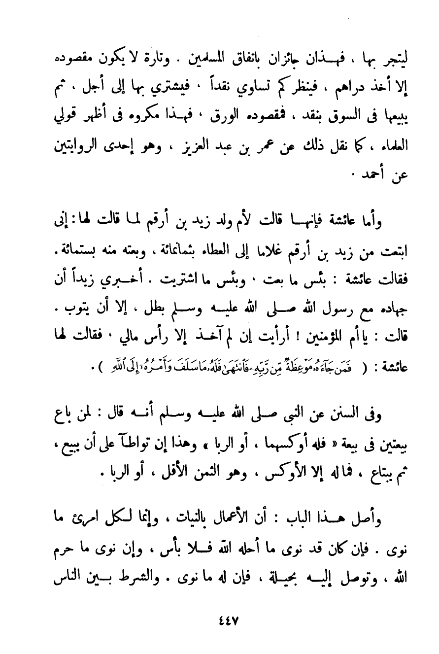 لِيَتَّجِرَ بِهَا فَهَذَانِ جَائِزَانِ بِاتِّفَاقِ الْمُسْلِمِينَ. وَتَارَةً لَا يَكُونُ مَقْصُودُهُ إلَّا أَخْذَ دَرَاهِمَ فَيَنْظُرُ كَمْ تُسَاوِي نَقْدًا فَيَشْتَرِي بِهَا إلَى أَجَلٍ ثُمَّ يَبِيعُهَا فِي السُّوقِ بِنَقْدِ فَمَقْصُودُهُ الْوَرِقُ فَهَذَا مَكْرُوهٌ فِي أَظْهَرِ قَوْلَيْ الْعُلَمَاءِ كَمَا نُقِلَ ذَلِكَ عَنْ عُمَرَ بْنِ عَبْدِ الْعَزِيزِ وَهُوَ إحْدَى الرِّوَايَتَيْنِ عَنْ أَحْمَد. وَأَمَّا عَائِشَةُ فَإِنَّهَا قَالَتْ لِأُمِّ وَلَدِ زَيْدِ بْنِ أَرْقَمَ لَمَّا قَالَتْ لَهَا: إنِّي ابْتَعْت مِنْ زَيْدِ بْنِ أَرْقَمَ غُلَامًا إلَى الْعَطَاءِ بِثَمَانِمِائَةِ وَبِعْته مِنْهُ بِسِتِّمِائَةِ. فَقَالَتْ عَائِشَةُ: بِئْسَ مَا بِعْت وَبِئْسَ مَا اشْتَرَيْت. أَخْبِرِي زَيْدًا أَنَّ جِهَادَهُ مَعَ رَسُولِ اللَّهِ صَلَّى اللَّهُ عَلَيْهِ وَسَلَّمَ بَطَلَ إلَّا أَنْ يَتُوبَ. قَالَتْ: يَا أُمَّ الْمُؤْمِنِينَ أَرَأَيْت إنْ لَمْ آخُذْ إلَّا رَأْسَ مَالِي فَقَالَتْ لَهَا عَائِشَةُ: {فَمَنْ جَاءَهُ مَوْعِظَةٌ مِنْ رَبِّهِ فَانْتَهَى فَلَهُ مَا سَلَفَ وَأَمْرُهُ إلَى اللَّهِ} . وَفِي السُّنَنِ عَنْ {النَّبِيِّ صَلَّى اللَّهُ عَلَيْهِ وَسَلَّمَ أَنَّهُ قَالَ: لِمَنْ بَاعَ بَيْعَتَيْنِ فِي بَيْعَةٍ فَلَهُ أَوْكَسُهُمَا أَوْ الرِّبَا} وَهَذَا إنْ تَوَاطَآ عَلَى أَنْ يَبِيعَ ثُمَّ يَبْتَاعُ فَمَا لَهُ إلَّا الْأَوْكَسُ وَهُوَ الثَّمَنُ الْأَقَلُّ أَوْ الرِّبَا. وَأَصْلُ هَذَا الْبَابِ: أَنَّ الْأَعْمَالَ بِالنِّيَّاتِ وَإِنَّمَا لِكُلِّ امْرِئٍ مَا نَوَى. فَإِنْ كَانَ قَدْ نَوَى مَا أَحَلَّهُ اللَّهُ فَلَا بَأْسَ وَإِنْ نَوَى مَا حَرَّمَ اللَّهُ وَتَوَصَّلَ إلَيْهِ بِحِيلَةِ فَإِنَّ لَهُ مَا نَوَى. وَالشَّرْطُ بَيْنَ النَّاسِ