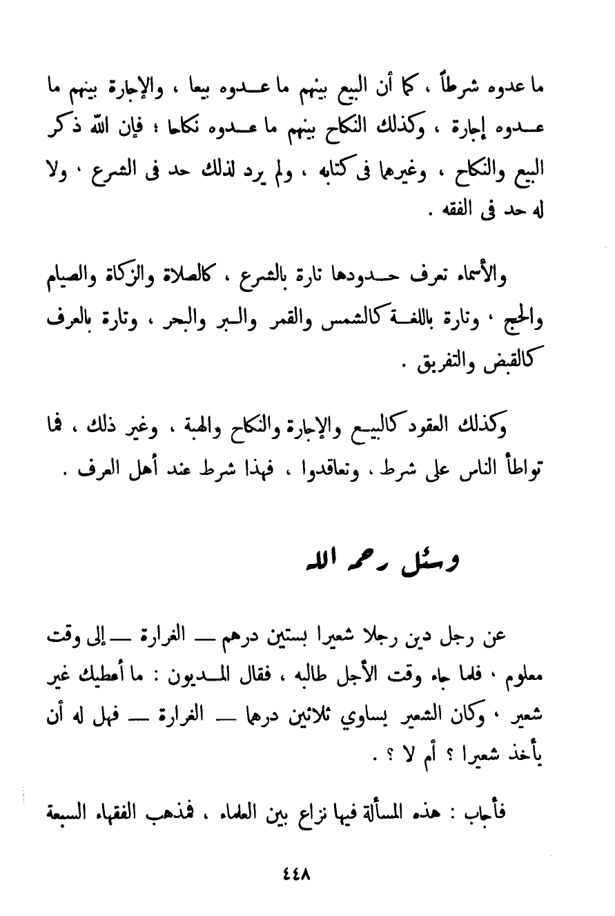 مَا عَدُّوهُ شَرْطًا كَمَا أَنَّ الْبَيْعَ بَيْنَهُمْ مَا عَدُّوهُ بَيْعًا وَالْإِجَارَةُ بَيْنَهُمْ مَا عَدُّوهُ إجَارَةً وَكَذَلِكَ النِّكَاحُ بَيْنَهُمْ مَا عَدُّوهُ نِكَاحًا؛ فَإِنَّ اللَّهَ ذَكَرَ الْبَيْعَ وَالنِّكَاحَ وَغَيْرَهُمَا فِي كِتَابِهِ وَلَمْ يَرِدْ لِذَلِكَ حَدٌّ فِي الشَّرْعِ وَلَا لَهُ حَدٌّ فِي الْفِقْهِ. وَالْأَسْمَاءُ تُعْرَفُ حُدُودُهَا تَارَةً بِالشَّرْعِ كَالصَّلَاةِ وَالزَّكَاةِ وَالصِّيَامِ وَالْحَجِّ وَتَارَةً بِاللُّغَةِ كَالشَّمْسِ وَالْقَمَرِ وَالْبَرِّ وَالْبَحْرِ وَتَارَةً بِالْعُرْفِ كَالْقَبْضِ وَالتَّفْرِيقِ. وَكَذَلِكَ الْعُقُودُ كَالْبَيْعِ وَالْإِجَارَةِ وَالنِّكَاحِ وَالْهِبَةِ وَغَيْرِ ذَلِكَ فَمَا تَوَاطَأَ النَّاسُ عَلَى شَرْطٍ وَتَعَاقَدُوا فَهَذَا شَرْطٌ عِنْدَ أَهْلِ الْعُرْفِ.