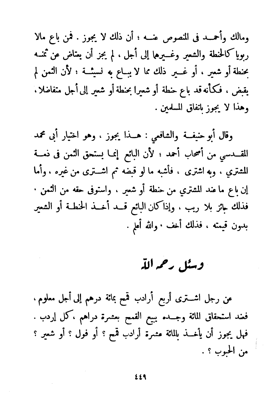 وَمَالِكٍ وَأَحْمَد فِي الْمَنْصُوصِ عَنْهُ؛ أَنَّ ذَلِكَ لَا يَجُوزُ. فَمَنْ بَاعَ مَالًا رِبَوِيًّا كَالْحِنْطَةِ وَالشَّعِيرِ وَغَيْرِهِمَا إلَى أَجَلٍ لَمْ يَجُزْ أَنْ يَعْتَاضَ عَنْ ثَمَنِهِ بِحِنْطَةٍ أَوْ شَعِيرٍ أَوْ غَيْرِ ذَلِكَ مِمَّا لَا يُبَاعُ بِهِ نَسِيئَةً؛ لِأَنَّ الثَّمَنَ لَمْ يُقْبَضْ فَكَأَنَّهُ قَدْ بَاعَ حِنْطَةً أَوْ شَعِيرًا بِحِنْطَةٍ أَوْ شَعِيرٍ إلَى أَجَلٍ مُتَفَاضِلًا وَهَذَا لَا يَجُوزُ بِاتِّفَاقِ الْمُسْلِمِينَ. وَقَالَ أَبُو حَنِيفَةَ وَالشَّافِعِيُّ: هَذَا يَجُوزُ وَهُوَ اخْتِيَارُ أَبِي مُحَمَّدٍ المقدسي مِنْ أَصْحَابِ أَحْمَد؛ لِأَنَّ الْبَائِعَ إنَّمَا يَسْتَحِقُّ الثَّمَنَ فِي ذِمَّةِ الْمُشْتَرِي وَبِهِ اشْتَرَى فَأَشْبَهَ مَا لَوْ قَبَضَهُ ثُمَّ اشْتَرَى مِنْ غَيْرِهِ وَأَمَّا إنْ بَاعَ مَا عِنْدَ الْمُشْتَرِي مِنْ حِنْطَةٍ أَوْ شَعِيرٍ وَاسْتَوْفَى حَقَّهُ مِنْ الثَّمَنِ فَذَلِكَ جَائِزٌ بِلَا رَيْبٍ وَإِذَا كَانَ الْبَائِعُ قَدْ أَخَذَ الْحِنْطَةَ أَوْ الشَّعِيرَ بِدُونِ قِيمَتِهِ فَذَلِكَ أَخَفُّ وَاَللَّهُ أَعْلَمُ.