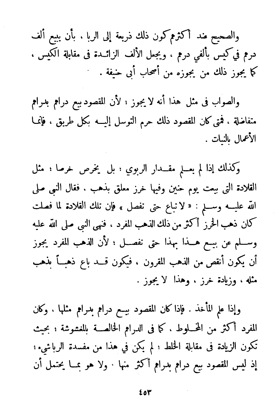 وَالصَّحِيحُ عِنْدَ أَكْثَرِهِمْ كَوْنُ ذَلِكَ ذَرِيعَةً إلَى الرِّبَا بِأَنْ يَبِيعَ أَلْفَ دِرْهَمٍ فِي كِيسٍ بِأَلْفَيْ دِرْهَمٍ وَيَجْعَلُ الْأَلْفَ الزَّائِدَةَ فِي مُقَابَلَةِ الْكِيسِ كَمَا يُجَوِّزُ ذَلِكَ مَنْ يُجَوِّزُهُ مِنْ أَصْحَابِ أَبِي حَنِيفَةَ. وَالصَّوَابُ فِي مِثْلِ هَذَا أَنَّهُ لَا يَجُوزُ؛ لِأَنَّ الْمَقْصُودَ بَيْعُ دَرَاهِمَ بِدَرَاهِمَ مُتَفَاضِلَةٍ فَمَتَى كَانَ الْمَقْصُودُ ذَلِكَ حَرُمَ التَّوَسُّلُ إلَيْهِ بِكُلِّ طَرِيقٍ فَإِنَّمَا الْأَعْمَالُ بِالنِّيَّاتِ. وَكَذَلِكَ إذَا لَمْ يُعْلَمْ مِقْدَارُ الرِّبَوِيِّ؛ بَلْ يُخْرَصُ خَرْصًا؛ مِثْلُ {الْقِلَادَةِ الَّتِي بِيعَتْ يَوْمَ حنين وَفِيهَا خَرَزٌ مُعَلَّقٌ بِذَهَبِ فَقَالَ النَّبِيُّ صَلَّى اللَّهُ عَلَيْهِ وَسَلَّمَ لَا تُبَاعُ حَتَّى تَفْصِلَ} فَإِنَّ تِلْكَ الْقِلَادَةَ لَمَّا فُصِلَتْ كَانَ ذَهَبُ الْخَرَزِ أَكْثَرَ مِنْ ذَلِكَ الذَّهَبِ الْمُفْرَدِ فَنَهَى النَّبِيُّ صَلَّى اللَّهُ عَلَيْهِ وَسَلَّمَ عَنْ بَيْعِ هَذَا بِهَذَا حَتَّى تُفْصَلَ؛ لِأَنَّ الذَّهَبَ الْمُفْرَدَ يَجُوزُ أَنْ يَكُونَ أَنْقَصَ مِنْ الذَّهَبِ الْمَقْرُونِ فَيَكُونُ قَدْ بَاعَ ذَهَبًا بِذَهَبٍ مِثْلِهِ وَزِيَادَةَ خَرَزٍ وَهَذَا لَا يَجُوزُ. وَإِذَا عُلِمَ الْأَخْذُ. فَإِذَا كَانَ الْمَقْصُودُ بَيْعَ دَرَاهِمِ بِدَرَاهِمَ مِثْلِهَا وَكَانَ الْمُفْرَدُ أَكْثَرَ مِنْ الْمَخْلُوطِ كَمَا فِي الدَّرَاهِمِ الْخَالِصَةِ بِالْمَغْشُوشَةِ؛ بِحَيْثُ تَكُونُ الزِّيَادَةُ فِي مُقَابَلَةِ الْخَلْطِ؛ لَمْ يَكُنْ فِي هَذَا مِنْ مَفْسَدَةِ الرِّبَا شَيْءٌ إذْ لَيْسَ الْمَقْصُودُ بَيْعَ دَرَاهِمَ بِدَرَاهِمَ أَكْثَرَ مِنْهَا وَلَا هُوَ بِمَا يَحْتَمِلُ أَنْ