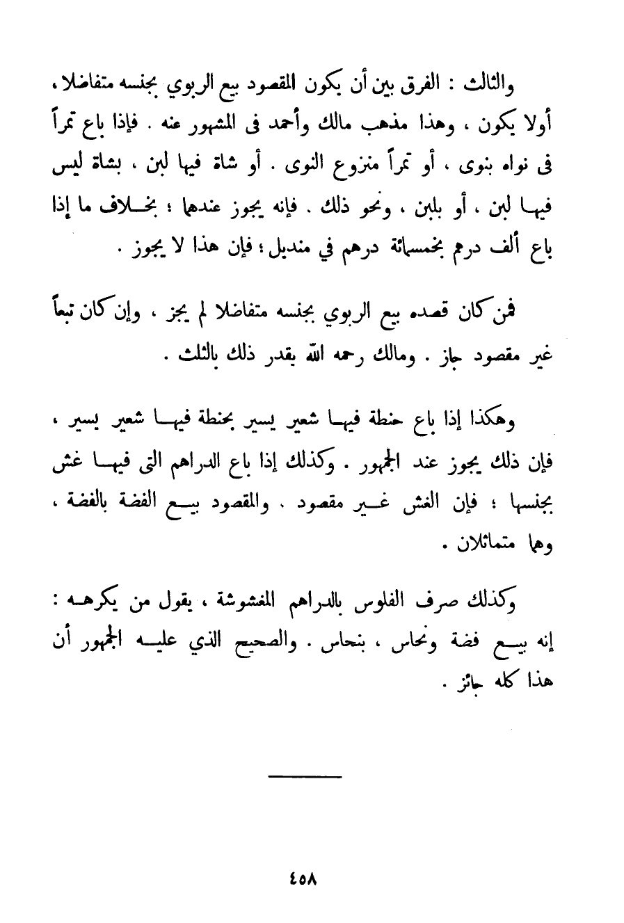 وَالثَّالِثُ: الْفَرْقُ بَيْنَ أَنْ يَكُونَ الْمَقْصُودُ بَيْعَ الرِّبَوِيّ بِجِنْسِهِ مُتَفَاضِلًا أَوْ لَا يَكُونُ وَهَذَا مَذْهَبُ مَالِكٍ وَأَحْمَد فِي الْمَشْهُورِ عَنْهُ. فَإِذَا بَاعَ تَمْرًا فِي نَوَاهٍ بِنَوَى أَوْ تَمْرًا مَنْزُوعَ النَّوَى. أَوْ شَاةً فِيهَا لَبَنٌ بِشَاةٍ لَيْسَ فِيهَا لَبَنٌ أَوْ بِلَبَنِ وَنَحْوِ ذَلِكَ. فَإِنَّهُ يَجُوزُ عِنْدَهُمَا؛ بِخِلَافِ مَا إذَا بَاعَ أَلْفَ دِرْهَمٍ بِخَمْسِمِائَةِ دِرْهَمٍ فِي مِنْدِيلٍ؛ فَإِنَّ هَذَا لَا يَجُوزُ. فَمَنْ كَانَ قَصْدُهُ بَيْعَ الرِّبَوِيِّ بِجِنْسِهِ مُتَفَاضِلًا لَمْ يَجُزْ وَإِنْ كَانَ تَبَعًا غَيْرَ مَقْصُودٍ جَازَ. وَمَالِكٌ رَحِمَهُ اللَّهُ يُقَدِّرُ ذَلِكَ بِالثُّلُثِ. وَهَكَذَا إذَا بَاعَ حِنْطَةً فِيهَا شَعِيرٌ يَسِيرٌ بِحِنْطَةٍ فِيهَا شَعِيرٌ يَسِيرٌ فَإِنَّ ذَلِكَ يَجُوزُ عِنْدَ الْجُمْهُورِ. وَكَذَلِكَ إذَا بَاعَ الدَّرَاهِمَ الَّتِي فِيهَا غِشٌّ بِجِنْسِهَا. فَإِنَّ الْغِشَّ غَيْرَ مَقْصُودٍ وَالْمَقْصُودُ بَيْعُ الْفِضَّةِ بِالْفِضَّةِ وَهُمَا مُتَمَاثِلَانِ. وَكَذَلِكَ صَرْفُ الْفُلُوسِ بِالدَّرَاهِمِ الْمَغْشُوشَةِ يَقُولُ مَنْ يَكْرَهُهُ: إنَّهُ بَيْعُ فِضَّةٍ وَنُحَاسٍ بِنُحَاسِ. وَالصَّحِيحُ الَّذِي عَلَيْهِ الْجُمْهُورُ أَنَّ هَذَا كُلَّهُ جَائِزٌ.