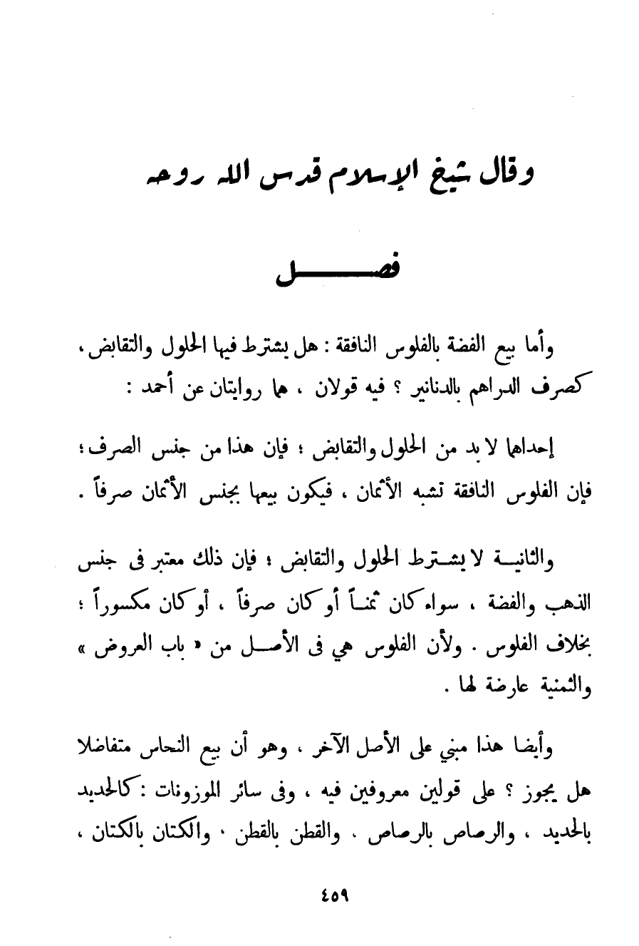 وَأَمَّا بَيْعُ الْفِضَّةِ بِالْفُلُوسِ النَّافِقَةِ: هَلْ يُشْتَرَطُ فِيهَا الْحُلُولُ وَالتَّقَابُضُ كَصَرْفِ الدَّرَاهِمِ بِالدَّنَانِيرِ؟ فِيهِ قَوْلَانِ هُمَا رِوَايَتَانِ عَنْ أَحْمَد: إحْدَاهُمَا لَا بُدَّ مِنْ الْحُلُولِ وَالتَّقَابُضِ؛ فَإِنَّ هَذَا مِنْ جِنْسِ الصَّرْفِ؛ فَإِنَّ الْفُلُوسَ النَّافِقَةَ تُشْبِهُ الْأَثْمَانَ فَيَكُونُ بَيْعُهَا بِجِنْسِ الْأَثْمَانِ صَرْفًا. وَالثَّانِيَةُ لَا يُشْتَرَطُ الْحُلُولُ وَالتَّقَابُضُ فَإِنَّ ذَلِكَ مُعْتَبَرٌ فِي جِنْسِ الذَّهَبِ وَالْفِضَّةِ سَوَاءٌ كَانَ ثَمَنًا أَوْ كَانَ صَرْفًا أَوْ كَانَ مَكْسُورًا؛ بِخِلَافِ الْفُلُوسِ. وَلِأَنَّ الْفُلُوسَ هِيَ فِي الْأَصْلِ مِنْ " بَابِ الْعُرُوضِ " والثمنية عَارِضَةٌ لَهَا. وَأَيْضًا هَذَا مَبْنِيٌّ عَلَى الْأَصْلِ الْآخَرِ وَهُوَ أَنَّ بَيْعَ النُّحَاسِ مُتَفَاضَلًا هَلْ يَجُوزُ؟ عَلَى قَوْلَيْنِ مَعْرُوفَيْنِ فِيهِ وَفِي سَائِرِ الْمَوْزُونَاتِ: كَالْحَدِيدِ بِالْحَدِيدِ وَالرَّصَاصِ بِالرَّصَاصِ وَالْقُطْنِ بِالْقُطْنِ وَالْكَتَّانِ بِالْكَتَّانِ