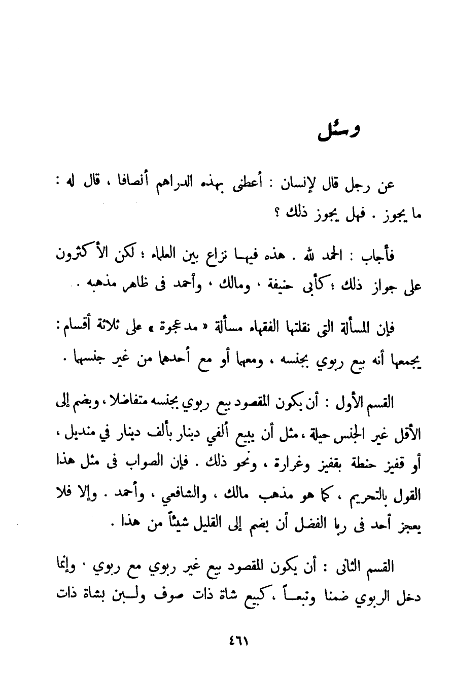 الْحَمْدُ لِلَّهِ، هَذِهِ فِيهَا نِزَاعٌ بَيْنَ الْعُلَمَاءِ؛ لَكِنْ الْأَكْثَرُونَ عَلَى جَوَازِ ذَلِكَ؛ كَأَبِي حَنِيفَةَ وَمَالِكٍ وَأَحْمَد فِي ظَاهِرِ مَذْهَبِهِ. فَإِنَّ الْمَسْأَلَةَ الَّتِي نَقَلَتْهَا الْفُقَهَاءُ مَسْأَلَةُ " مُدِّ عَجْوَةٍ " عَلَى ثَلَاثَةِ أَقْسَامٍ: يَجْمَعُهَا أَنَّهُ بَيْعٌ رِبَوِيٌّ بِجِنْسِهِ وَمَعَهُمَا أَوْ مَعَ أَحَدِهِمَا مِنْ غَيْرِ جِنْسِهِمَا. الْقِسْمُ الْأَوَّلُ: أَنْ يَكُونَ الْمَقْصُودُ بَيْعَ رِبَوِيٍّ بِجِنْسِهِ مُتَفَاضِلًا وَيَضُمُّ إلَى الْأَقَلِّ غَيْرَ الْجِنْسِ حِيلَةً مِثْلُ أَنْ يَبِيعَ أَلْفَيْ دِينَارٍ بِأَلْفِ دِينَارٍ فِي مِنْدِيلٍ أَوْ قَفِيزِ حِنْطَةٍ بِقَفِيزِ وَغِرَارَةٍ وَنَحْوِ ذَلِكَ. فَإِنَّ الصَّوَابَ مِثْلُ هَذَا الْقَوْلِ بِالتَّحْرِيمِ كَمَا هُوَ مَذْهَبُ مَالِكٍ وَالشَّافِعِيِّ وَأَحْمَد. وَإِلَّا فَلَا يَعْجِزُ أَحَدٌ فِي رِبَا الْفَضْلِ أَنْ يَضُمَّ إلَى الْقَلِيلِ شَيْئًا مِنْ هَذَا. الْقِسْمُ الثَّانِي: أَنْ يَكُونَ الْمَقْصُودُ بَيْعَ غَيْرِ رِبَوِيٍّ مَعَ رِبَوِيٍّ وَإِنَّمَا دَخَلَ الرِّبَوِيُّ ضِمْنًا وَتَبَعًا كَبَيْعِ شَاةٍ ذَاتِ صُوفٍ وَلَبَنٍ بِشَاةِ ذَاتِ