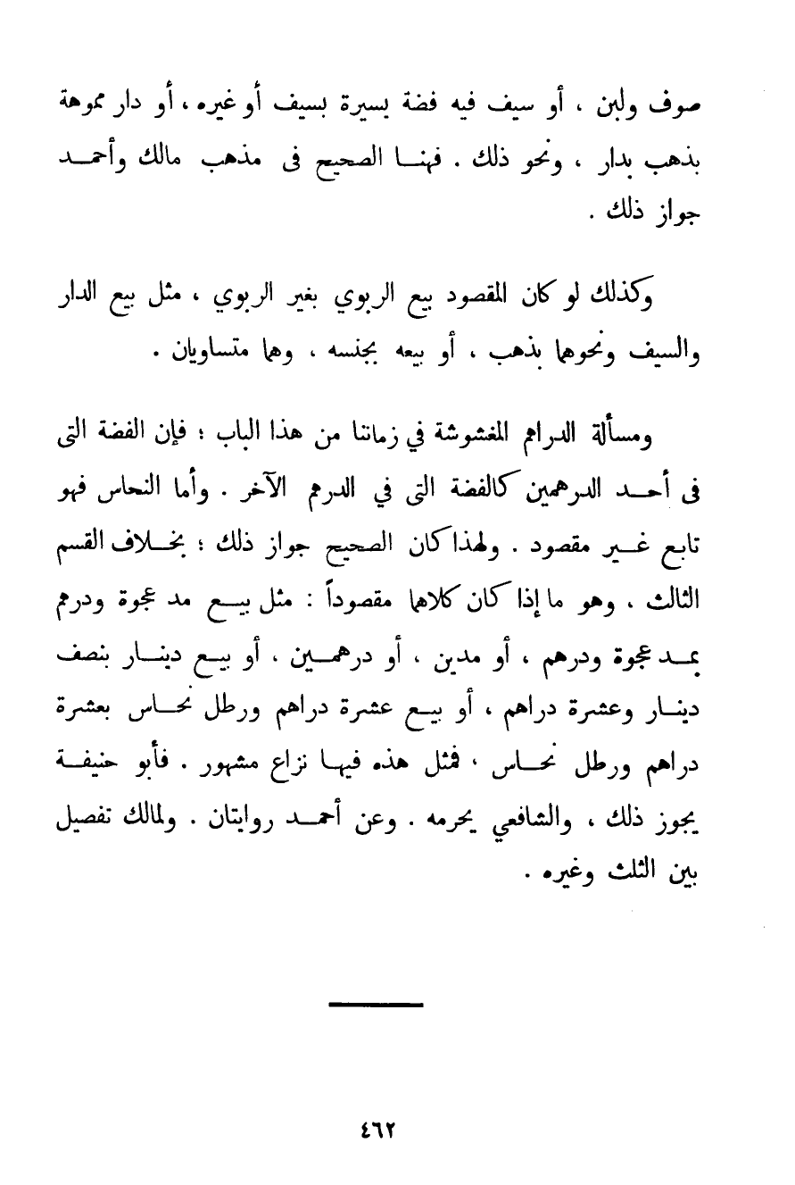 صُوفٍ وَلَبَنٍ أَوْ سَيْفٍ فِيهِ فِضَّةٌ يَسِيرَةٌ بِسَيْفٍ أَوْ غَيْرِهِ أَوْ دَارٍ مُمَوَّهَةٍ بِذَهَبٍ بِدَارٍ وَنَحْوِ ذَلِكَ. فَهُنَا الصَّحِيحُ فِي مَذْهَبِ مَالِكٍ وَأَحْمَد جَوَازُ ذَلِكَ. وَكَذَلِكَ لَوْ كَانَ الْمَقْصُودُ بَيْعَ الرِّبَوِيِّ بِغَيْرِ الرِّبَوِيِّ مِثْلُ بَيْعِ الدَّارِ وَالسَّيْفِ وَنَحْوِهِمَا بِذَهَبِ أَوْ بَيْعِهِ بِجِنْسِهِ وَهُمَا مُتَسَاوِيَانِ. وَمَسْأَلَةُ الدَّرَاهِمِ الْمَغْشُوشَةِ فِي زَمَانِنَا مِنْ هَذَا الْبَابِ؛ فَإِنَّ الْفِضَّةَ الَّتِي فِي أَحَدِ الدِّرْهَمَيْنِ كَالْفِضَّةِ الَّتِي فِي الدِّرْهَمِ الْآخَرِ. وَأَمَّا النُّحَاسُ فَهُوَ تَابِعٌ غَيْرُ مَقْصُودٍ. وَلِهَذَا كَانَ الصَّحِيحُ جَوَازَ ذَلِكَ؛ بِخِلَافِ الْقِسْمِ الثَّالِثِ وَهُوَ مَا إذَا كَانَ كِلَاهُمَا مَقْصُودًا: مِثْلُ بَيْعِ مُدِّ عَجْوَةٍ وَدِرْهَمٍ بِمُدِّ عَجْوَةٍ وَدِرْهَمٍ أَوْ مُدَّيْنِ أَوْ دِرْهَمَيْنِ أَوْ بَيْعِ دِينَارٍ بِنِصْفِ دِينَارٍ وَعَشَرَةِ دَرَاهِمَ أَوْ بَيْعِ عَشَرَةِ دَرَاهِمَ وَرِطْلِ نُحَاسٍ بِعَشَرَةِ دَرَاهِمَ وَرِطْلِ نُحَاسٍ فَمِثْلُ هَذِهِ فِيهَا نِزَاعٌ مَشْهُورٌ. فَأَبُو حَنِيفَةَ يُجَوِّزُ ذَلِكَ وَالشَّافِعِيُّ يُحَرِّمُهُ. وَعَنْ أَحْمَد رِوَايَتَانِ. وَلِمَالِكٍ تَفْصِيلٌ بَيْنَ الثُّلُثِ وَغَيْرِهِ.