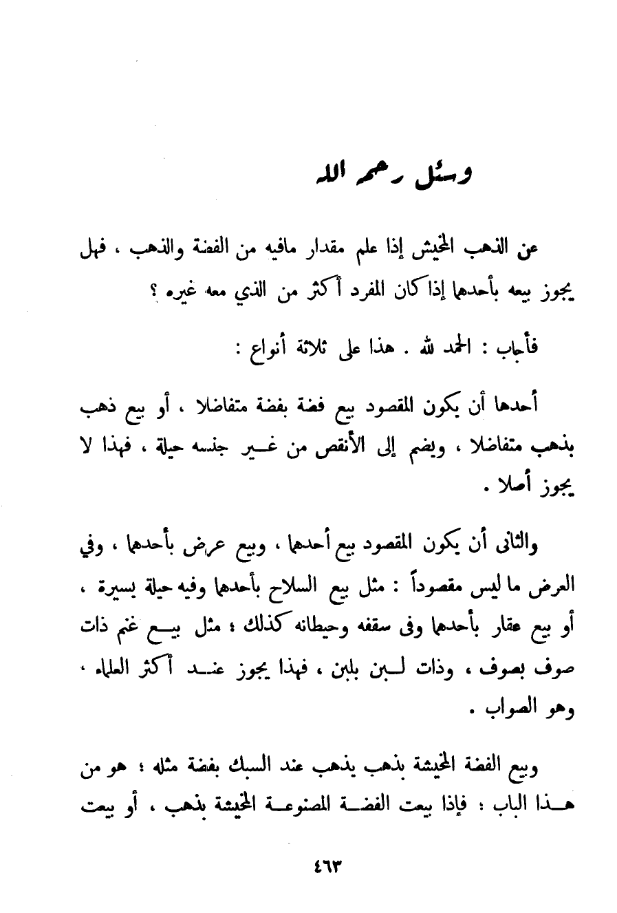 الْحَمْدُ لِلَّهِ، هَذَا عَلَى ثَلَاثَةِ أَنْوَاعٍ: أَحَدُهَا أَنْ يَكُونَ الْمَقْصُودُ بَيْعَ فِضَّةٍ بِفِضَّةِ مُتَفَاضِلًا أَوْ بَيْعُ ذَهَبٍ بِذَهَبِ مُتَفَاضِلًا وَيَضُمُّ إلَى الْأَنْقَصِ مِنْ غَيْرِ جِنْسِهِ حِيلَةً فَهَذَا لَا يَجُوزُ أَصْلًا. وَالثَّانِي أَنْ يَكُونَ الْمَقْصُودُ بَيْعَ أَحَدِهِمَا وَبَيْعَ عَرَضٍ بِأَحَدِهِمَا وَفِي الْعَرَضِ مَا لَيْسَ مَقْصُودًا: مِثْلُ بَيْعِ السِّلَاحِ بِأَحَدِهِمَا وَفِيهِ حِلْيَةٌ يَسِيرَةٌ أَوْ بَيْعُ عَقَارٍ بِأَحَدِهِمَا وَفِي سَقْفِهِ وَحِيطَانِهِ كَذَلِكَ مِثْلُ بَيْعِ غَنَمٍ ذَاتِ صُوفٍ بِصُوفٍ وَذَاتِ لَبَنٍ بِلَبَنِ فَهَذَا يَجُوزُ عِنْدَ أَكْثَرِ الْعُلَمَاءِ وَهُوَ الصَّوَابُ. وَبَيْعُ الْفِضَّةِ الْمُخَيَّشَةِ بِذَهَبٍ يَذْهَبُ عِنْدَ السَّبْكِ بِفِضَّةِ مِثْلِهِ هُوَ مِنْ هَذَا الْبَابِ؛ فَإِذَا بِيعَتْ الْفِضَّةُ الْمَصْنُوعَةُ الْمُخَيَّشَةُ بِذَهَبِ أَوْ بِيعَتْ