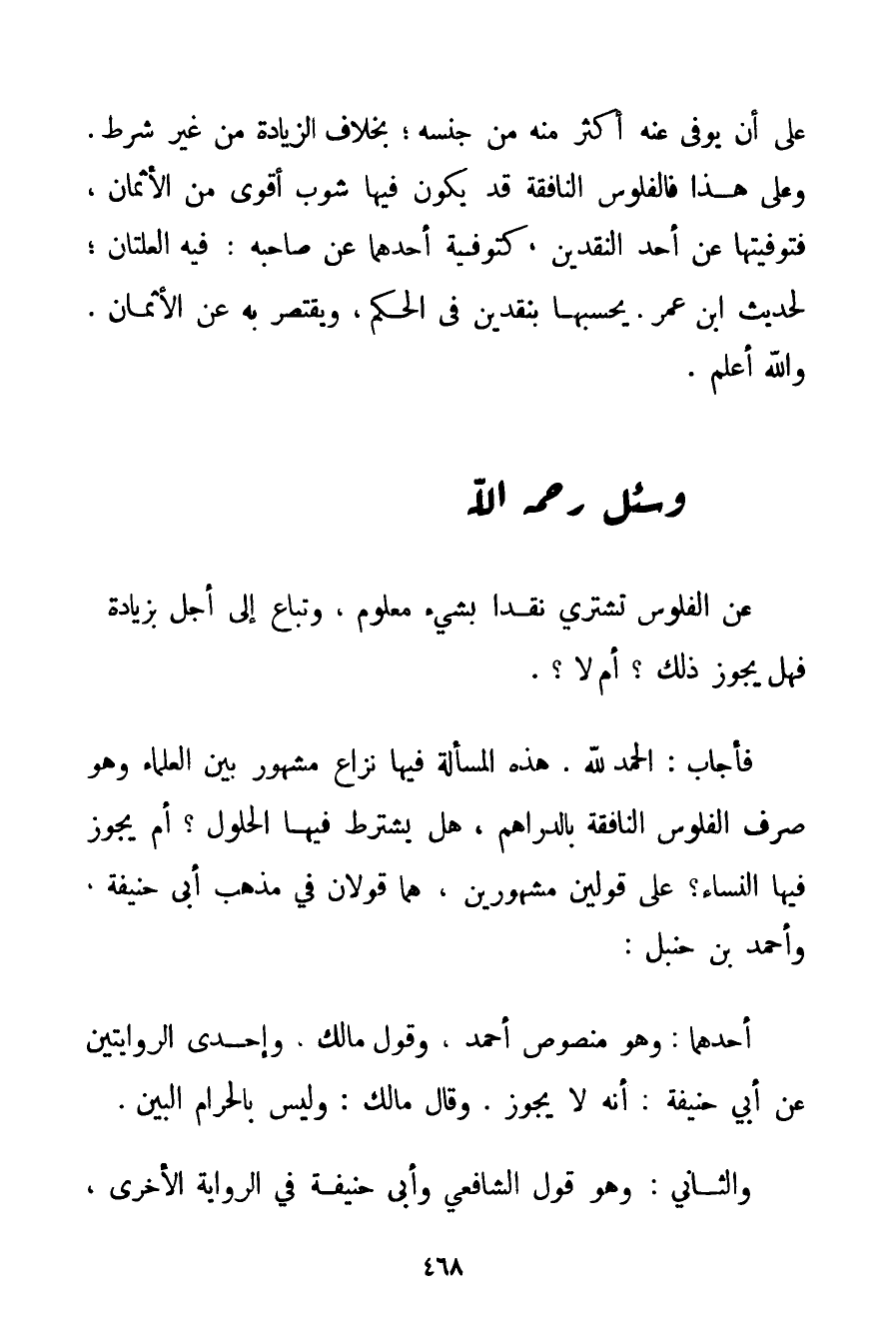 الْحَمْدُ لِلَّهِ، هَذِهِ الْمَسْأَلَةُ فِيهَا نِزَاعٌ مَشْهُورٌ بَيْنَ الْعُلَمَاءِ وَهُوَ صَرْفُ الْفُلُوسِ النَّافِقَةِ بِالدَّرَاهِمِ هَلْ يُشْتَرَطُ فِيهَا الْحُلُولُ؟ أَمْ يَجُوزُ فِيهَا النسأ؟ عَلَى قَوْلَيْنِ مَشْهُورَيْنِ هُمَا قَوْلَانِ فِي مَذْهَبِ أَبِي حَنِيفَةَ وَأَحْمَد بْنِ حَنْبَلٍ: أَحَدُهُمَا: وَهُوَ مَنْصُوصُ أَحْمَد وَقَوْلُ مَالِكٍ وَإِحْدَى الرِّوَايَتَيْنِ عَنْ أَبِي حَنِيفَةَ؛ أَنَّهُ لَا يَجُوزُ. وَقَالَ مَالِكٌ: وَلَيْسَ بِالْحَرَامِ الْبَيِّنِ. وَالثَّانِي: وَهُوَ قَوْلُ الشَّافِعِيِّ وَأَبِي حَنِيفَةَ فِي الرِّوَايَةِ الْأُخْرَى