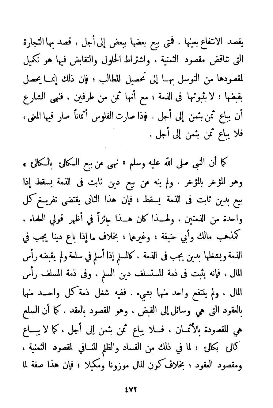 يَقْصِدُ الِانْتِفَاعَ بِعَيْنِهَا. فَمَتَى بِيعَ بَعْضُهَا بِبَعْضٍ إلَى أَجَلٍ قُصِدَ بِهَا التِّجَارَةُ الَّتِي تُنَاقِضُ مَقْصُودَ الثمنية وَاشْتِرَاطُ الْحُلُولِ وَالتَّقَابُضِ فِيهَا هُوَ تَكْمِيلٌ لِمَقْصُودِهَا مِنْ التَّوَسُّلِ بِهَا إلَى تَحْصِيلِ الْمَطَالِبِ؛ فَإِنَّ ذَلِكَ إنَّمَا يَحْصُلُ بِقَبْضِهَا. لَا بِثُبُوتِهَا فِي الذِّمَّةِ؛ مَعَ أَنَّهَا ثَمَنٌ مِنْ طَرَفَيْنِ فَنَهَى الشَّارِعُ أَنْ يُبَاعَ ثَمَنٌ بِثَمَنٍ إلَى أَجَلٍ. فَإِذَا صَارَتْ الْفُلُوسُ أَثْمَانًا صَارَ فِيهَا الْمَعْنَى فَلَا يُبَاعُ ثَمَنٌ بِثَمَنٍ إلَى أَجَلٍ. كَمَا أَنَّ النَّبِيَّ صَلَّى اللَّهُ عَلَيْهِ وَسَلَّمَ {نَهَى عَنْ بَيْعِ الْكَالِئِ بِالْكَالِئِ} وَهُوَ الْمُؤَخَّرُ بِالْمُؤَخَّرِ وَلَمْ يَنْهَ عَنْ بَيْعِ دَيْنٍ ثَابِتٍ فِي الذِّمَّةِ يَسْقُطُ إذَا بِيعَ بِدَيْنٍ ثَابِتٍ فِي الذِّمَّةِ يَسْقُطُ؛ فَإِنَّ هَذَا الثَّانِيَ يَقْتَضِي تَفْرِيغَ كُلِّ وَاحِدَةٍ مِنْ الذِّمَّتَيْنِ وَلِهَذَا كَانَ هَذَا جَائِزًا فِي أَظْهَرِ قَوْلَيْ الْعُلَمَاءِ كَمَذْهَبِ مَالِكٍ وَأَبِي حَنِيفَةَ؛ وَغَيْرِهِمَا؛ بِخِلَافِ مَا إذَا بَاعَ دَيْنًا يَجِبُ فِي الذِّمَّةِ وَيَشْغَلُهَا بِدَيْنِ يَجِبُ فِي الذِّمَّةِ كَالْمُسْلِمِ إذَا أَسْلَمَ فِي سِلْعَةٍ وَلَمْ يُقْبِضْهُ رَأْسَ الْمَالِ فَإِنَّهُ يُثْبِتُ فِي ذِمَّةِ الْمُسْتَسْلِفِ دَيْنَ السَّلَمِ وَفِي ذِمَّةِ الْمُسْلِفِ رَأْسَ الْمَالِ وَلَمْ يَنْتَفِعْ وَاحِدٌ مِنْهُمَا بِشَيْءِ. فَفِيهِ شَغْلُ ذِمَّةِ كُلِّ وَاحِدٍ مِنْهُمَا بِالْعُقُودِ الَّتِي هِيَ وَسَائِلُ إلَى الْقَبْضِ وَهُوَ الْمَقْصُودُ بِالْعَقْدِ. كَمَا أَنَّ السِّلَعَ هِيَ الْمَقْصُودَةُ بِالْأَثْمَانِ فَلَا يُبَاعُ ثَمَنٌ بِثَمَنٍ إلَى أَجَلٍ كَمَا لَا يُبَاعُ كَالِئٌ بِكَالِئِ؛ لِمَا فِي ذَلِكَ مِنْ الْفَسَادِ وَالظُّلْمِ الْمُنَافِي لِمَقْصُودِ الثمنية وَمَقْصُودِ الْعُقُودِ؛ بِخِلَافِ كَوْنِ الْمَالِ مَوْزُونًا وَمَكِيلًا؛ فَإِنَّ هَذَا صِفَةٌ لِمَا