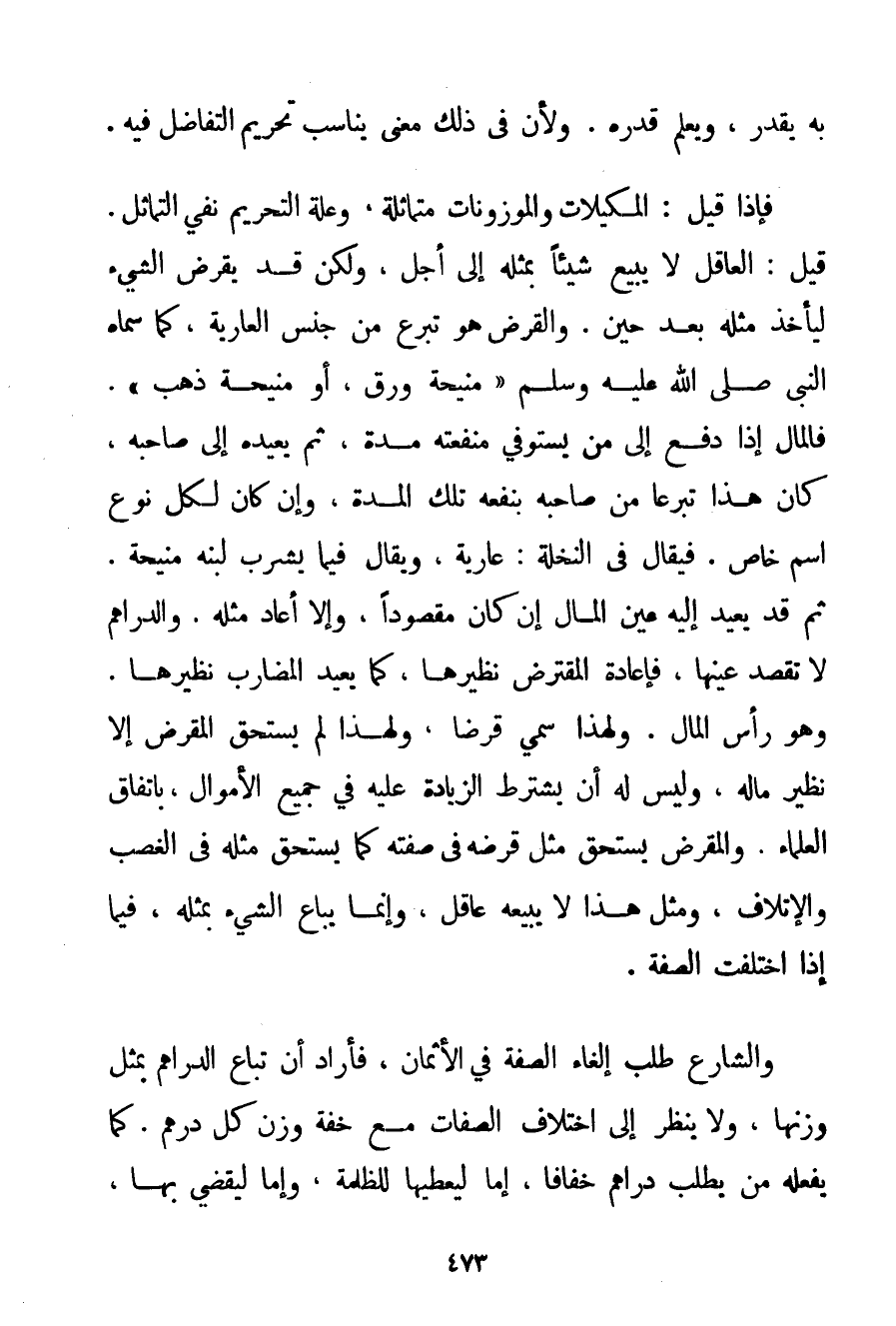 بِهِ يُقَدَّرُ وَيُعْلَمُ قَدْرُهُ. وَلِأَنَّ فِي ذَلِكَ مَعْنًى يُنَاسِبُ تَحْرِيمَ التَّفَاضُلِ فِيهِ. فَإِذَا قِيلَ: الْمَكِيلَاتُ وَالْمَوْزُونَاتُ مُتَمَاثِلَةٌ وَعِلَّةُ التَّحْرِيمِ نَفْيُ التَّمَاثُلِ. قِيلَ: الْعَاقِلُ لَا يَبِيعُ شَيْئًا بِمِثْلِهِ إلَى أَجَلٍ وَلَكِنْ قَدْ يَقْرِضُ الشَّيْءَ. لِيَأْخُذَ مِثْلَهُ بَعْدَ حِينٍ. وَالْقَرْضُ هُوَ تَبَرُّعٌ مِنْ جِنْسِ الْعَارِيَةِ كَمَا سَمَّاهُ النَّبِيُّ صَلَّى اللَّهُ عَلَيْهِ وَسَلَّمَ {مَنِيحَةُ وَرِقٍ أَوْ مَنِيحَةُ ذَهَبٍ} . فَالْمَالُ إذَا دُفِعَ إلَى مَنْ يَسْتَوْفِي مَنْفَعَتَهُ مُدَّةً ثُمَّ يُعِيدُهُ إلَى صَاحِبِهِ كَانَ هَذَا تَبَرُّعًا مِنْ صَاحِبِهِ بِنَفْعِهِ تِلْكَ الْمُدَّةِ وَإِنْ كَانَ لِكُلِّ نَوْعٍ اسْمٌ خَاصٌّ. فَيُقَالُ فِي النَّخْلَةِ: عَارِيَةٌ وَيُقَالُ فِيمَا يُشْرَبُ لَبَنُهُ مَنِيحَةً. ثُمَّ قَدْ يُعِيدُ إلَيْهِ عَيْنَ الْمَالِ إنْ كَانَ مَقْصُودًا وَإِلَّا أَعَادَ مِثْلَهُ. وَالدَّرَاهِمُ لَا تُقْصَدُ عَيْنُهَا فَإِعَادَةُ الْمُقْتَرِضِ نَظِيرَهَا كَمَا يُعِيدُ الْمُضَارِبُ نَظِيرَهَا. وَهُوَ رَأْسُ الْمَالِ. وَلِهَذَا سُمِّيَ قَرْضًا وَلِهَذَا لَمْ يَسْتَحِقَّ الْمُقْرِضُ إلَّا نَظِيرَ مَالِهِ وَلَيْسَ لَهُ أَنْ يَشْتَرِطَ الزِّيَادَةَ عَلَيْهِ فِي جَمِيعِ الْأَمْوَالِ بِاتِّفَاقِ الْعُلَمَاءِ. وَالْمُقْرِضُ يَسْتَحِقُّ مِثْلَ قَرْضِهِ فِي صِفَتِهِ كَمَا يَسْتَحِقُّ مِثْلَهُ فِي الْغَصْبِ وَالْإِتْلَافِ وَمِثْلُ هَذَا لَا يَبِيعُهُ عَاقِلٌ وَإِنَّمَا يُبَاعُ الشَّيْءُ بِمِثْلِهِ فِيمَا إذَا اخْتَلَفَتْ الصِّفَةُ. وَالشَّارِعُ طَلَبَ إلْغَاءَ الصِّفَةِ فِي الْأَثْمَانِ فَأَرَادَ أَنْ تُبَاعَ الدَّرَاهِمُ بِمِثْلِ وَزْنِهَا وَلَا يُنْظَرُ إلَى اخْتِلَافِ الصِّفَاتِ مَعَ خِفَّةِ وَزْنِ كُلِّ دِرْهَمٍ. كَمَا يَفْعَلُهُ مَنْ يَطْلُبُ دَرَاهِمَ خِفَافًا إمَّا لِيُعْطِيَهَا لِلظُّلْمَةِ وَإِمَّا لِيَقْضِيَ بِهَا