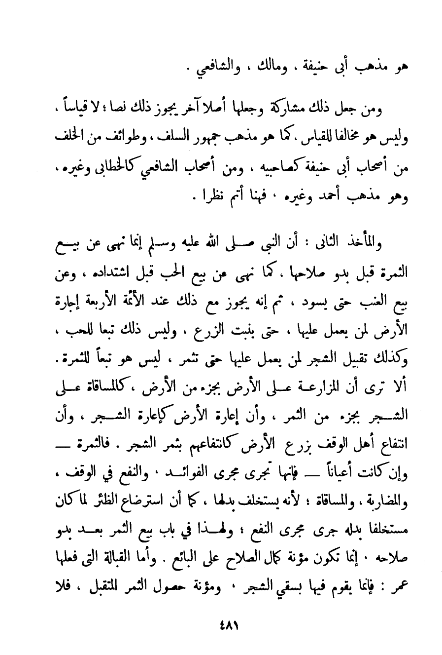 هُوَ مَذْهَبُ أَبِي حَنِيفَةَ وَمَالِكٍ وَالشَّافِعِيِّ. وَمَنْ جَعَلَ ذَلِكَ مُشَارَكَةً وَجَعَلَهَا أَصْلًا آخَرَ يَجُوزُ ذَلِكَ نَصًّا؛ لَا قِيَاسًا وَلَيْسَ هُوَ مُخَالِفًا لِلْقِيَاسِ كَمَا هُوَ مَذْهَبُ جُمْهُورِ السَّلَفِ وَطَوَائِفَ مِنْ الْخَلَفِ مِنْ أَصْحَابِ أَبِي حَنِيفَةَ كَصَاحِبَيْهِ وَمِنْ أَصْحَابِ الشَّافِعِيِّ كالخطابي وَغَيْرِهِ وَهُوَ مَذْهَبُ أَحْمَد وَغَيْرِهِ فَهُنَا أَتَمُّ نَظَرًا. وَالْمَأْخَذُ الثَّانِي: أَنَّ النَّبِيَّ صَلَّى اللَّهُ عَلَيْهِ وَسَلَّمَ إنَّمَا نَهَى عَنْ بَيْعِ الثَّمَرَةِ قَبْلَ بُدُوِّ صَلَاحِهَا كَمَا نَهَى عَنْ بَيْعِ الْحَبِّ قَبْلَ اشْتِدَادِهِ وَعَنْ بَيْعِ الْعِنَبِ حَتَّى يَسْوَدَّ ثُمَّ إنَّهُ يَجُوزُ مَعَ ذَلِكَ عِنْدَ الْأَئِمَّةِ الْأَرْبَعَةِ إجَارَةُ الْأَرْضِ لِمَنْ يَعْمَلُ عَلَيْهَا حَتَّى يَنْبُتَ الزَّرْعُ وَلَيْسَ ذَلِكَ تَبَعًا لِلْحَبِّ وَكَذَلِكَ تَقْبِيلُ الشَّجَرِ لِمَنْ يَعْمَلُ عَلَيْهَا حَتَّى تُثْمِرَ لَيْسَ هُوَ تَبَعًا لِلثَّمَرَةِ. أَلَا تَرَى أَنَّ الْمُزَارَعَةَ عَلَى الْأَرْضِ بِجُزْءٍ مِنْ الْأَرْضِ كَالْمُسَاقَاةِ عَلَى الشَّجَرِ بِجُزْءٍ مِنْ الثَّمَرِ وَأَنَّ إعَارَةَ الْأَرْضِ كَإِعَارَةِ الشَّجَرِ وَأَنَّ انْتِفَاعَ أَهْلِ الْوَقْفِ بِزَرْعِ الْأَرْضِ كَانْتِفَاعِهِمْ بِثَمَرِ الشَّجَرِ، فَالثَّمَرَةُ - وَإِنْ كَانَتْ أَعْيَانًا - فَإِنَّهَا تَجْرِي مَجْرَى الْفَوَائِدِ وَالنَّفْعِ فِي الْوَقْفِ وَالْمُضَارَبَةِ وَالْمُسَاقَاةِ؛ لِأَنَّهُ يَسْتَخْلِفُ بَدَلَهَا كَمَا أَنَّ اسْتِرْضَاعَ الظِّئْرِ لَمَّا كَانَ مُسْتَخْلَفًا بَدَلُهُ جَرَى مَجْرَى النَّفْعِ؛ وَلِهَذَا فِي بَابِ بَيْعِ الثَّمَرِ بَعْدَ بُدُوِّ صَلَاحِهِ إنَّمَا تَكُونُ مُؤْنَةُ كَمَالِ الصَّلَاحِ عَلَى الْبَائِعِ. وَأَمَّا الْقُبَالَةُ الَّتِي فَعَلَهَا عُمَرُ: فَإِنَّمَا يَقُومُ فِيهَا بِسَقْيِ الشَّجَرِ وَمُؤْنَةِ حُصُولِ الثَّمَرِ الْمُتَقَبَّلِ فَلَا