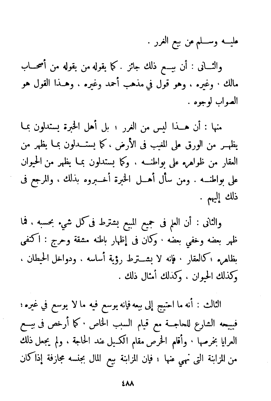 عَنْ بَيْعِ الْغَرَرِ. وَالثَّانِي: أَنَّ بَيْعَ ذَلِكَ جَائِزٌ، كَمَا يَقُولُهُ مَنْ يَقُولُهُ مِنْ أَصْحَابِ مَالِكٍ وَغَيْرِهِ وَهُوَ قَوْلٌ فِي مَذْهَبِ أَحْمَد وَغَيْرِهِ وَهَذَا الْقَوْلُ هُوَ الصَّوَابُ لِوُجُوهِ. مِنْهَا: أَنَّ هَذَا لَيْسَ مِنْ الْغَرَرِ؛ بَلْ أَهْلُ الْخِبْرَةِ يَسْتَدِلُّونَ بِمَا يَظْهَرُ مِنْ الْوَرِقِ عَلَى الْمُغَيَّبِ فِي الْأَرْضِ كَمَا يَسْتَدِلُّونَ بِمَا يَظْهَرُ مِنْ الْعَقَارِ مِنْ ظَوَاهِرِهِ عَلَى بَوَاطِنِهِ وَكَمَا يَسْتَدِلُّونَ بِمَا يَظْهَرُ مِنْ الْحَيَوَانِ عَلَى بَوَاطِنِهِ. وَمَنْ سَأَلَ أَهْلَ الْخِبْرَةِ أَخْبَرُوهُ بِذَلِكَ وَالْمَرْجِعُ فِي ذَلِكَ إلَيْهِمْ. وَالثَّانِي: أَنَّ الْعِلْمَ فِي جَمِيعِ الْمَبِيعِ يُشْتَرَطُ فِي كُلِّ شَيْءٍ بِحَسْبِهِ فَمَا ظَهَرَ بَعْضُهُ وَخَفِيَ بَعْضُهُ وَكَانَ فِي إظْهَارِ بَاطِنِهِ مَشَقَّةٌ وَحَرَجٌ: اُكْتُفِيَ بِظَاهِرِهِ؛ كَالْعَقَارِ فَإِنَّهُ لَا يُشْتَرَطُ رُؤْيَةُ أَسَاسِهِ وَدَوَاخِلُ الْحِيطَانِ وَكَذَلِكَ الْحَيَوَانُ وَكَذَلِكَ أَمْثَالُ ذَلِكَ. الثَّالِثُ: أَنَّهُ مَا اُحْتِيجَ إلَى بَيْعِهِ فَإِنَّهُ يُوَسَّعُ فِيهِ مَا لَا يُوَسَّعُ فِي غَيْرِهِ؛ فَيُبِيحُهُ الشَّارِعُ لِلْحَاجَةِ مَعَ قِيَامِ السَّبَبِ الْخَاصِّ كَمَا أَرْخَصَ فِي بَيْعِ الْعَرَايَا بِخَرْصِهَا وَأَقَامَ الْخَرْصَ مَقَامَ الْكَيْلِ عِنْدَ الْحَاجَةِ وَلَمْ يُجْعَلْ ذَلِكَ مِنْ الْمُزَابَنَةِ الَّتِي نُهِيَ عَنْهَا: فَإِنَّ الْمُزَابَنَةَ بَيْعُ الْمَالِ بِجِنْسِهِ مُجَازَفَةً إذَا كَانَ