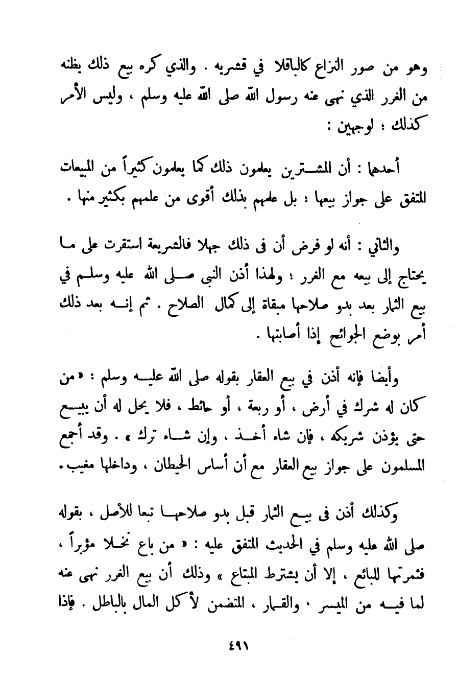 وَهُوَ مِنْ صُوَرِ النِّزَاعِ كالباقلا فِي قشريه. وَاَلَّذِي كَرِهَ بَيْعَ ذَلِكَ يَظُنُّهُ مِنْ الْغَرَرِ الَّذِي نَهَى عَنْهُ رَسُولُ اللَّهِ صَلَّى اللَّهُ عَلَيْهِ وَسَلَّمَ وَلَيْسَ الْأَمْرُ كَذَلِكَ؛ لِوَجْهَيْنِ: أَحَدُهُمَا: أَنَّ الْمُشْتَرِينَ يَعْلَمُونَ ذَلِكَ كَمَا يَعْلَمُونَ كَثِيرًا مِنْ الْمَبِيعَاتِ الْمُتَّفَقِ عَلَى جَوَازِ بَيْعِهَا؛ بَلْ عِلْمُهُمْ بِذَلِكَ أَقْوَى مِنْ عِلْمِهِمْ بِكَثِيرٍ مِنْهَا. وَالثَّانِي: أَنَّهُ لَوْ فُرِضَ أَنَّ فِي ذَلِكَ جَهْلًا فَالشَّرِيعَةُ اسْتَقَرَّتْ عَلَى مَا يَحْتَاجُ إلَى بَيْعِهِ مَعَ الْغَرَرِ؛ وَلِهَذَا أَذِنَ النَّبِيُّ صَلَّى اللَّهُ عَلَيْهِ وَسَلَّمَ فِي بَيْعِ الثِّمَارِ بَعْدَ بُدُوِّ صَلَاحِهَا مُبْقَاةً إلَى كَمَالِ الصَّلَاحِ. ثُمَّ إنَّهُ بَعْدَ ذَلِكَ أَمَرَ بِوَضْعِ الْجَوَائِحِ إذَا أَصَابَتْهَا. وَأَيْضًا فَإِنَّهُ أَذِنَ فِي بَيْعِ الْعَقَارِ بِقَوْلِهِ صَلَّى اللَّهُ عَلَيْهِ وَسَلَّمَ {مَنْ كَانَ لَهُ شِرْكٌ فِي أَرْضٍ أَوْ رِبْعَةٍ أَوْ حَائِطٍ فَلَا يَحِلُّ لَهُ أَنْ يَبِيعَ حَتَّى يُؤْذِنَ شَرِيكَهُ فَإِنْ شَاءَ أَخَذَ وَإِنْ شَاءَ تَرَكَ} . وَقَدْ أَجْمَعَ الْمُسْلِمُونَ عَلَى جَوَازِ بَيْعِ الْعَقَارِ مَعَ أَنَّ أَسَاسَ الْحِيطَانِ وَدَاخِلَهَا مُغَيَّبٌ. وَكَذَلِكَ أَذِنَ فِي بَيْعِ الثِّمَارِ قَبْلَ بُدُوِّ صَلَاحِهَا تَبَعًا لِلْأَصْلِ بِقَوْلِهِ صَلَّى اللَّهُ عَلَيْهِ وَسَلَّمَ فِي الْحَدِيثِ الْمُتَّفَقِ عَلَيْهِ: {مَنْ بَاعَ نَخْلًا مُؤَبَّرًا فَثَمَرَتُهَا لِلْبَائِعِ إلَّا أَنْ يَشْتَرِطَ الْمُبْتَاعُ} وَذَلِكَ أَنَّ بَيْعَ الْغَرَرِ نَهَى عَنْهُ لِمَا فِيهِ مِنْ الْمَيْسِرِ وَالْقِمَارِ الْمُتَضَمِّنِ لِأَكْلِ الْمَالِ بِالْبَاطِلِ. فَإِذَا
