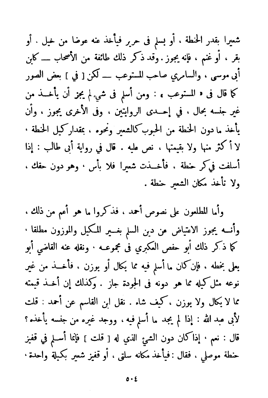 شَعِيرًا بِقَدْرِ الْحِنْطَةِ أَوْ يُسْلِمَ فِي حَرِيرٍ فَيَأْخُذَ عَنْهُ عِوَضًا مِنْ خَيْلٍ، أَوْ بَقَرٍ أَوْ غَنَمٍ فَإِنَّهُ يَجُوزُ. وَقَدْ ذَكَرَ ذَلِكَ طَائِفَةٌ مِنْ الْأَصْحَابِ - كَابْنِ أَبِي مُوسَى والسامري صَاحِبِ الْمُسْتَوْعِب - لَكِنْ فِي بَعْضِ الصُّوَرِ كَمَا قَالَ فِي " الْمُسْتَوْعِبِ ": وَمَنْ أَسْلَمَ فِي شَيْءٍ لَمْ يَجُزْ أَنْ يَأْخُذَ مِنْ غَيْرِ جِنْسِهِ بِحَالِ فِي إحْدَى الرِّوَايَتَيْنِ وَفِي الْأُخْرَى يَجُوزُ وَأَنْ يَأْخُذَ مَا دُونَ الْحِنْطَةِ مِنْ الْحُبُوبِ كَالشَّعِيرِ وَنَحْوِهِ بِمِقْدَارِ كَيْلِ الْحِنْطَةِ لَا أَكْثَرَ مِنْهَا وَلَا بِقِيمَتِهَا نَصَّ عَلَيْهِ. قَالَ فِي رِوَايَةِ أَبِي طَالِبٍ: إذَا أَسْلَفْت فِي كُرِّ حِنْطَةٍ فَأَخَذْت شَعِيرًا فَلَا بَأْسَ وَهُوَ دُونَ حَقِّك وَلَا تَأْخُذْ مَكَانَ الشَّعِيرِ حِنْطَةً. وَأَمَّا الْمُطَّلِعُونَ عَلَى نُصُوصِ أَحْمَد فَذَكَرُوا مَا هُوَ أَعَمُّ مِنْ ذَلِكَ وَأَنَّهُ يَجُوزُ الِاعْتِيَاضُ عَنْ دَيْنِ السَّلَمِ بِغَيْرِ الْمَكِيلِ وَالْمَوْزُونِ مُطْلَقًا كَمَا ذَكَرَ ذَلِكَ أَبُو حَفْصٍ العكبري فِي مَجْمُوعِهِ وَنَقَلَهُ عَنْهُ الْقَاضِي أَبُو يَعْلَى بِخَطِّهِ فَإِنْ كَانَ مَا أَسْلَمَ فِيهِ مِمَّا يُكَالُ أَوْ يُوزَنُ فَأَخَذَ مِنْ غَيْرِ نَوْعِهِ مِثْلَ كَيْلِهِ مِمَّا هُوَ دُونَهُ فِي الْجَوْدَةِ جَازَ. وَكَذَلِكَ إنْ أَخَذَ قِيمَتَهُ مِمَّا لَا يُكَالُ وَلَا يُوزَنُ كَيْفَ شَاءَ. نَقَلَ ابْنُ الْقَاسِمِ عَنْ أَحْمَد: قُلْت لِأَبِي عَبْدِ اللَّهِ: إذَا لَمْ يَجِدْ مَا أَسْلَمَ فِيهِ وَوَجَدَ غَيْرَهُ مِنْ جِنْسِهِ يَأْخُذُهُ؟ قَالَ: نَعَمْ إذَا كَانَ دُونَ الشَّيْءِ الَّذِي لَهُ قُلْت فَإِنَّمَا أَسْلَمَ فِي قَفِيزِ حِنْطَةٍ موصلي فَقَالَ: فَيَأْخُذُ مَكَانَهُ سُلْتَيْ أَوْ قَفِيزَ شَعِيرٍ بِكَيْلَةٍ وَاحِدَةٍ