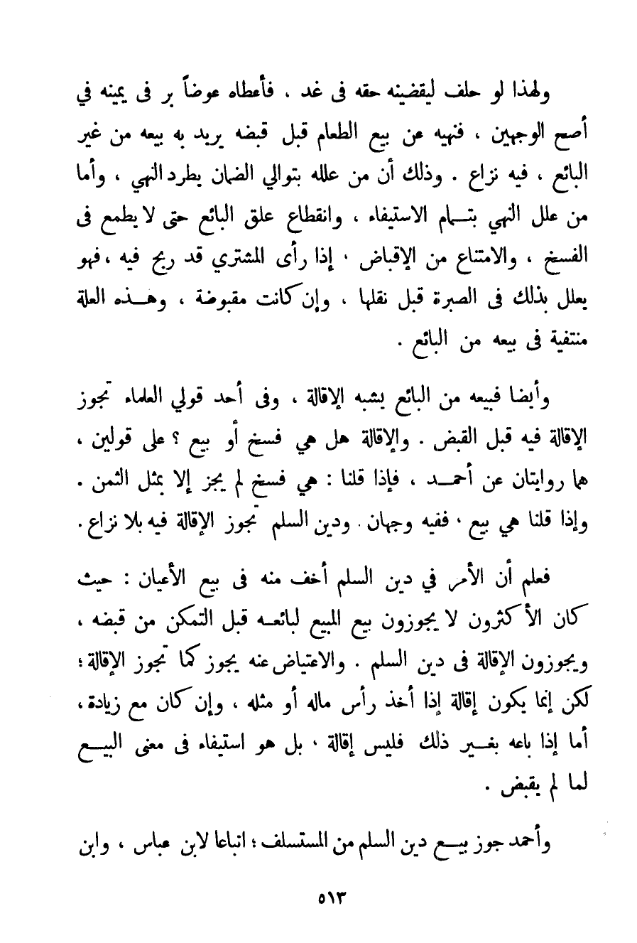 وَلِهَذَا لَوْ حَلَفَ لَيَقْضِيَنَّهُ حَقَّهُ فِي غَد فَأَعْطَاهُ عِوَضًا بَرَّ فِي يَمِينِهِ فِي أَصَحِّ الْوَجْهَيْنِ فَنَهْيُهُ عَنْ بَيْعِ الطَّعَامِ قَبْلَ قَبْضِهِ يُرِيدُ بِهِ بَيْعَهُ مِنْ غَيْرِ الْبَائِعِ فِيهِ نِزَاعٌ. وَذَلِكَ أَنَّ مَنْ عَلَّلَهُ بِتَوَالِي الضَّمَانِ يَطْرُدُ النَّهْيَ وَأَمَّا مَنْ عَلَّلَ النَّهْيَ بِتَمَامِ الِاسْتِيفَاءِ وَانْقِطَاعٍ عَلَّقَ الْبَائِعَ حَتَّى لَا يَطْمَعَ فِي الْفَسْخِ وَالِامْتِنَاعِ مِنْ الْإِقْبَاضِ إذَا رَأَى الْمُشْتَرِيَ قَدْ رَبِحَ فِيهِ فَهُوَ يُعَلِّلُ بِذَلِكَ فِي الصُّبْرَةِ قَبْلَ نَقْلِهَا وَإِنْ كَانَتْ مَقْبُوضَةً وَهَذِهِ الْعِلَّةُ مُنْتَفِيَةٌ فِي بَيْعِهِ مِنْ الْبَائِعِ. وَأَيْضًا فَبَيْعُهُ مِنْ الْبَائِعِ يُشْبِهُ الْإِقَالَةَ وَفِي أَحَدِ قَوْلَيْ الْعُلَمَاءِ تَجُوزُ الْإِقَالَةُ فِيهِ قَبْلَ الْقَبْضِ. وَالْإِقَالَةُ هَلْ هِيَ فَسْخٌ أَوْ بَيْعٌ؟ عَلَى قَوْلَيْنِ هُمَا رِوَايَتَانِ عَنْ أَحْمَد فَإِذَا قُلْنَا: هِيَ فَسْخٌ لَمْ يَجُزْ إلَّا بِمِثْلِ الثَّمَنِ. وَإِذَا قُلْنَا هِيَ بَيْعٌ فَفِيهِ وَجْهَانِ وَدَيْنُ السَّلَمِ تَجُوزُ الْإِقَالَةُ فِيهِ بِلَا نِزَاعٍ. فَعُلِمَ أَنَّ الْأَمْرَ فِي دَيْنِ السَّلَمِ أَخَفُّ مِنْهُ فِي بَيْعِ الْأَعْيَانِ: حَيْثُ كَانَ الْأَكْثَرُونَ لَا يُجَوِّزُونَ بَيْعَ الْمَبِيعِ لِبَائِعِهِ قَبْلَ التَّمَكُّنِ مِنْ قَبْضِهِ وَيُجَوِّزُونَ الْإِقَالَةَ فِي دَيْنِ السَّلَمِ. وَالِاعْتِيَاضُ عَنْهُ يَجُوزُ كَمَا تَجُوزُ الْإِقَالَةُ؛ لَكِنْ إنَّمَا يَكُونُ إقَالَةً إذَا أَخَذَ رَأْسَ مَالِهِ أَوْ مِثْلَهُ وَإِنْ كَانَ مَعَ زِيَادَةٍ أَمَّا إذَا بَاعَهُ بِغَيْرِ ذَلِكَ فَلَيْسَ إقَالَةً بَلْ هُوَ اسْتِيفَاءٌ فِي مَعْنَى الْبَيْعِ لِمَا لَمْ يُقْبَضْ. وَأَحْمَد جَوَّزَ بَيْعَ دَيْنِ السَّلَمِ مِنْ الْمُسْتَسْلِفِ؛ اتِّبَاعًا لِابْنِ عَبَّاسٍ وَابْنُ