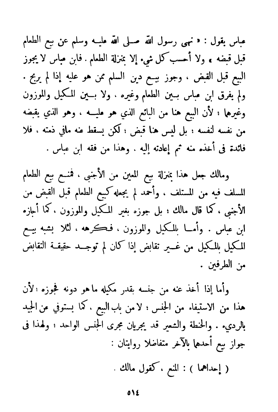 عَبَّاسٍ يَقُولُ: {نَهَى رَسُولُ اللَّهِ صَلَّى اللَّهُ عَلَيْهِ وَسَلَّمَ عَنْ بَيْعِ الطَّعَامِ قَبْلَ قَبْضِهِ} وَلَا أَحْسِبُ كُلَّ شَيْءٍ إلَّا بِمَنْزِلَةِ الطَّعَامِ، فَابْنُ عَبَّاسٍ لَا يُجَوِّزُ الْبَيْعَ قَبْلَ الْقَبْضِ وَجَوَّزَ بَيْعَ دَيْنِ السَّلَمِ مِمَّنْ هُوَ عَلَيْهِ إذَا لَمْ يَرْبَحْ، وَلَمْ يُفَرِّقْ ابْنُ عَبَّاسٍ بَيْنَ الطَّعَامِ وَغَيْرِهِ وَلَا بَيْنَ الْمَكِيل وَالْمَوْزُونِ وَغَيْرِهِمَا؛ لِأَنَّ الْبَيْعَ هُنَا مِنْ الْبَائِعِ الَّذِي هُوَ عَلَيْهِ وَهُوَ الَّذِي يَقْبِضُهُ مِنْ نَفْسِهِ لِنَفْسِهِ؛ بَلْ لَيْسَ هُنَا قَبْضٌ؛ لَكِنْ يَسْقُطُ عَنْهُ مَا فِي ذِمَّتِهِ فَلَا فَائِدَةَ فِي أَخْذِهِ مِنْهُ ثُمَّ إعَادَتُهُ إلَيْهِ وَهَذَا مِنْ فِقْهِ ابْنِ عَبَّاسٍ. وَمَالِكٌ جَعَلَ هَذَا بِمَنْزِلَةِ بَيْعِ الْمُعَيَّنِ مِنْ الْأَجْنَبِيِّ فَمَنَعَ بَيْعَ الطَّعَامِ الْمُسْلَفِ فِيهِ مِنْ الْمُسْتَلِفِ وَأَحْمَد لَمْ يَجْعَلْهُ كَبَيْعِ الطَّعَامِ قَبْلَ الْقَبْضِ مِنْ الْأَجْنَبِيِّ كَمَا قَالَ مَالِكٌ؛ بَلْ جَوَّزَهُ بِغَيْرِ الْمَكِيل وَالْمَوْزُونِ كَمَا أَجَازَهُ ابْنُ عَبَّاسٍ. وَأَمَّا بِالْمَكِيلِ وَالْمَوْزُونِ فَكَرِهَهُ لِئَلَّا يُشْبِهَ بَيْعَ الْمَكِيل بِالْمَكِيلِ مِنْ غَيْرِ تَقَابُضٍ إذَا كَانَ لَمْ تُوجَدْ حَقِيقَةُ التَّقَابُضِ مِنْ الطَّرَفَيْنِ. وَأَمَّا إذَا أَخَذَ عَنْهُ مِنْ جِنْسِهِ بِقَدْرِ مَكِيلِهِ مَا هُوَ دُونَهُ فَجَوَّزَهُ؛ لِأَنَّ هَذَا مِنْ الِاسْتِيفَاءِ مِنْ الْجِنْسِ؛ لَا مِنْ بَابِ الْبَيْعِ كَمَا يَسْتَوْفِي عَنْ الْجَيِّدِ بِالرَّدِيءِ. وَالْحِنْطَةُ وَالشَّعِيرُ قَدْ يَجْرِيَانِ مَجْرَى الْجِنْسِ الْوَاحِدِ؛ وَلِهَذَا فِي جَوَازِ بَيْعِ أَحَدِهِمَا بِالْآخَرِ مُتَفَاضِلًا رِوَايَتَانِ:
