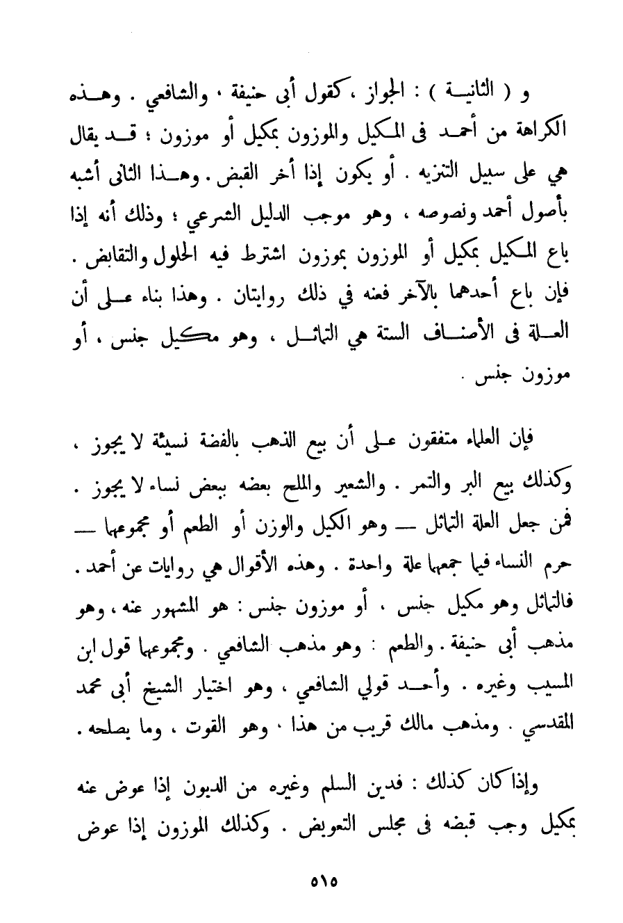 وَالثَّانِيَةُ: الْجَوَازُ كَقَوْلِ أَبِي حَنِيفَةَ وَالشَّافِعِيِّ، وَهَذِهِ الْكَرَاهَةُ مِنْ أَحْمَد فِي الْمَكِيل وَالْمَوْزُونِ بِمَكِيلٍ أَوْ مَوْزُونٍ؛ قَدْ يُقَالُ هِيَ عَلَى سَبِيلِ التَّنْزِيهِ. أَوْ يَكُونُ إذَا أَخَّرَ الْقَبْضَ. وَهَذَا الثَّانِي أَشْبَهُ بِأُصُولِ أَحْمَد وَنُصُوصِهِ وَهُوَ مُوجِبُ الدَّلِيلِ الشَّرْعِيِّ؛ وَذَلِكَ أَنَّهُ إذَا بَاعَ الْمَكِيل بِمَكِيلٍ أَوْ الْمَوْزُونَ بِمَوْزُونٍ اشْتَرَطَ فِيهِ الْحُلُولَ وَالتَّقَابُضَ، فَإِنْ بَاعَ أَحَدَهُمَا بِالْآخَرِ فَعَنْهُ فِي ذَلِكَ رِوَايَتَانِ. وَهَذَا بِنَاءً عَلَى أَنَّ الْعِلَّةَ فِي الْأَصْنَافِ السِّتَّةِ هِيَ التَّمَاثُلُ وَهُوَ مَكِيلُ جِنْسٍ أَوْ مَوْزُونُ جِنْسٍ. فَإِنَّ الْعُلَمَاءَ مُتَّفِقُونَ عَلَى أَنَّ بَيْعَ الذَّهَبِ بِالْفِضَّةِ نَسِيئَةً لَا يَجُوزُ وَكَذَلِكَ بَيْعُ الْبُرِّ وَالتَّمْرِ. وَالشَّعِيرِ وَالْمِلْحِ بَعْضُهُ بِبَعْضِ نَسَاءً لَا يَجُوزُ. فَمَنْ جَعَلَ الْعِلَّةَ التَّمَاثُلَ - وَهُوَ الْكَيْلُ وَالْوَزْنُ أَوْ الطَّعْمُ أَوْ مَجْمُوعُهُمَا - حَرَّمَ النَّسَاءَ فِيمَا جَمَعَهُمَا عِلَّةً وَاحِدَةً. وَهَذِهِ الْأَقْوَالُ هِيَ رِوَايَاتٌ عَنْ أَحْمَد. فَالتَّمَاثُلُ وَهُوَ مَكِيلُ جِنْسٍ أَوْ مَوْزُونُ جِنْسٍ: هُوَ الْمَشْهُورُ عَنْهُ وَهُوَ مَذْهَبُ أَبِي حَنِيفَةَ. وَالطَّعْمُ: وَهُوَ مَذْهَبُ الشَّافِعِيِّ. وَمَجْمُوعُهُمَا قَوْلُ ابْنِ الْمُسَيِّبِ وَغَيْرِهِ. وَأَحَدُ قَوْلَيْ الشَّافِعِيِّ وَهُوَ اخْتِيَارُ الشَّيْخِ أَبِي مُحَمَّدٍ المقدسي. وَمَذْهَبُ مَالِكٍ قَرِيبٌ مِنْ هَذَا وَهُوَ الْقُوتُ وَمَا يُصْلِحُهُ. وَإِذَا كَانَ كَذَلِكَ: فَدَيْنُ السَّلَمِ وَغَيْرُهُ مِنْ الدُّيُونِ إذَا عُوِّضَ عَنْهُ بِمَكِيلٍ وَجَبَ قَبْضُهُ فِي مَجْلِسِ التَّعْوِيضِ. وَكَذَلِكَ الْمَوْزُونُ إذَا عُوِّضَ