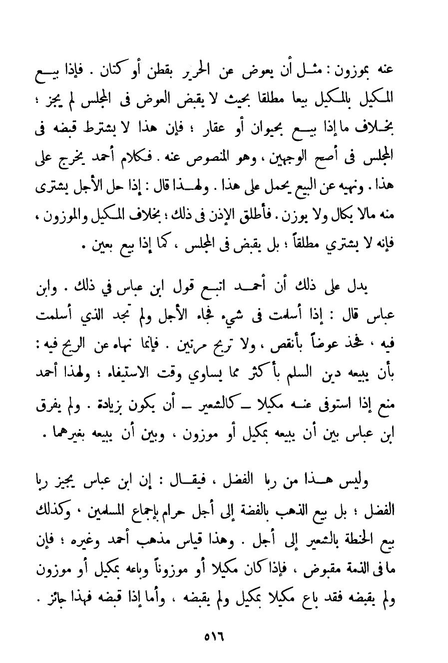 عَنْهُ بِمَوْزُونِ: مِثْلَ أَنْ يُعَوَّضَ عَنْ الْحَرِيرِ بِقُطْنٍ أَوْ كَتَّانٍ. فَإِذَا بِيعَ الْمَكِيلُ بِالْمَكِيلِ بَيْعًا مُطْلَقًا بِحَيْثُ لَا يُقْبَضُ الْعِوَضُ فِي الْمَجْلِسِ لَمْ يَجُزْ؛ بِخِلَافِ مَا إذَا بِيعَ بِحَيَوَانٍ أَوْ عَقَارٍ؛ فَإِنَّ هَذَا لَا يُشْتَرَطُ قَبْضُهُ فِي الْمَجْلِسِ فِي أَصَحِّ الْوَجْهَيْنِ وَهُوَ الْمَنْصُوصُ عَنْهُ، فَكَلَامُ أَحْمَد يَخْرُجُ عَلَى هَذَا. وَنَهْيُهُ عَنْ الْبَيْعِ يُحْمَلُ عَلَى هَذَا. وَلِهَذَا قَالَ: إذَا حَلَّ الْأَجَلُ يَشْتَرِي مِنْهُ مَا لَا يُكَالُ وَلَا يُوزَنُ. فَأَطْلَقَ الْإِذْنَ فِي ذَلِكَ؛ بِخِلَافِ الْمَكِيلِ وَالْمَوْزُونِ فَإِنَّهُ لَا يَشْتَرِي مُطْلَقًا؛ بَلْ يَقْبِضُ فِي الْمَجْلِسِ كَمَا إذَا بِيعَ بِعَيْنِ. يَدُلُّ عَلَى ذَلِكَ أَنَّ أَحْمَد اتَّبَعَ قَوْلَ ابْنِ عَبَّاسٍ فِي ذَلِكَ. وَابْنُ عَبَّاسٍ قَالَ: إذَا أَسْلَمْت فِي شَيْءٍ فَجَاءَ الْأَجَلُ وَلَمْ تَجِدْ الَّذِي أَسْلَمْت فِيهِ فَخُذْ عِوَضًا بِأَنْقَصَ وَلَا تَرْبَحْ مَرَّتَيْنِ. فَإِنَّمَا نَهَاهُ عَنْ الرِّبْحِ فِيهِ: بِأَنْ يَبِيعَهُ دَيْنَ السَّلَمِ بِأَكْثَرَ مِمَّا يُسَاوِي وَقْتَ الِاسْتِيفَاءِ؛ وَلِهَذَا أَحْمَد مَنَعَ إذَا اسْتَوْفَى عَنْهُ مَكِيلًا - كَالشَّعِيرِ - أَنْ يَكُونَ بِزِيَادَةِ. وَلَمْ يُفَرِّقْ ابْنُ عَبَّاسٍ بَيْنَ أَنْ يَبِيعَهُ بِمَكِيلٍ أَوْ مَوْزُونٍ وَبَيْنَ أَنْ يَبِيعَهُ بِغَيْرِهِمَا. وَلَيْسَ هَذَا مِنْ رِبَا الْفَضْلِ فَيُقَالُ: إنَّ ابْنَ عَبَّاسٍ يُجِيزُ رِبَا الْفَضْلِ؛ بَلْ بَيْعُ الذَّهَبِ بِالْفِضَّةِ إلَى أَجَلٍ حَرَامٍ بِإِجْمَاعِ الْمُسْلِمِينَ وَكَذَلِكَ بَيْعُ الْحِنْطَةِ بِالشَّعِيرِ إلَى أَجَلٍ. وَهَذَا قِيَاسُ مَذْهَبِ أَحْمَد وَغَيْرِهِ؛ فَإِنَّ مَا فِي الذِّمَّةِ مَقْبُوضٌ فَإِذَا كَانَ مَكِيلًا أَوْ مَوْزُونًا وَبَاعَهُ بِمَكِيلٍ أَوْ مَوْزُونٍ وَلَمْ يَقْبِضْهُ فَقَدْ بَاعَ مَكِيلًا بِمَكِيلٍ وَلَمْ يَقْبِضْهُ وَأَمَّا إذَا قَبَضَهُ فَهَذَا جَائِزٌ.