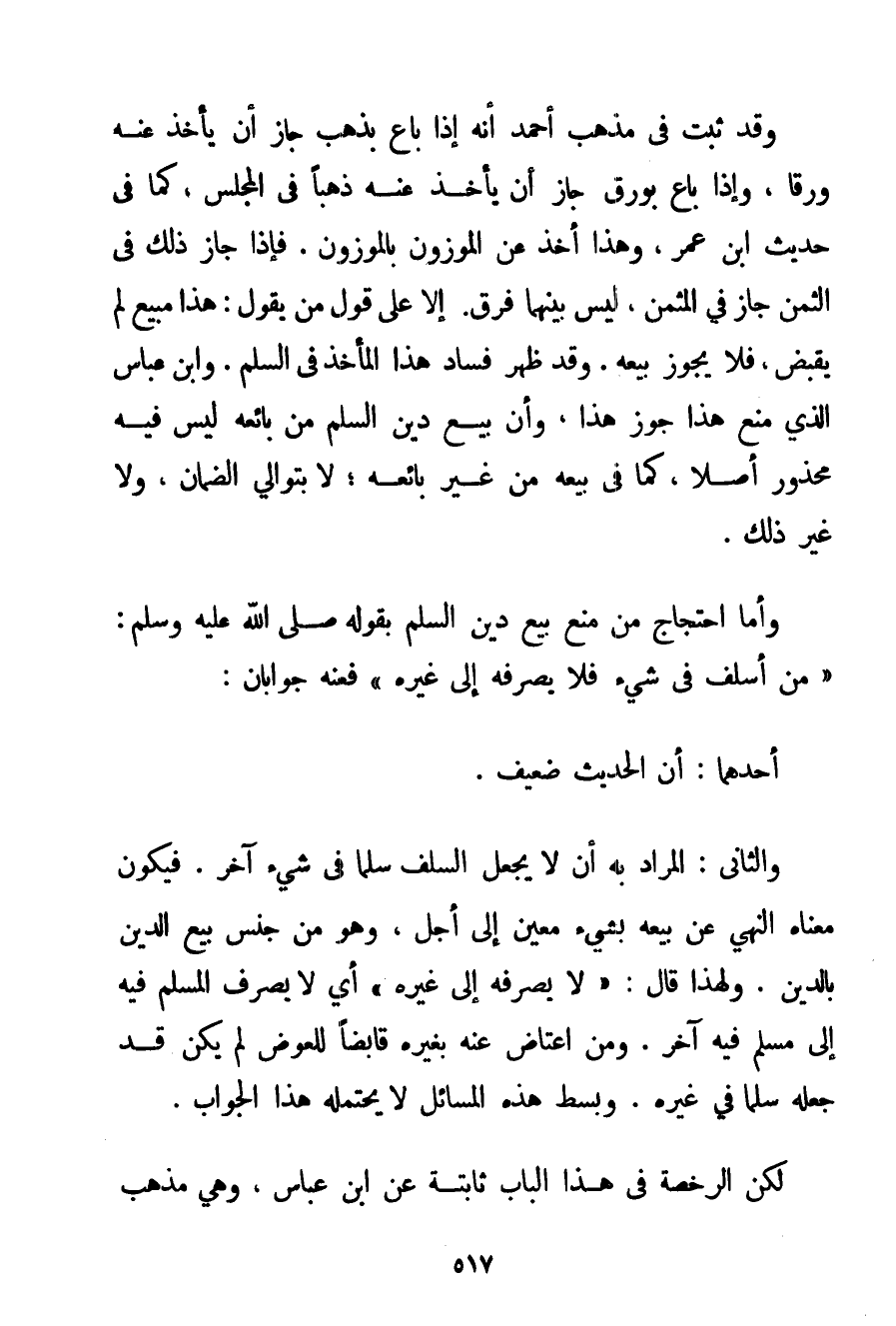 وَقَدْ ثَبَتَ فِي مَذْهَبِ أَحْمَد أَنَّهُ إذَا بَاعَ بِذَهَبِ جَازَ أَنْ يَأْخُذَ عَنْهُ وَرِقًا وَإِذَا بَاعَ بِوَرِقٍ جَازَ أَنْ يَأْخُذَ عَنْهُ ذَهَبًا فِي الْمَجْلِسِ كَمَا فِي حَدِيثِ ابْنِ عُمَرَ وَهَذَا أَخَذَ عَنْ الْمَوْزُونِ بِالْمَوْزُونِ. فَإِذَا جَازَ ذَلِكَ فِي الثَّمَنِ جَازَ فِي الْمُثَمَّنِ لَيْسَ بَيْنَهُمَا فَرْقٌ إلَّا عَلَى قَوْلِ مَنْ يَقُولُ: هَذَا مَبِيعٌ لَمْ يُقْبَضْ فَلَا يَجُوزُ بَيْعُهُ. وَقَدْ ظَهَرَ فَسَادُ هَذَا الْمَأْخَذِ فِي السَّلَمِ. وَابْنُ عَبَّاسٍ الَّذِي مَنَعَ هَذَا جَوَّزَ هَذَا وَأَنَّ بَيْعَ دَيْنِ السَّلَمِ مِنْ بَائِعِهِ لَيْسَ فِيهِ مَحْذُورٌ أَصْلًا كَمَا فِي بَيْعِهِ مِنْ غَيْرِ بَائِعِهِ؛ لَا بِتَوَالِي الضَّمَانِ وَلَا غَيْرِ ذَلِكَ. وَأَمَّا احْتِجَاجُ مَنْ مَنَعَ بَيْعَ دَيْنِ السَّلَمِ بِقَوْلِهِ صَلَّى اللَّهُ عَلَيْهِ وَسَلَّمَ {مَنْ أَسْلَفَ فِي شَيْءٍ فَلَا يَصْرِفْهُ إلَى غَيْرِهِ} فَعَنْهُ جَوَابَانِ: أَحَدُهُمَا: أَنَّ الْحَدِيثَ ضَعِيفٌ. وَالثَّانِي: الْمُرَادُ بِهِ أَنْ لَا يَجْعَلَ السَّلَفَ سَلَمًا فِي شَيْءٍ آخَرَ. فَيَكُونُ مَعْنَاهُ النَّهْيَ عَنْ بَيْعِهِ بِشَيْءٍ مُعَيَّنٍ إلَى أَجَلٍ وَهُوَ مِنْ جِنْسِ بَيْعِ الدَّيْنِ بِالدَّيْنِ. وَلِهَذَا قَالَ: {لَا يَصْرِفْهُ إلَى غَيْرِهِ} أَيْ لَا يَصْرِفُ الْمُسْلَمَ فِيهِ إلَى مُسْلَمٍ فِيهِ آخَرَ. وَمَنْ اعْتَاضَ عَنْهُ بِغَيْرِهِ قَابِضًا لِلْعِوَضِ لَمْ يَكُنْ قَدْ جَعَلَهُ سَلَمًا فِي غَيْرِهِ. وَبَسْطُ هَذِهِ الْمَسَائِلِ لَا يَحْتَمِلُهُ هَذَا الْجَوَابُ. لَكِنَّ الرُّخْصَةَ فِي هَذَا الْبَابِ ثَابِتَةٌ عَنْ ابْنِ عَبَّاسٍ وَهِيَ مَذْهَبُ