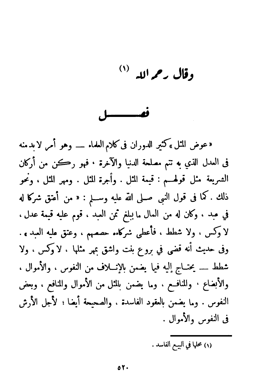 عِوَضُ الْمِثْلِ كَثِيرُ الدَّوَرَانِ فِي كَلَامِ الْعُلَمَاءِ - وَهُوَ أَمْرٌ لَا بُدَّ مِنْهُ فِي الْعَدْلِ الَّذِي بِهِ تَتِمُّ مَصْلَحَةُ الدُّنْيَا وَالْآخِرَةِ فَهُوَ رُكْنٌ مِنْ أَرْكَانِ الشَّرِيعَةِ مِثْلَ قَوْلِهِمْ: قِيمَةُ الْمِثْلِ، وَأُجْرَةُ الْمِثْلِ، وَمَهْرُ الْمِثْلِ وَنَحْوُ ذَلِكَ. كَمَا فِي قَوْلِ النَّبِيِّ صَلَّى اللَّهُ عَلَيْهِ وَسَلَّمَ {مَنْ أَعْتَقَ شِرْكًا لَهُ فِي عَبْدٍ وَكَانَ لَهُ مِنْ الْمَالِ مَا يَبْلُغُ ثَمَنَ الْعَبْدِ قُوِّمَ عَلَيْهِ قِيمَةَ عَدْلٍ لَا وَكْسَ وَلَا شَطَطَ فَأَعْطَى شُرَكَاءَهُ حِصَصَهُمْ وَعَتَقَ عَلَيْهِ الْعَبْدُ} . وَفِي حَدِيثٍ أَنَّهُ قَضَى فِي بروع بِنْتِ وَاشِقٍ بِمَهْرِ مِثْلِهَا لَا وَكْسَ وَلَا شَطَطَ - يُحْتَاجُ إلَيْهِ فِيمَا يُضْمَنُ بِالْإِتْلَافِ مِنْ النُّفُوسِ وَالْأَمْوَالِ وَالْأَبْضَاعِ وَالْمَنَافِعِ وَمَا يُضْمَنُ بِالْمِثْلِ مِنْ الْأَمْوَالِ وَالْمَنَافِعِ وَبَعْضِ النُّفُوسِ. وَمَا يُضْمَنُ بِالْعُقُودِ الْفَاسِدَةِ وَالصَّحِيحَةِ أَيْضًا؛ لِأَجْلِ الْأَرْشِ فِي النُّفُوسِ وَالْأَمْوَالِ.