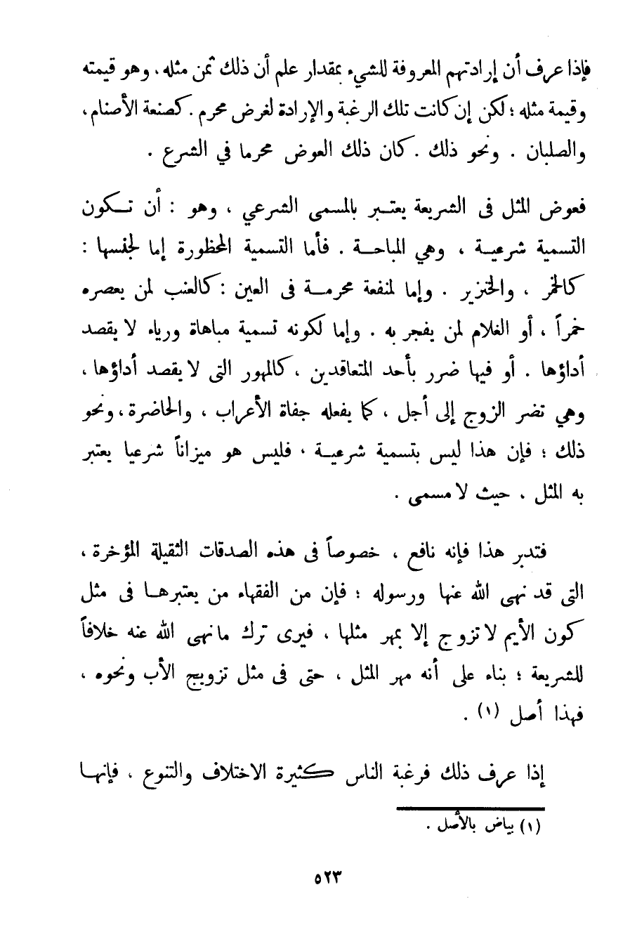 فَإِذَا عُرِفَ أَنَّ إرَادَتَهُمْ الْمَعْرُوفَةَ لِلشَّيْءِ بِمِقْدَارِ عُلِمَ أَنَّ ذَلِكَ ثَمَنُ مِثْلِهِ وَهُوَ قِيمَتُهُ وَقِيمَةُ مِثْلِهِ؛ لَكِنْ إنْ كَانَتْ تِلْكَ الرَّغْبَةُ وَالْإِرَادَةُ لِغَرَضٍ مُحَرَّمٍ، كَصَنْعَةِ الْأَصْنَامِ وَالصُّلْبَانِ. وَنَحْوِ ذَلِكَ. كَانَ ذَلِكَ الْعِوَضُ مُحَرَّمًا فِي الشَّرْعِ. فَعِوَضُ الْمِثْلِ فِي الشَّرِيعَةِ يُعْتَبَرُ بِالْمُسَمَّى الشَّرْعِيِّ وَهُوَ: أَنْ تَكُونَ التَّسْمِيَةُ شَرْعِيَّةً وَهِيَ الْمُبَاحَةُ. فَأَمَّا التَّسْمِيَةُ الْمَحْظُورَةُ إمَّا لِجِنْسِهَا: كَالْخَمْرِ وَالْخِنْزِيرِ. وَإِمَّا لِمَنْفَعَةٍ مُحَرَّمَةٍ فِي الْعَيْنِ: كَالْعِنَبِ لِمَنْ يَعْصِرُهُ خَمْرًا أَوْ الْغُلَامِ لِمَنْ يَفْجُرُ بِهِ. وَإِمَّا لِكَوْنِهِ تَسْمِيَةَ مُبَاهَاةٍ وَرِيَاءٍ لَا يُقْصَدُ أَدَاؤُهَا. أَوْ فِيهَا ضَرَرٌ بِأَحَدِ الْمُتَعَاقِدَيْنِ كَالْمُهُورِ الَّتِي لَا يُقْصَدُ أَدَاؤُهَا وَهِيَ تَضُرُّ الزَّوْجَ إلَى أَجَلٍ كَمَا يَفْعَلُهُ جُفَاةُ الْأَعْرَابِ وَالْحَاضِرَةُ وَنَحْوُ ذَلِكَ؛ فَإِنَّ هَذَا لَيْسَ بِتَسْمِيَةٍ شَرْعِيَّةٍ فَلَيْسَ هُوَ مِيزَانًا شَرْعِيًّا يُعْتَبَرُ بِهِ الْمَثَلُ حَيْثُ لَا مُسَمَّى. فَتَدَبَّرْ هَذَا فَإِنَّهُ نَافِعٌ خُصُوصًا فِي هَذِهِ الصَّدَقَاتِ الثَّقِيلَةِ الْمُؤَخَّرَةِ الَّتِي قَدْ نَهَى اللَّهُ عَنْهَا وَرَسُولُهُ؛ فَإِنَّ مِنْ الْفُقَهَاءِ مَنْ يَعْتَبِرُهَا فِي مِثْلِ كَوْنِ الْأَيِّمِ لَا تُزَوَّجُ إلَّا بِمَهْرِ مِثْلِهَا فَيَرَى تَرْكَ مَا نَهَى اللَّهُ عَنْهُ خِلَافًا لِلشَّرِيعَةِ؛ بِنَاءً عَلَى أَنَّهُ مَهْرُ الْمِثْلِ حَتَّى فِي مِثْلِ تَزْوِيجِ الْأَبِ وَنَحْوِهِ فَهَذَا أَصْلٌ. . . (1) إذَا عُرِفَ ذَلِكَ فَرَغْبَةُ النَّاسِ كَثِيرَةُ الِاخْتِلَافِ وَالتَّنَوُّعِ فَإِنَّهَا
