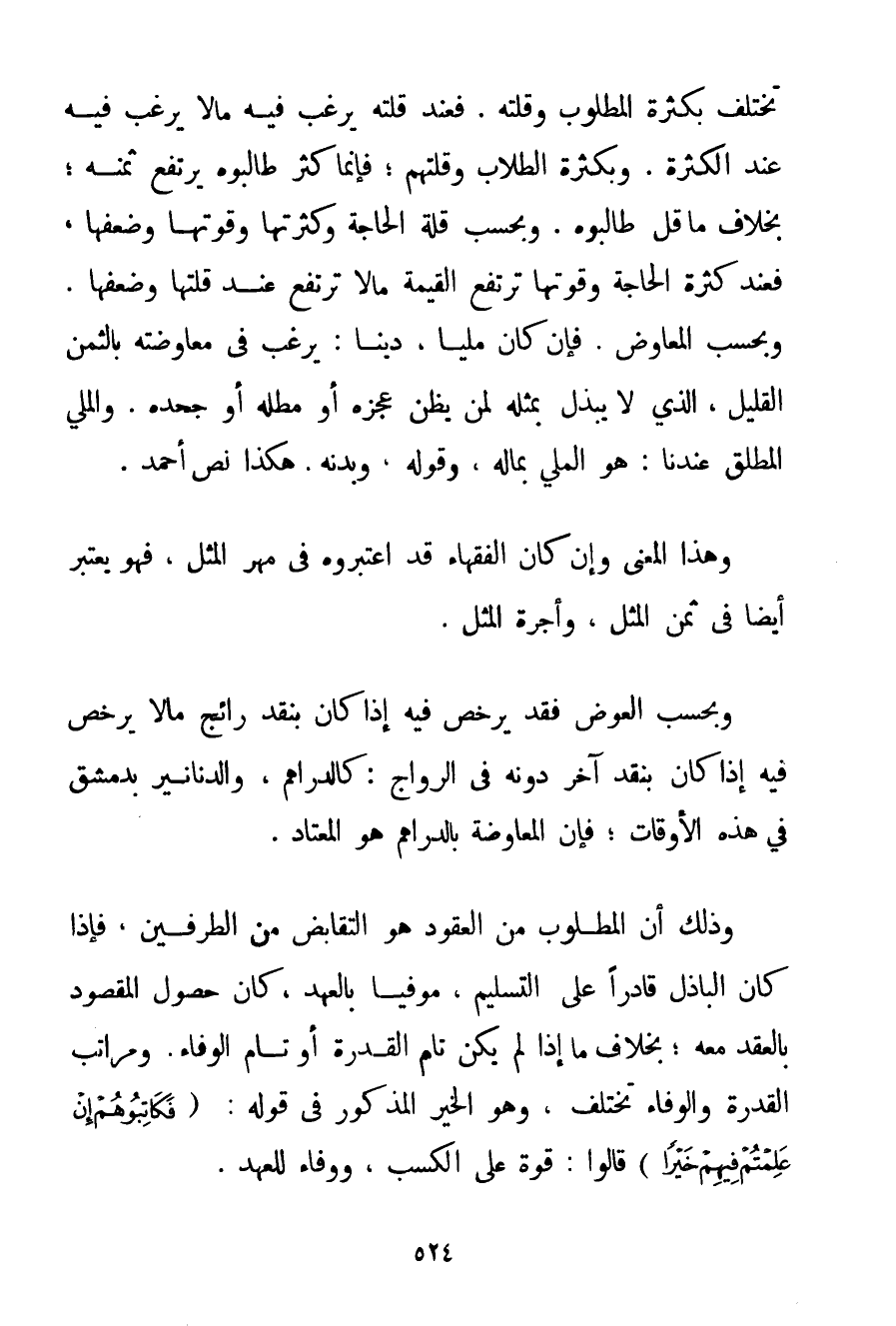 تَخْتَلِفُ بِكَثْرَةِ الْمَطْلُوبِ وَقِلَّتِهِ. فَعِنْدَ قِلَّتِهِ يَرْغَبُ فِيهِ مَا لَا يَرْغَبُ فِيهِ عِنْدَ الْكَثْرَةِ. وَبِكَثْرَةِ الطُّلَّابِ وَقِلَّتِهِمْ؛ فَإِنَّمَا كَثُرَ طَالِبُوهُ يَرْتَفِعُ ثَمَنُهُ؛ بِخِلَافِ مَا قَلَّ طَالِبُوهُ. وَبِحَسَبِ قِلَّةِ الْحَاجَةِ وَكَثْرَتِهَا وَقُوَّتِهَا وَضَعْفِهَا فَعِنْدَ كَثْرَةِ الْحَاجَةِ وَقُوَّتِهَا تَرْتَفِعُ الْقِيمَةُ مَا لَا تَرْتَفِعُ عِنْدَ قِلَّتِهَا وَضَعْفِهَا. وَبِحَسَبِ الْمُعَاوِضِ. فَإِنْ كَانَ مَلِيًّا دَيْنًا: يَرْغَبُ فِي مُعَاوَضَتِهِ بِالثَّمَنِ الْقَلِيلِ الَّذِي لَا يُبْذَلُ بِمِثْلِهِ لِمَنْ يَظُنُّ عَجْزَهُ أَوْ مَطْلَهُ أَوْ جَحْدَهُ. وَالْمَلِيُّ الْمُطْلَقُ عِنْدَنَا: هُوَ الْمَلِيُّ بِمَالِهِ وَقَوْلِهِ وَبَدَنِهِ. هَكَذَا نَصَّ أَحْمَد. وَهَذَا الْمَعْنَى وَإِنْ كَانَ الْفُقَهَاءُ قَدْ اعْتَبَرُوهُ فِي مَهْرِ الْمِثْلِ فَهُوَ يُعْتَبَرُ أَيْضًا فِي ثَمَنِ الْمِثْلِ وَأُجْرَةِ الْمِثْلِ. وَبِحَسَبِ الْعِوَضِ فَقَدْ يُرَخَّصُ فِيهِ إذَا كَانَ بِنَقْدٍ رَائِجٍ مَا لَا يُرَخَّصُ فِيهِ إذَا كَانَ بِنَقْدٍ آخَرَ دُونَهُ فِي الرَّوَاجِ: كَالدَّرَاهِمِ وَالدَّنَانِيرِ بِدِمَشْقَ فِي هَذِهِ الْأَوْقَاتِ؛ فَإِنَّ الْمُعَاوَضَةَ بِالدَّرَاهِمِ هُوَ الْمُعْتَادُ. وَذَلِكَ أَنَّ الْمَطْلُوبَ مِنْ الْعُقُودِ هُوَ التَّقَابُضُ مِنْ الطَّرَفَيْنِ فَإِذَا كَانَ الْبَاذِلُ قَادِرًا عَلَى التَّسْلِيمِ مُوفِيًا بِالْعَهْدِ كَانَ حُصُولُ الْمَقْصُودِ بِالْعَقْدِ مَعَهُ؛ بِخِلَافِ مَا إذَا لَمْ يَكُنْ تَامَّ الْقُدْرَةِ أَوْ تَامَّ الْوَفَاءِ. وَمَرَاتِبُ الْقُدْرَةِ وَالْوَفَاءِ تَخْتَلِفُ وَهُوَ الْخَيْرُ الْمَذْكُورُ فِي قَوْلِهِ: {فَكَاتِبُوهُمْ إنْ عَلِمْتُمْ فِيهِمْ خَيْرًا} قَالُوا: قُوَّةٌ عَلَى الْكَسْبِ وَوَفَاءٌ لِلْعَهْدِ.