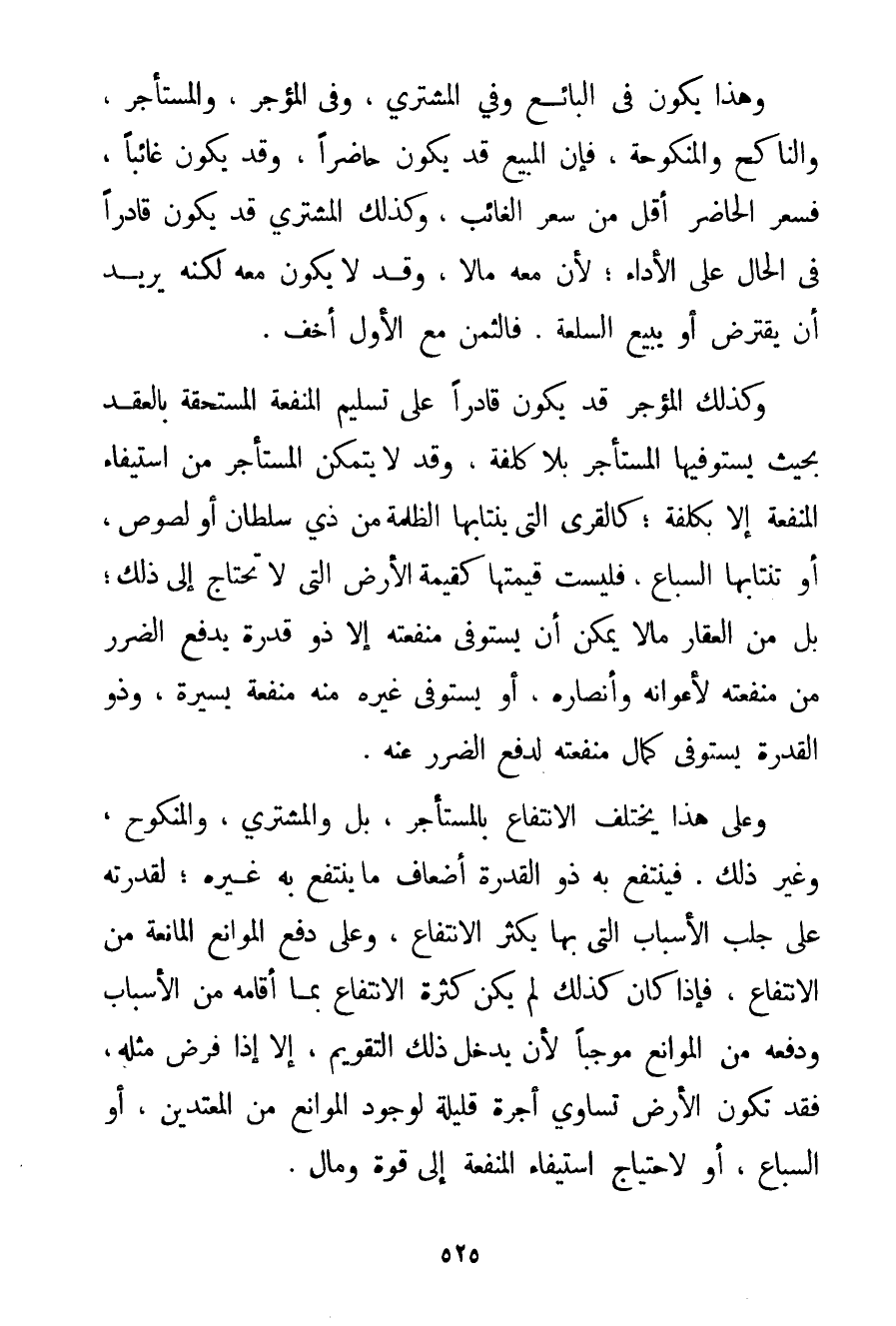 وَهَذَا يَكُونُ فِي الْبَائِعِ وَفِي الْمُشْتَرِي وَفِي الْمُؤَجَّرِ وَالْمُسْتَأْجِرِ وَالنَّاكِحِ وَالْمَنْكُوحَةِ فَإِنَّ الْمَبِيعَ قَدْ يَكُونُ حَاضِرًا وَقَدْ يَكُونُ غَائِبًا فَسِعْرُ الْحَاضِرِ أَقَلُّ مِنْ سِعْرِ الْغَائِبِ وَكَذَلِكَ الْمُشْتَرِي قَدْ يَكُونُ قَادِرًا فِي الْحَالِ عَلَى الْأَدَاءِ؛ لِأَنَّ مَعَهُ مَالًا وَقَدْ لَا يَكُونُ مَعَهُ لَكِنَّهُ يُرِيدُ أَنْ يَقْتَرِضَ أَوْ يَبِيعَ السِّلْعَةَ فَالثَّمَنُ مَعَ الْأَوَّلِ أَخَفُّ. وَكَذَلِكَ الْمُؤَجَّرُ قَدْ يَكُونُ قَادِرًا عَلَى تَسْلِيمِ الْمَنْفَعَةِ الْمُسْتَحَقَّةِ بِالْعَقْدِ بِحَيْثُ يَسْتَوْفِيهَا الْمُسْتَأْجِرُ بِلَا كُلْفَةٍ وَقَدْ لَا يَتَمَكَّنُ الْمُسْتَأْجِرُ مِنْ اسْتِيفَاءِ الْمَنْفَعَةِ إلَّا بِكُلْفَةِ؛ كَالْقُرَى الَّتِي يَنْتَابُهَا الظَّلَمَةُ مِنْ ذِي سُلْطَانٍ أَوْ لُصُوصٍ أَوْ تَنْتَابُهَا السِّبَاعُ فَلَيْسَتْ قِيمَتُهَا كَقِيمَةِ الْأَرْضِ الَّتِي لَا تَحْتَاجُ إلَى ذَلِكَ: بَلْ مِنْ الْعَقَارِ مَا لَا يُمْكِنُ أَنْ يَسْتَوْفِيَ مَنْفَعَتَهُ إلَّا ذُو قُدْرَةٍ يَدْفَعُ الضَّرَرَ مِنْ مَنْفَعَتِهِ لِأَعْوَانِهِ وَأَنْصَارِهِ أَوْ يَسْتَوْفِي غَيْرُهُ مِنْهُ مَنْفَعَةً يَسِيرَةً وَذُو الْقُدْرَةِ يَسْتَوْفِي كَمَالَ مَنْفَعَتِهِ لِدَفْعِ الضَّرَرِ عَنْهُ. وَعَلَى هَذَا يَخْتَلِفُ الِانْتِفَاعُ بِالْمُسْتَأْجِرِ بَلْ وَالْمُشْتَرِي وَالْمَنْكُوحِ وَغَيْرِ ذَلِكَ، فَيَنْتَفِعُ بِهِ ذُو الْقُدْرَةِ أَضْعَافَ مَا يَنْتَفِعُ بِهِ غَيْرُهُ؛ لِقُدْرَتِهِ عَلَى جَلْبِ الْأَسْبَابِ الَّتِي بِهَا يَكْثُرُ الِانْتِفَاعُ وَعَلَى دَفْعِ الْمَوَانِعِ الْمَانِعَةِ مِنْ الِانْتِفَاعِ فَإِذَا كَانَ كَذَلِكَ لَمْ يَكُنْ كَثْرَةُ الِانْتِفَاعِ بِمَا أَقَامَهُ مِنْ الْأَسْبَابِ وَدَفْعُهُ مِنْ الْمَوَانِعِ مُوجِبًا لِأَنْ يَدْخُلَ ذَلِكَ التَّقْوِيمُ إلَّا إذَا فَرَضَ مِثْلَهُ فَقَدْ تَكُونُ الْأَرْضُ تُسَاوِي أُجْرَةً قَلِيلَةً لِوُجُودِ الْمَوَانِعِ مِنْ الْمُعْتَدِينَ أَوْ السِّبَاعِ أَوْ لِاحْتِيَاجِ اسْتِيفَاءِ الْمَنْفَعَةِ إلَّا قُوَّةٍ وَمَالٍ.