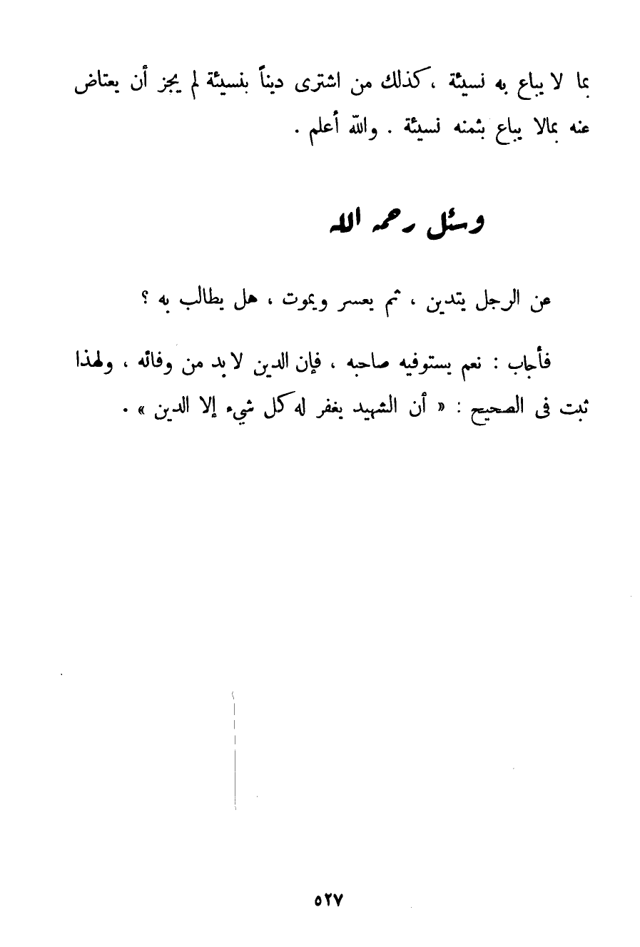 بِمَا لَا يُبَاعُ بِهِ نَسِيئَةً كَذَلِكَ مَنْ اشْتَرَى دَيْنًا بِنَسِيئَةٍ لَمْ يَجُزْ أَنْ يَعْتَاضَ عَنْهُ بِمَا لَا يُبَاعُ بِثَمَنِهِ نَسِيئَةً. وَاَللَّهُ أَعْلَمُ. وَسُئِلَ - رَحِمَهُ اللَّهُ -: