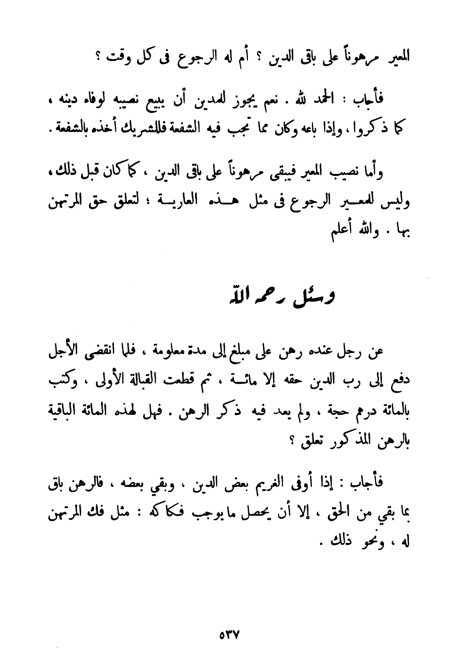الْحَمْدُ لِلَّهِ، نَعَمْ يَجُوزُ لِلْمَدِينِ أَنْ يَبِيعَ نَصِيبَهُ لِوَفَاءِ دَيْنِهِ كَمَا ذَكَرُوا وَإِذَا بَاعَهُ وَكَانَ مِمَّا تَجِبُ فِيهِ الشُّفْعَةُ فَلِلشَّرِيكِ أَخْذُهُ بِالشُّفْعَةِ. وَأَمَّا نَصِيبُ الْمُعِيرِ فَيَبْقَى مَرْهُونًا عَلَى بَاقِي الدَّيْنِ كَمَا كَانَ قَبْلَ ذَلِكَ وَلَيْسَ لِلْمُعِيرِ الرُّجُوعُ فِي مِثْلِ هَذِهِ الْعَارِيَةِ؛ لِتَعَلُّقِ حَقِّ الْمُرْتَهِنِ بِهَا. وَاَللَّهُ أَعْلَمُ.