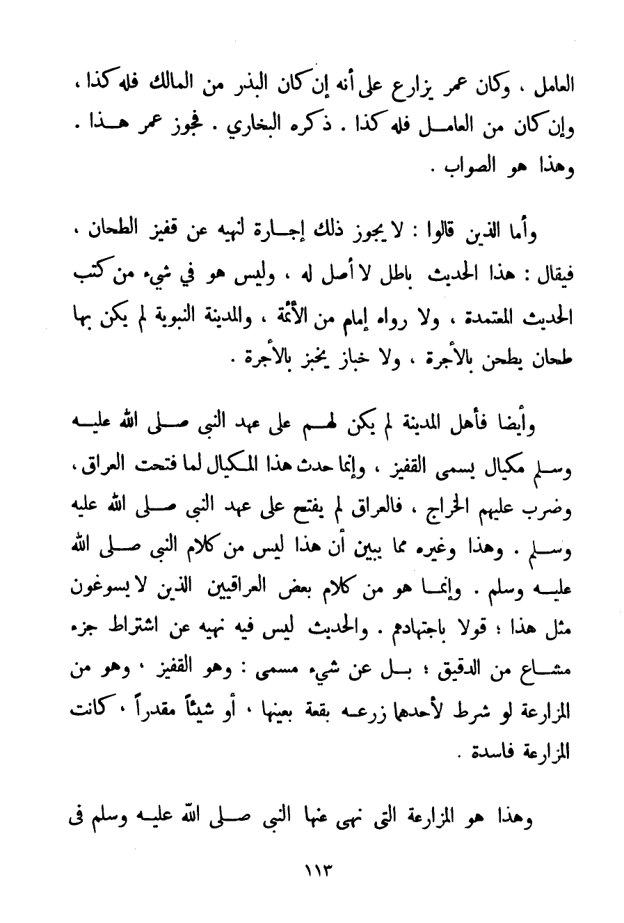 الْعَامِلِ وَكَانَ عُمَرَ يُزَارِعُ عَلَى أَنَّهُ إنْ كَانَ الْبَذْرُ مِنْ الْمَالِكِ فَلَهُ كَذَا وَإِنْ كَانَ مِنْ الْعَامِلِ فَلَهُ كَذَا. ذَكَرَهُ الْبُخَارِيُّ. فَجَوَّزَ عُمَرَ هَذَا. وَهَذَا هُوَ الصَّوَابُ. وَأَمَّا الَّذِينَ قَالُوا: لَا يَجُوزُ ذَلِكَ إجَارَةً لِنَهْيِهِ عَنْ قَفِيزِ الطَّحَّانِ فَيُقَالُ: هَذَا الْحَدِيثُ بَاطِلٌ لَا أَصْلَ لَهُ وَلَيْسَ هُوَ فِي شَيْءٍ مِنْ كُتُبِ الْحَدِيثِ الْمُعْتَمَدَةِ وَلَا رَوَاهُ إمَامٌ مِنْ الْأَئِمَّةِ وَالْمَدِينَةُ النَّبَوِيَّةُ لَمْ يَكُنْ بِهَا طَحَّانٌ يَطْحَنُ بِالْأُجْرَةِ وَلَا خَبَّازٌ يَخْبِزُ بِالْأُجْرَةِ. وَأَيْضًا فَأَهْلُ الْمَدِينَةِ لَمْ يَكُنْ لَهُمْ عَلَى عَهْدِ النَّبِيِّ صَلَّى اللَّهُ عَلَيْهِ وَسَلَّمَ مِكْيَالٌ يُسَمَّى الْقَفِيزَ وَإِنَّمَا حَدَثَ هَذَا الْمِكْيَالُ لَمَّا فُتِحَتْ الْعِرَاقُ وَضُرِبَ عَلَيْهِمْ الْخَرَاجُ فَالْعِرَاقُ لَمْ يُفْتَحْ عَلَى عَهْدِ النَّبِيِّ صَلَّى اللَّهُ عَلَيْهِ وَسَلَّمَ. وَهَذَا وَغَيْرُهُ مِمَّا يُبَيِّنُ أَنَّ هَذَا لَيْسَ مِنْ كَلَامِ النَّبِيِّ صَلَّى اللَّهُ عَلَيْهِ وَسَلَّمَ. وَإِنَّمَا هُوَ مِنْ كَلَامِ بَعْضِ الْعِرَاقِيِّينَ الَّذِينَ لَا يُسَوِّغُونَ مِثْلَ هَذَا؛ قَوْلًا بِاجْتِهَادِهِمْ. وَالْحَدِيثُ لَيْسَ فِيهِ نَهْيُهُ عَنْ اشْتِرَاطِ جُزْءٍ مُشَاعٍ مِنْ الدَّقِيقِ؛ بَلْ عَنْ شَيْءٍ مُسَمًّى: وَهُوَ الْقَفِيزُ وَهُوَ مِنْ الْمُزَارَعَةِ لَوْ شَرَطَ لِأَحَدِهِمَا زَرَعَهُ بُقْعَةً بِعَيْنِهَا أَوْ شَيْئًا مُقَدَّرًا كَانَتْ الْمُزَارَعَةُ فَاسِدَةً. وَهَذَا هُوَ الْمُزَارَعَةُ الَّتِي نَهَى عَنْهَا النَّبِيُّ صَلَّى اللَّهُ عَلَيْهِ وَسَلَّمَ فِي