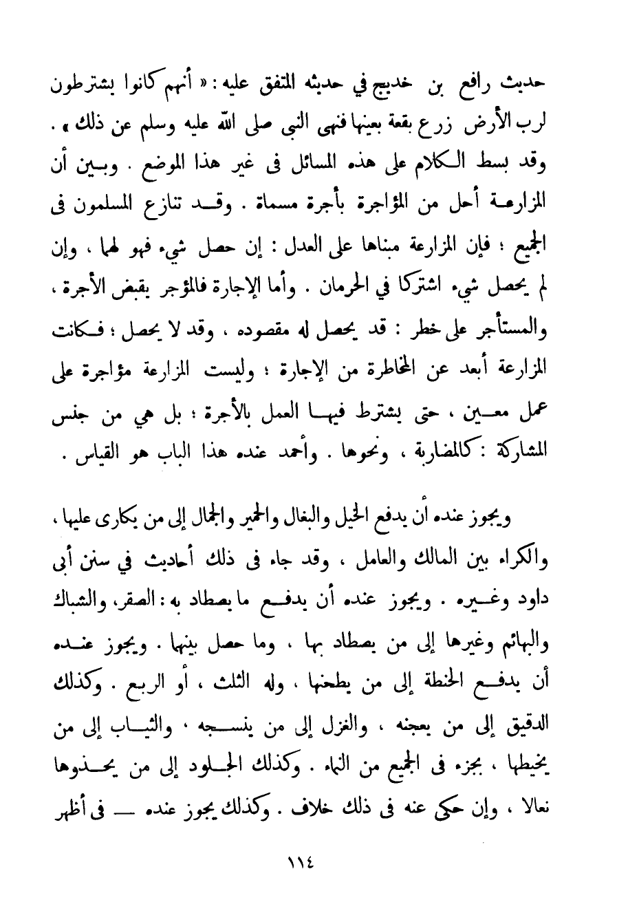 حَدِيثِ رَافِعِ بْنِ خَدِيجٍ فِي حَدِيثِهِ الْمُتَّفَقِ عَلَيْهِ: {أَنَّهُمْ كَانُوا يَشْتَرِطُونَ لِرَبِّ الْأَرْضِ زَرْعَ بُقْعَةٍ بِعَيْنِهَا فَنَهَى النَّبِيُّ صَلَّى اللَّهُ عَلَيْهِ وَسَلَّمَ عَنْ ذَلِكَ} ". وَقَدْ بَسَطَ الْكَلَامَ عَلَى هَذِهِ الْمَسَائِلِ فِي غَيْرِ هَذَا الْمَوْضِعِ. وَبَيَّنَ أَنَّ الْمُزَارَعَةَ أَحَلُّ مِنْ الْمُؤَاجَرَةِ بِأُجْرَةِ مُسَمَّاةٍ. وَقَدْ تَنَازَعَ الْمُسْلِمُونَ فِي الْجَمِيعِ؛ فَإِنَّ الْمُزَارَعَةَ مَبْنَاهَا عَلَى الْعَدْلِ: إنْ حَصَلَ شَيْءٌ فَهُوَ لَهُمَا وَإِنْ لَمْ يَحْصُلْ شَيْءٌ اشْتَرَكَا فِي الْحِرْمَانِ. وَأَمَّا الْإِجَارَةُ فَالْمُؤَجِّرُ يَقْبِضُ الْأُجْرَةَ وَالْمُسْتَأْجِرُ عَلَى خَطَرٍ: قَدْ يَحْصُلُ لَهُ مَقْصُودُهُ وَقَدْ لَا يَحْصُلُ؛ فَكَانَتْ الْمُزَارَعَةُ أَبْعَدَ عَنْ الْمُخَاطَرَةِ مِنْ الْإِجَارَةِ؛ وَلَيْسَتْ الْمُزَارَعَةُ مُؤَاجَرَةً عَلَى عَمَلٍ مُعَيَّنٍ حَتَّى يُشْتَرَطَ فِيهَا الْعَمَلُ بِالْأُجْرَةِ؛ بَلْ هِيَ مِنْ جِنْسِ الْمُشَارَكَةِ: كَالْمُضَارَبَةِ وَنَحْوِهَا. وَأَحْمَد عِنْدَهُ هَذَا الْبَابُ هُوَ الْقِيَاسُ.