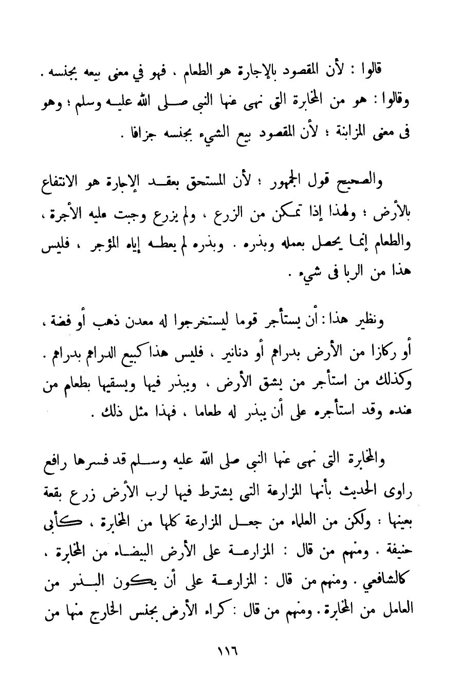 قَالُوا: لِأَنَّ الْمَقْصُودَ بِالْإِجَارَةِ هُوَ الطَّعَامُ فَهُوَ فِي مَعْنَى بَيْعِهِ بِجِنْسِهِ. وَقَالُوا: هُوَ مِنْ الْمُخَابَرَةِ الَّتِي نَهَى عَنْهَا النَّبِيُّ صَلَّى اللَّهُ عَلَيْهِ وَسَلَّمَ وَهُوَ فِي مَعْنَى الْمُزَابَنَةِ؛ لِأَنَّ الْمَقْصُودَ بَيْعُ الشَّيْءِ بِجِنْسِهِ جُزَافًا. وَالصَّحِيحُ قَوْلُ الْجُمْهُورِ؛ لِأَنَّ الْمُسْتَحَقَّ بِعَقْدِ الْإِجَارَةِ هُوَ الِانْتِفَاعُ بِالْأَرْضِ؛ وَلِهَذَا إذَا تَمَكَّنَ مِنْ الزَّرْعِ وَلَمْ يَزْرَعْ وَجَبَتْ عَلَيْهِ الْأُجْرَةُ وَالطَّعَامُ إنَّمَا يَحْصُلُ بِعَمَلِهِ وَبَذْرِهِ. وَبَذْرُهُ لَمْ يُعْطِهِ إيَّاهُ الْمُؤَجِّرُ فَلَيْسَ هَذَا مِنْ الرِّبَا فِي شَيْءٍ. وَنَظِيرُ هَذَا: أَنْ يَسْتَأْجِرَ قَوْمًا لِيَسْتَخْرِجُوا لَهُ مَعْدِنَ ذَهَبٍ أَوْ فِضَّةٍ أَوْ رِكَازًا مِنْ الْأَرْضِ بِدَرَاهِمَ أَوْ دَنَانِيرَ فَلَيْسَ هَذَا كَبَيْعِ الدَّرَاهِمِ بِدَرَاهِمَ. وَكَذَلِكَ مَنْ اسْتَأْجَرَ مَنْ يَشُقُّ الْأَرْضَ وَيَبْذُرُ فِيهَا وَيَسْقِيهَا بِطَعَامِ مِنْ عِنْدِهِ وَقَدْ اسْتَأْجَرَهُ عَلَى أَنْ يَبْذُرَ لَهُ طَعَامًا. فَهَذَا مِثْلُ ذَلِكَ. وَالْمُخَابَرَةُ الَّتِي نَهَى عَنْهَا النَّبِيُّ صَلَّى اللَّهُ عَلَيْهِ وَسَلَّمَ قَدْ فَسَّرَهَا رَافِعٌ رَاوِي الْحَدِيثِ بِأَنَّهَا الْمُزَارَعَةُ الَّتِي يُشْتَرَطُ فِيهَا لِرَبِّ الْأَرْضِ زَرْعُ بُقْعَةٍ بِعَيْنِهَا؛ وَلَكِنْ مِنْ الْعُلَمَاءِ مَنْ جَعَلَ الْمُزَارَعَةَ كُلَّهَا مِنْ الْمُخَابَرَةِ كَأَبِي حَنِيفَةَ. وَمِنْهُمْ مَنْ قَالَ: الْمُزَارَعَةُ عَلَى الْأَرْضِ الْبَيْضَاءِ مِنْ الْمُخَابَرَةِ كَالشَّافِعِيِّ. وَمِنْهُمْ مَنْ قَالَ: الْمُزَارَعَةُ عَلَى أَنْ يَكُونَ الْبَذْرُ مِنْ الْعَامِلِ مِنْ الْمُخَابَرَةِ. وَمِنْهُمْ مَنْ قَالَ: كِرَاءُ الْأَرْضِ بِجِنْسِ الْخَارِجِ مِنْهَا مِنْ