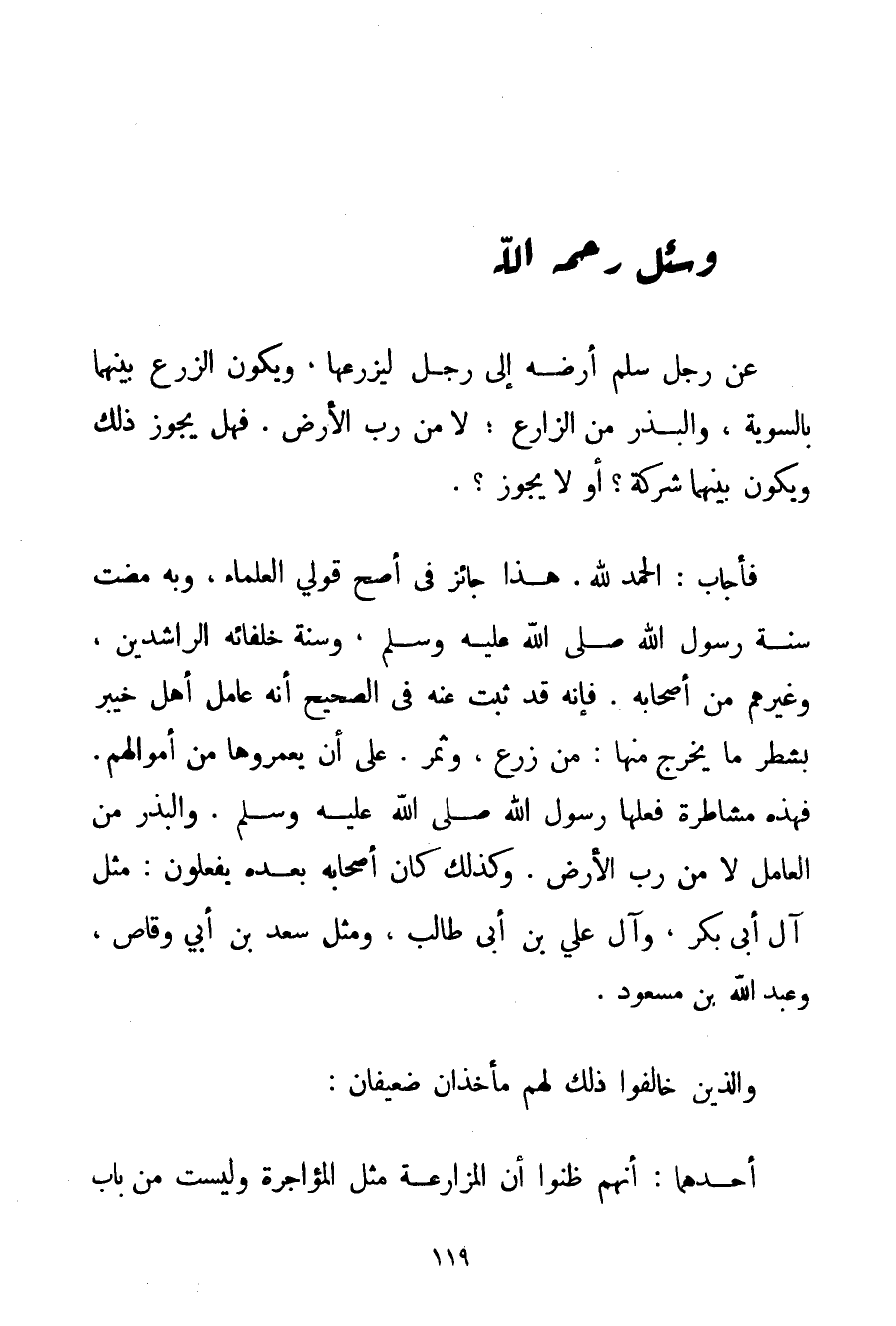 الْحَمْدُ لِلَّهِ، هَذَا جَائِزٌ فِي أَصَحِّ قَوْلَيْ الْعُلَمَاءِ وَبِهِ مَضَتْ سُنَّةُ رَسُولِ اللَّهِ صَلَّى اللَّهُ عَلَيْهِ وَسَلَّمَ وَسُنَّةُ خُلَفَائِهِ الرَّاشِدِينَ وَغَيْرِهِمْ مِنْ أَصْحَابِهِ. فَإِنَّهُ قَدْ ثَبَتَ عَنْهُ فِي الصَّحِيحِ أَنَّهُ عَامَلَ أَهْلَ خَيْبَرَ بِشَطْرِ مَا يَخْرُجُ مِنْهَا: مِنْ زَرْعٍ وَثَمَرٍ. عَلَى أَنْ يُعَمِّرُوهَا مِنْ أَمْوَالِهِمْ. فَهَذِهِ مُشَاطَرَةٌ فَعَلَهَا رَسُولُ اللَّهِ صَلَّى اللَّهُ عَلَيْهِ وَسَلَّمَ. وَالْبَذْرُ مِنْ الْعَامِلِ لَا مِنْ رَبِّ الْأَرْضِ. وَكَذَلِكَ كَانَ أَصْحَابُهُ بَعْدَهُ يَفْعَلُونَ: مِثْلَ آلِ أَبِي بَكْرٍ وَآلِ عَلِيِّ بْنِ أَبِي طَالِبٍ وَمِثْلَ سَعْدِ بْنِ أَبِي وَقَّاصٍ وَعَبْدِ اللَّهِ بْنِ مَسْعُودٍ. وَاَلَّذِينَ خَالَفُوا ذَلِكَ لَهُمْ مَأْخَذَانِ ضَعِيفَانِ: أَحَدُهُمَا: أَنَّهُمْ ظَنُّوا أَنَّ الْمُزَارَعَةَ مِثْلُ الْمُؤَاجَرَةِ وَلَيْسَتْ مِنْ بَابِ