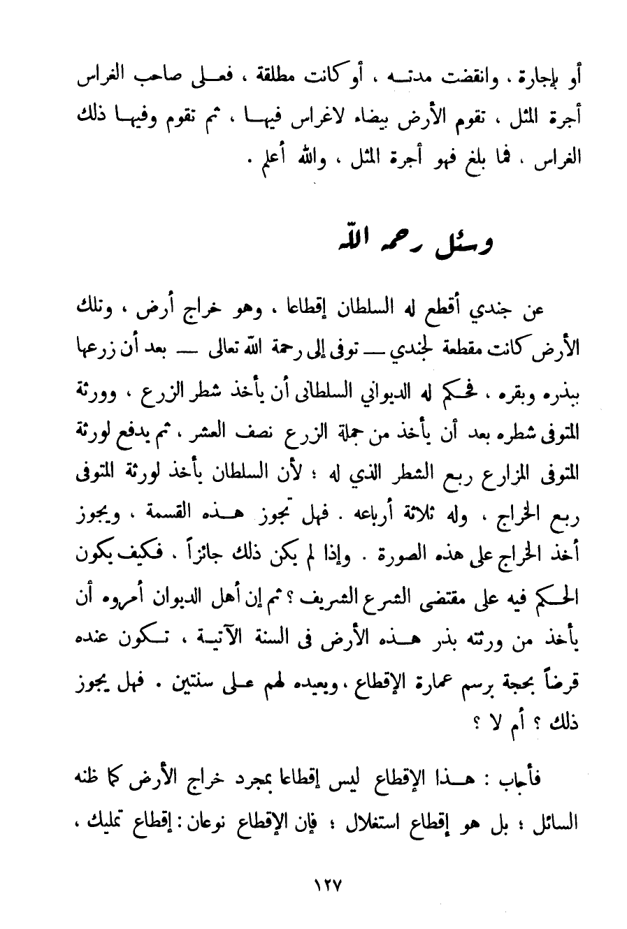 هَذَا الْإِقْطَاعُ لَيْسَ إقْطَاعًا بِمُجَرَّدِ خَرَاجِ الْأَرْضِ كَمَا ظَنَّهُ السَّائِلُ بَلْ هُوَ إقْطَاعُ اسْتِغْلَالٍ؛ فَإِنَّ الْإِقْطَاعَ نَوْعَانِ: إقْطَاعُ تَمْلِيكٍ