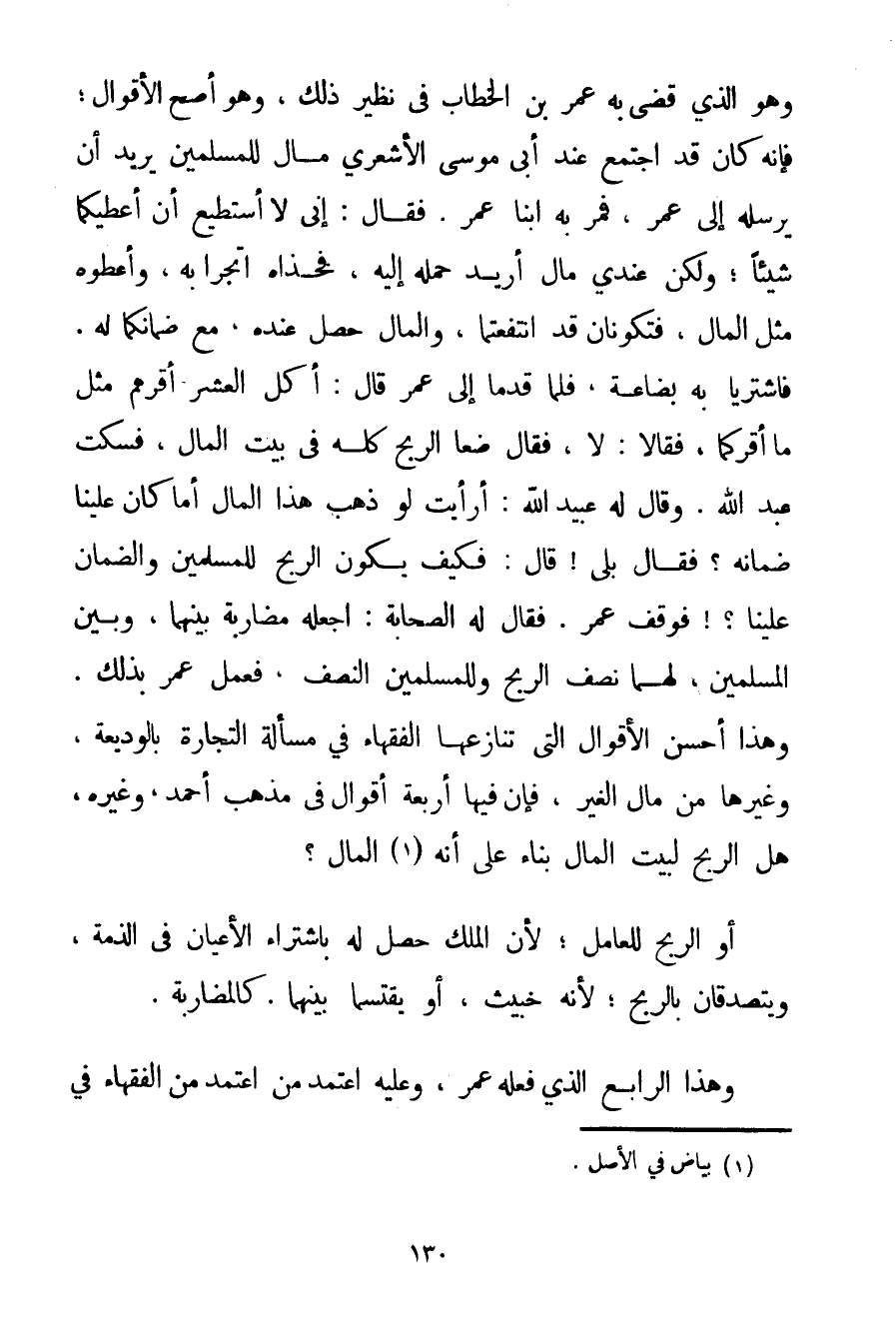 وَهُوَ الَّذِي قَضَى بِهِ عُمَرُ بْنُ الْخَطَّابِ فِي نَظِيرِ ذَلِكَ وَهُوَ أَصَحُّ الْأَقْوَالِ؛ فَإِنَّهُ كَانَ قَدْ اجْتَمَعَ عِنْدَ أَبِي مُوسَى الْأَشْعَرِيِّ مَالٌ لِلْمُسْلِمِينَ يُرِيدُ أَنْ يُرْسِلَهُ إلَى عُمَرَ فَمَرَّ بِهِ ابْنَا عُمَرَ. فَقَالَ: إنِّي لَا أَسْتَطِيعُ أَنْ أُعْطِيَكُمَا شَيْئًا؛ وَلَكِنْ عِنْدِي مَالٌ أُرِيدُ حَمْلَهُ إلَيْهِ فَخُذَاهُ اتَّجِرَا بِهِ وَأَعْطُوهُ مِثْلَ الْمَالِ فَتَكُونَانِ قَدْ انْتَفَعْتُمَا وَالْمَالُ حَصَلَ عِنْدَهُ مَعَ ضَمَانِكُمَا لَهُ. فَاشْتَرَيَا بِهِ بِضَاعَةً فَلَمَّا قَدِمَا إلَى عُمَرَ قَالَ: أَكُلَّ الْعُشْرِ أَقَرَّهُمْ مِثْلَ مَا أَقَرَّكُمَا فَقَالَا: لَا فَقَالَ ضَعَا الرِّبْحَ كُلَّهُ فِي بَيْتِ الْمَالِ فَسَكَتَ عَبْدُ اللَّهِ. وَقَالَ لَهُ عُبَيْدُ اللَّهِ: أَرَأَيْت لَوْ ذَهَبَ هَذَا الْمَالُ أَمَا كَانَ عَلَيْنَا ضَمَانُهُ؟ فَقَالَ بَلَى قَالَ: فَكَيْفَ يَكُونُ الرِّبْحُ لِلْمُسْلِمِينَ وَالضَّمَانُ عَلَيْنَا فَوَقَفَ عُمَرَ. فَقَالَ لَهُ الصَّحَابَةُ: اجْعَلْهُ مُضَارَبَةً بَيْنَهُمَا وَبَيْنَ الْمُسْلِمِينَ لَهُمَا نِصْفُ الرِّبْحِ وَلِلْمُسْلِمِينَ النِّصْفُ فَعَمِلَ عُمَرَ بِذَلِكَ. وَهَذَا أَحْسَنُ الْأَقْوَالِ الَّتِي تَنَازَعَهَا الْفُقَهَاءُ فِي مَسْأَلَةِ التِّجَارَةِ بِالْوَدِيعَةِ وَغَيْرِهَا مِنْ مَالِ الْغَيْرِ فَإِنَّ فِيهَا أَرْبَعَةَ أَقْوَالٍ فِي مَذْهَبِ أَحْمَد وَغَيْرِهِ هَلْ الرِّبْحُ لِبَيْتِ الْمَالِ بِنَاءً عَلَى أَنَّهُ. . . (1) الْمَالُ؟ أَوْ الرِّبْحُ لِلْعَامِلِ؛ لِأَنَّ الْمِلْكَ حَصَلَ لَهُ بِاشْتِرَاءِ الْأَعْيَانِ فِي الذِّمَّةِ وَيَتَصَدَّقَانِ بِالرِّبْحِ؛ لِأَنَّهُ خَبِيثٌ أَوْ يَقْتَسِمَا بَيْنَهُمَا. كَالْمُضَارَبَةِ. وَهَذَا الرَّابِعُ الَّذِي فَعَلَهُ عُمَرَ وَعَلَيْهِ اعْتَمَدَ مَنْ اعْتَمَدَ مِنْ الْفُقَهَاءِ فِي