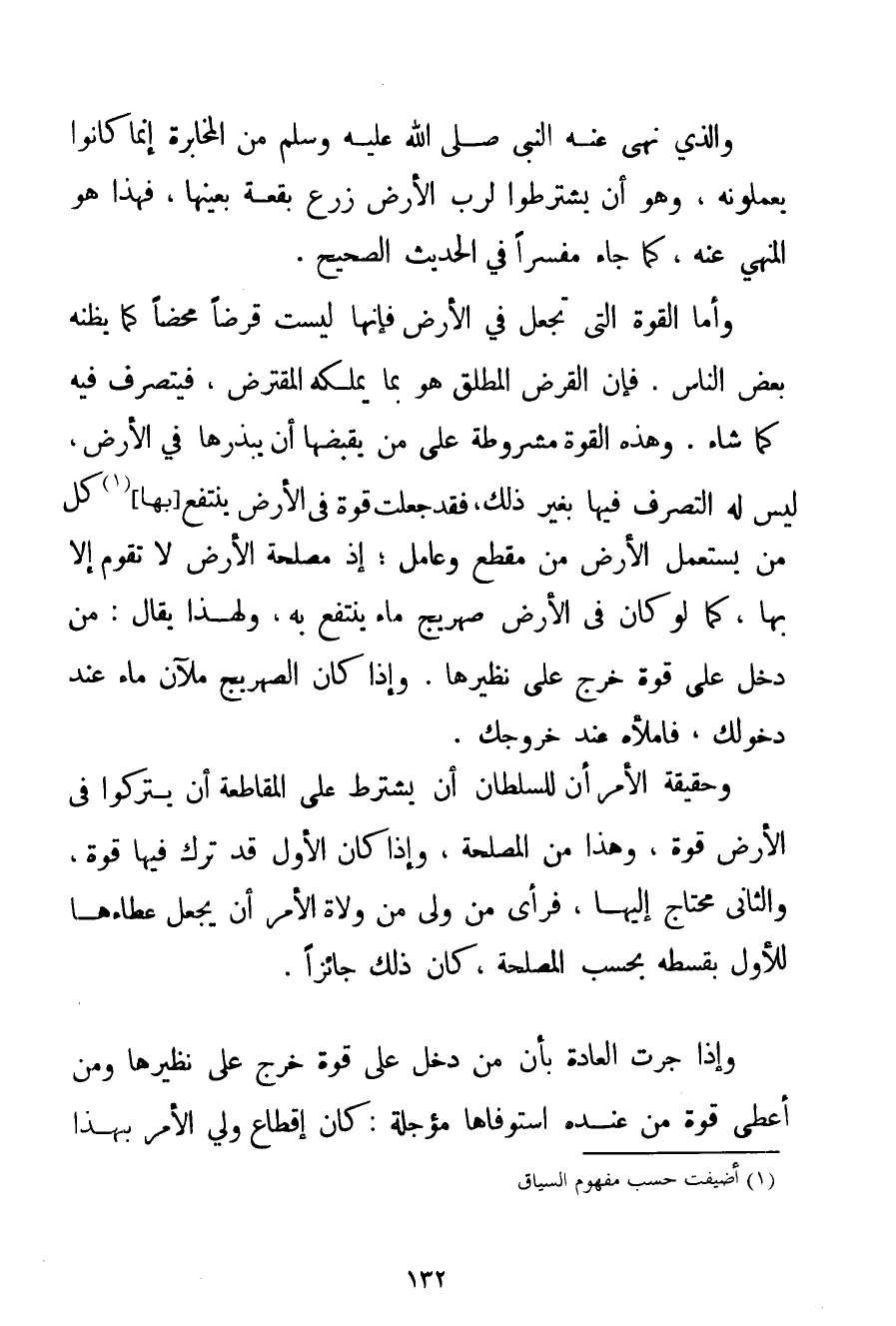 وَاَلَّذِي نَهَى عَنْهُ النَّبِيُّ صَلَّى اللَّهُ عَلَيْهِ وَسَلَّمَ مِنْ الْمُخَابَرَةِ إنَّمَا كَانُوا يَعْمَلُونَهُ وَهُوَ أَنْ يَشْتَرِطُوا لِرَبِّ الْأَرْضِ زَرْعَ بُقْعَةٍ بِعَيْنِهَا فَهَذَا هُوَ الْمَنْهِيُّ عَنْهُ كَمَا جَاءَ مُفَسَّرًا فِي الْحَدِيثِ الصَّحِيحِ. وَأَمَّا الْقُوَّةُ الَّتِي تُجْعَلُ فِي الْأَرْضِ فَإِنَّهَا لَيْسَتْ قَرْضًا مَحْضًا كَمَا يَظُنُّهُ بَعْضُ النَّاسِ. فَإِنَّ الْقَرْضَ الْمُطْلَقَ هُوَ بِمَا يَمْلِكُهُ الْمُقْتَرِضُ فَيَتَصَرَّفُ فِيهِ كَمَا شَاءَ. وَهَذِهِ الْقُوَّةُ مَشْرُوطَةٌ عَلَى مَنْ يَقْبِضُهَا أَنْ يَبْذُرَهَا فِي الْأَرْضِ لَيْسَ لَهُ التَّصَرُّفُ فِيهَا بِغَيْرِ ذَلِكَ فَقَدْ جُعِلَتْ قُوَّةً فِي الْأَرْضِ يَنْتَفِعُ [بِهَا] (1) كُلُّ مَنْ يَسْتَعْمِلُ الْأَرْضَ مِنْ مُقْطَعٍ وَعَامِلٍ إذْ مَصْلَحَةُ الْأَرْضِ لَا تَقُومُ إلَّا بِهَا كَمَا لَوْ كَانَ فِي الْأَرْضِ صِهْرِيجُ مَاءٍ يُنْتَفَعُ بِهِ وَلِهَذَا يُقَالُ: مَنْ دَخَلَ عَلَى قُوَّةٍ خَرَجَ عَلَى نَظِيرِهَا. وَإِذَا كَانَ الصِّهْرِيجُ مَلْآنَ مَاءً عِنْدَ دُخُولِك فَامْلَأْهُ عِنْدَ خُرُوجِك. وَحَقِيقَةُ الْأَمْرِ أَنَّ لِلسُّلْطَانِ أَنْ يَشْتَرِطَ عَلَى الْمُقَاطَعَةِ أَنْ يَتْرُكُوا فِي الْأَرْضِ قُوَّةً وَهَذَا مِنْ الْمَصْلَحَةِ وَإِذَا كَانَ الْأَوَّلُ قَدْ تَرَكَ فِيهَا قُوَّةً وَالثَّانِي مُحْتَاجٌ إلَيْهَا فَرَأَى مَنْ وَلِيَ مِنْ وُلَاةِ الْأَمْرِ أَنْ يَجْعَلَ عَطَاءَهَا لِلْأَوَّلِ بِقِسْطِهِ بِحَسَبِ الْمَصْلَحَةِ كَانَ ذَلِكَ جَائِزًا. وَإِذَا جَرَتْ الْعَادَةُ بِأَنَّ مَنْ دَخَلَ عَلَى قُوَّةٍ خَرَجَ عَلَى نَظِيرِهَا وَمَنْ أَعْطَى قُوَّةً مِنْ عِنْدِهِ اسْتَوْفَاهَا مُؤَجَّلَةً: كَانَ إقْطَاعُ وَلِيِّ الْأَمْرِ لِهَذَا