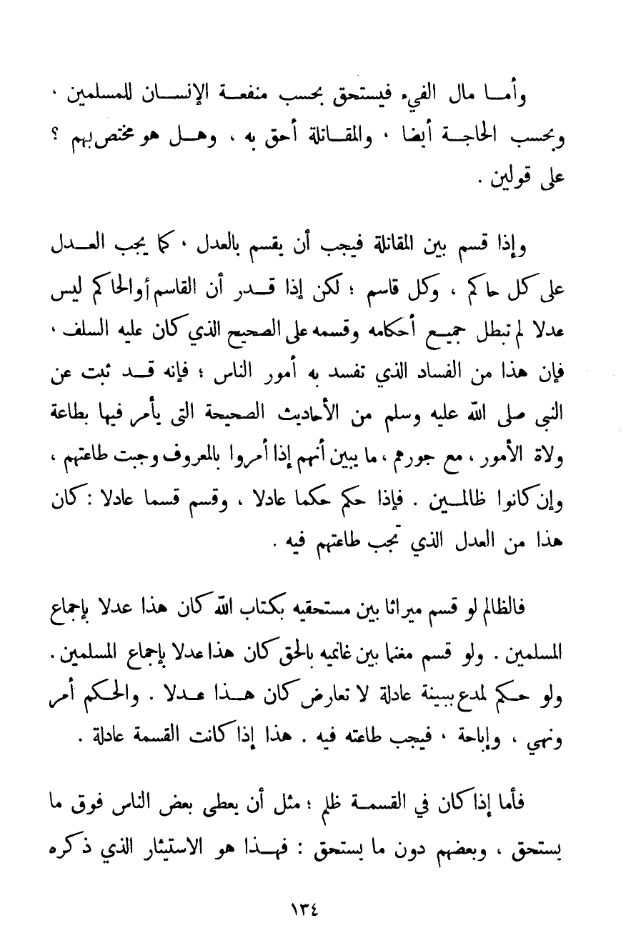 وَأَمَّا مَالُ الْفَيْءِ فَيُسْتَحَقُّ بِحَسَبِ مَنْفَعَةِ الْإِنْسَانِ لِلْمُسْلِمِينَ وَبِحَسَبِ الْحَاجَةِ أَيْضًا وَالْمُقَاتِلَةُ أَحَقُّ بِهِ وَهَلْ هُوَ مُخْتَصٌّ بِهِمْ؟ عَلَى قَوْلَيْنِ. وَإِذَا قُسِمَ بَيْنَ الْمُقَاتِلَةِ فَيَجِبُ أَنْ يُقْسَمَ بِالْعَدْلِ كَمَا يَجِبُ الْعَدْلُ عَلَى كُلِّ حَاكِمٍ وَكُلِّ قَاسِمٍ؛ لَكِنْ إذَا قُدِّرَ أَنَّ الْقَاسِمَ أَوْ الْحَاكِمَ لَيْسَ عَدْلًا لَمْ تَبْطُلْ جَمِيعُ أَحْكَامِهِ وَقَسْمُهُ عَلَى الصَّحِيحِ الَّذِي كَانَ عَلَيْهِ السَّلَفُ فَإِنَّ هَذَا مِنْ الْفَسَادِ الَّذِي تَفْسُدُ بِهِ أُمُورُ النَّاسِ؛ فَإِنَّهُ قَدْ ثَبَتَ عَنْ النَّبِيِّ صَلَّى اللَّهُ عَلَيْهِ وَسَلَّمَ مِنْ الْأَحَادِيثِ الصَّحِيحَةِ الَّتِي يَأْمُرُ فِيهَا بِطَاعَةِ وُلَاةِ الْأُمُورِ مَعَ جَوْرِهِمْ مَا يُبَيِّنُ أَنَّهُمْ إذَا أَمَرُوا بِالْمَعْرُوفِ وَجَبَتْ طَاعَتُهُمْ وَإِنْ كَانُوا ظَالِمِينَ. فَإِذَا حَكَّمَ حَكَمًا عَادِلًا وَقَسَمَ قَسْمًا عَادِلًا: كَانَ هَذَا مِنْ الْعَدْلِ الَّذِي تَجِبُ طَاعَتُهُمْ فِيهِ. فَالظَّالِمُ لَوْ قَسَمَ مِيرَاثًا بَيْنَ مُسْتَحِقِّيهِ بِكِتَابِ اللَّهِ كَانَ هَذَا عَدْلًا بِإِجْمَاعِ الْمُسْلِمِينَ. وَلَوْ قَسَمَ مَغْنَمًا بَيْنَ غَانِمِيهِ بِالْحَقِّ كَانَ هَذَا عَدْلًا بِإِجْمَاعِ الْمُسْلِمِينَ. وَلَوْ حَكَمَ لِمُدَّعٍ بِبَيِّنَةٍ عَادِلَةٍ لَا تُعَارَضُ كَانَ هَذَا عَدْلًا. وَالْحُكْمُ أَمْرٌ وَنَهْيٌ وَإِبَاحَةٌ فَيَجِبُ طَاعَتُهُ فِيهِ. هَذَا إذَا كَانَتْ الْقِسْمَةُ عَادِلَةً. فَأَمَّا إذَا كَانَ فِي الْقِسْمَةِ ظُلْمٌ؛ مِثْلَ أَنْ يُعْطِيَ بَعْضَ النَّاسِ فَوْقَ مَا يَسْتَحِقُّ وَبَعْضَهُمْ دُونَ مَا يَسْتَحِقُّ: فَهَذَا هُوَ الِاسْتِيثَارُ الَّذِي ذَكَرَهُ