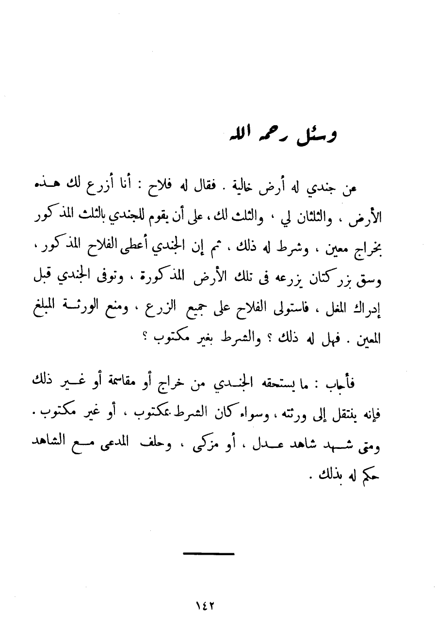 عَنْ جُنْدِيٍّ لَهُ أَرْضٌ خَالِيَةٌ. فَقَالَ لَهُ فَلَّاحٌ: أَنَا أَزْرَعُ لَك هَذِهِ الْأَرْضَ وَالثُّلُثَانِ لِي وَالثُّلُثُ لَك عَلَى أَنْ يَقُومَ لِلْجُنْدِيِّ بِالثُّلُثِ الْمَذْكُورِ بِخَرَاجِ مُعَيَّنٍ وَشَرَطَ لَهُ ذَلِكَ ثُمَّ إنَّ الْجُنْدِيَّ أَعْطَى الْفَلَّاحَ الْمَذْكُورَ وَسْقَ بِزْرِ كَتَّانٍ يَزْرَعُهُ فِي تِلْكَ الْأَرْضِ الْمَذْكُورَةِ وَتُوُفِّيَ الْجُنْدِيُّ قَبْلَ إدْرَاكِ الْمُغَلِّ فَاسْتَوْلَى الْفَلَّاحُ عَلَى جَمِيعِ الزَّرْعِ وَمَنَعَ الْوَرَثَةَ الْمَبْلَغَ الْمُعَيَّنَ. فَهَلْ لَهُ ذَلِكَ؟ وَالشَّرْطُ بِغَيْرِ مَكْتُوبٍ؟