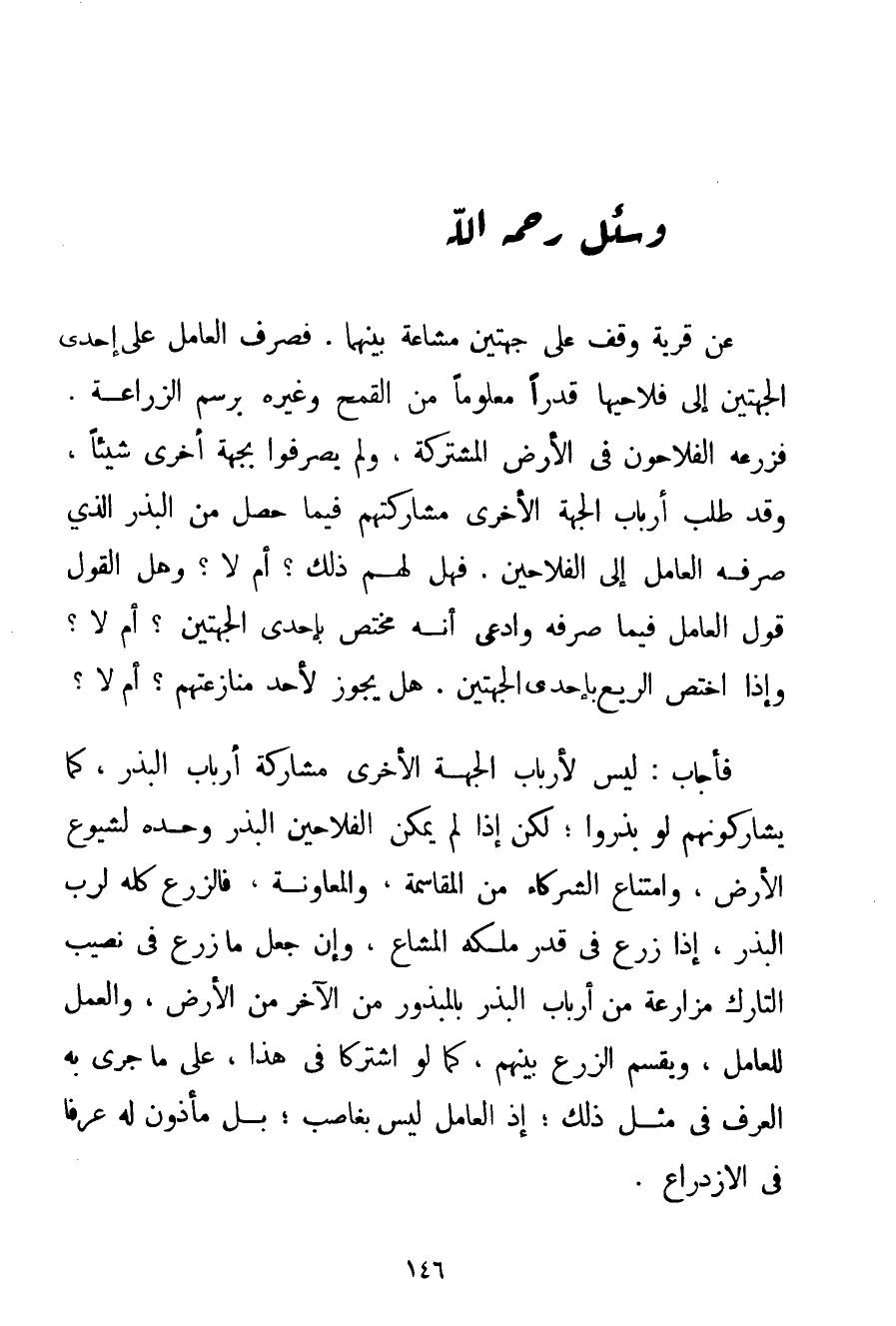 عَنْ قَرْيَةٍ وُقِفَ عَلَى جِهَتَيْنِ مُشَاعَةٍ بَيْنَهُمَا. فَصَرَفَ الْعَامِلُ عَلَى إحْدَى الْجِهَتَيْنِ إلَى فَلَّاحِيهَا قَدْرًا مَعْلُومًا مِنْ الْقَمْحِ وَغَيْرِهِ بِرَسْمِ الزِّرَاعَةِ. فَزَرَعَهُ الْفَلَّاحُونَ فِي الْأَرْضِ الْمُشْتَرَكَةِ وَلَمْ يَصْرِفُوا بِجِهَةِ أُخْرَى شَيْئًا وَقَدْ طَلَبَ أَرْبَابُ الْجِهَةِ الْأُخْرَى مُشَارَكَتَهُمْ فِيمَا حَصَلَ مِنْ الْبَذْرِ الَّذِي صَرَفَهُ الْعَامِلُ إلَى الْفَلَّاحِينَ. فَهَلْ لَهُمْ ذَلِكَ؟ أَمْ لَا؟ وَهَلْ الْقَوْلُ قَوْلُ الْعَامِلِ فِيمَا صَرَفَهُ وَادَّعَى أَنَّهُ مُخْتَصٌّ بِإِحْدَى الْجِهَتَيْنِ؟ أَمْ لَا؟ وَإِذَا اخْتَصَّ الرِّيعُ بِإِحْدَى الْجِهَتَيْنِ. هَلْ يَجُوزُ لِأَحَدِ مُنَازَعَتُهُمْ؟ أَمْ لَا؟