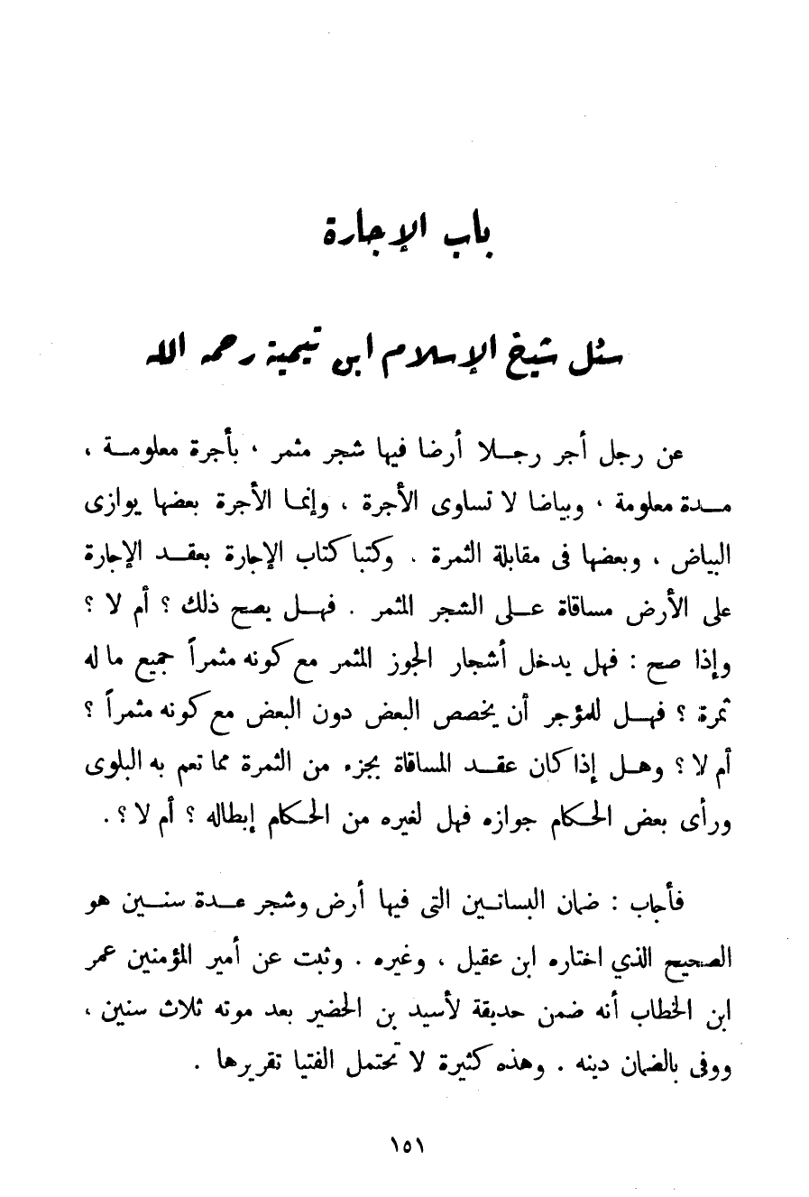 ضَمَانُ الْبَسَاتِينِ الَّتِي فِيهَا أَرْضٌ وَشَجَرٌ عِدَّةَ سِنِينَ هُوَ الصَّحِيحُ الَّذِي اخْتَارَهُ ابْنُ عَقِيلٍ وَغَيْرُهُ. وَثَبَتَ عَنْ أَمِيرِ الْمُؤْمِنِينَ عُمَرُ بْنُ الْخَطَّابِ أَنَّهُ ضَمِنَ حَدِيقَةً لأسيد بْنِ الحضير بَعْدَ مَوْتِهِ ثَلَاثَ سِنِينَ وَوَفَّى بِالضَّمَانِ دَيْنَهُ. وَهَذِهِ كَثِيرَةٌ لَا تَحْتَمِلُ الْفُتْيَا تَقْرِيرَهَا.