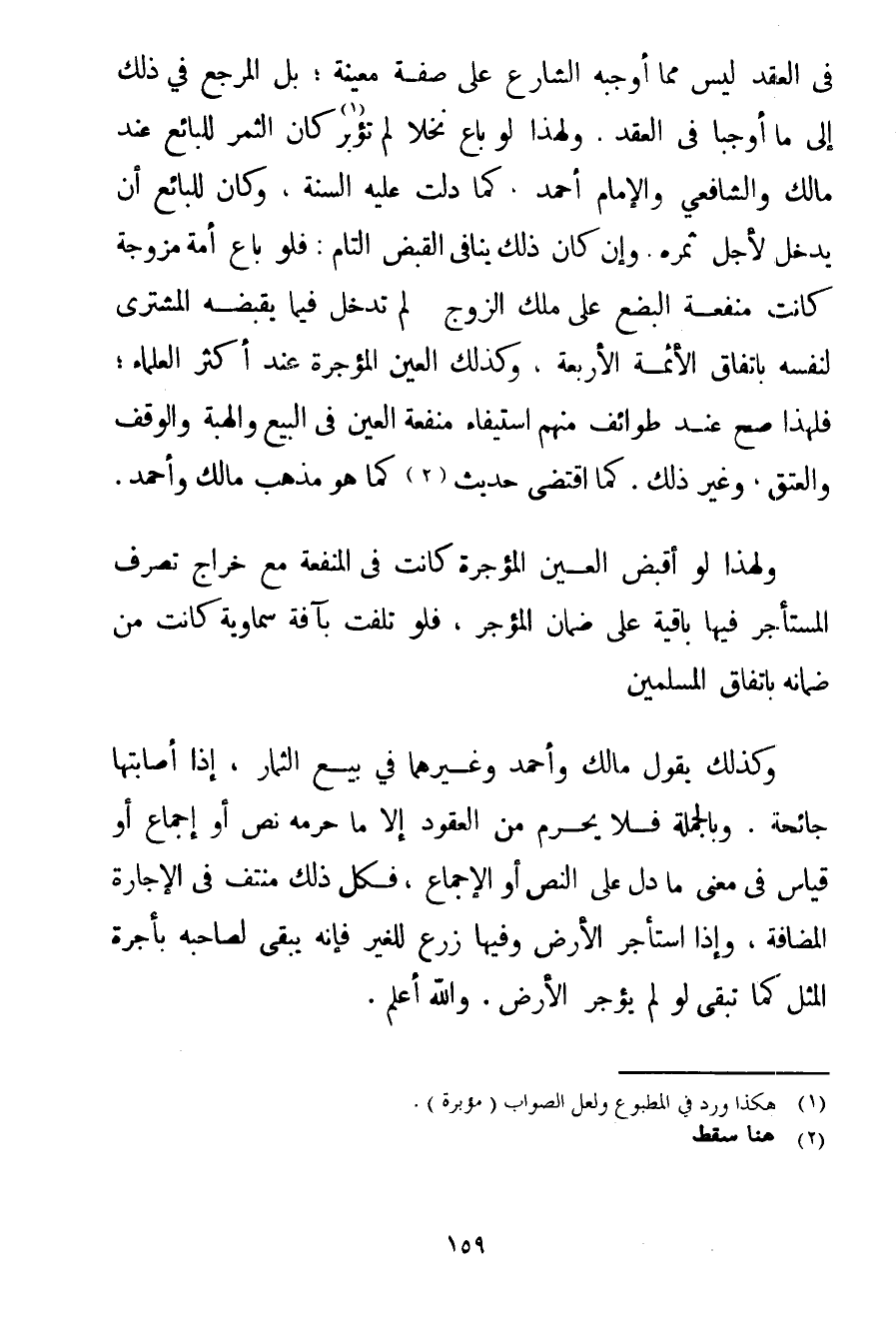 فِي الْعَقْدِ لَيْسَ مِمَّا أَوْجَبَهُ الشَّارِعُ عَلَى صِفَةٍ مُعَيَّنَةٍ؛ بَلْ الْمَرْجِعُ فِي ذَلِكَ إلَى مَا أَوْجَبَا فِي الْعَقْدِ. وَلِهَذَا لَوْ بَاعَ نَخْلًا لَمْ تُؤَبَّرْ كَانَ الثَّمَرُ لِلْبَائِعِ عِنْدَ مَالِكٍ وَالشَّافِعِيِّ وَالْإِمَامِ أَحْمَد كَمَا دَلَّتْ عَلَيْهِ السُّنَّةُ وَكَانَ لِلْبَائِعِ أَنْ يَدْخُلَ لِأَجْلِ ثَمَرِهِ. وَإِنْ كَانَ ذَلِكَ يُنَافِي الْقَبْضَ التَّامَّ: فَلَوْ بَاعَ أَمَةً مُزَوَّجَةً كَانَتْ مَنْفَعَةُ الْبُضْعِ عَلَى مِلْكِ الزَّوْجِ لَمْ تَدْخُلْ فِيمَا يَقْبِضُهُ الْمُشْتَرِي لِنَفْسِهِ بِاتِّفَاقِ الْأَئِمَّةِ الْأَرْبَعَةِ وَكَذَلِكَ الْعَيْنُ الْمُؤَجَّرَةُ عِنْدَ أَكْثَرِ الْعُلَمَاءِ؛ فَلِهَذَا صَحَّ عِنْدَ طَوَائِفَ مِنْهُمْ اسْتِيفَاءُ مَنْفَعَةِ الْعَيْنِ فِي الْبَيْعِ وَالْهِبَةِ وَالْوَقْفِ وَالْعِتْقِ وَغَيْرِ ذَلِكَ. كَمَا اقْتَضَى حَدِيثُ. . . (1) كَمَا هُوَ مَذْهَبُ مَالِكٍ وَأَحْمَد. وَلِهَذَا لَوْ أُقْبِضَ الْعَيْنَ الْمُؤَجَّرَةَ كَانَتْ فِي الْمَنْفَعَةِ مَعَ خَرَاجِ تَصَرُّفِ الْمُسْتَأْجِرِ فِيهَا بَاقِيَةٌ عَلَى ضَمَانِ الْمُؤَجِّرِ فَلَوْ تَلِفَتْ بِآفَةِ سَمَاوِيَّةٍ كَانَتْ مِنْ ضَمَانِهِ بِاتِّفَاقِ الْمُسْلِمِينَ. وَكَذَلِكَ يَقُولُ مَالِكٍ وَأَحْمَد وَغَيْرُهُمَا فِي بَيْعِ الثِّمَارِ إذَا أَصَابَتْهَا جَائِحَةٌ. وَبِالْجُمْلَةِ فَلَا يَحْرِمُ مِنْ الْعُقُودِ إلَّا مَا حَرَّمَهُ نَصٌّ أَوْ إجْمَاعٌ أَوْ قِيَاسٌ فِي مَعْنَى مَا دَلَّ عَلَى النَّصِّ أَوْ الْإِجْمَاعِ فَكُلُّ ذَلِكَ مُنْتَفٍ فِي الْإِجَارَةِ الْمُضَافَةِ وَإِذَا اسْتَأْجَرَ الْأَرْضَ وَفِيهَا زَرْعٌ لِلْغَيْرِ فَإِنَّهُ يَبْقَى لِصَاحِبِهِ بِأُجْرَةِ الْمِثْلِ كَمَا تَبْقَى لَوْ لَمْ يُؤَجِّرْ الْأَرْضَ. وَاَللَّهُ أَعْلَمُ.