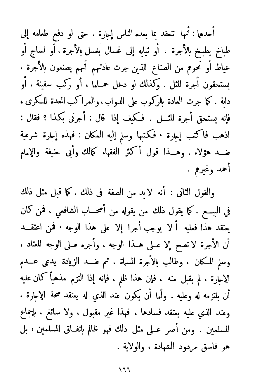 أَحَدُهُمَا: أَنَّهَا تَنْعَقِدُ بِمَا يَعُدُّهُ النَّاسُ إجَارَةً حَتَّى لَوْ دَفَعَ طَعَامَهُ إلَى طَبَّاخٍ يَطْبُخُ بِالْأُجْرَةِ أَوْ ثِيَابَهُ إلَى غَسَّالٍ يَغْسِلُ بِالْأُجْرَةِ أَوْ نَسَّاجٍ أَوْ خَيَّاطٍ أَوْ نَحْوَهُمْ مِنْ الصُّنَّاعِ الَّذِينَ جَرَتْ عَادَتُهُمْ أَنَّهُمْ يَصْنَعُونَ بِالْأُجْرَةِ يَسْتَحِقُّونَ أُجْرَةَ الْمِثْلِ. وَكَذَلِكَ لَوْ دَخَلَ حَمَّامًا أَوْ رَكِبَ سَفِينَةً أَوْ دَابَّةً. كَمَا جَرَتْ الْعَادَةُ بِالرُّكُوبِ عَلَى الدَّوَابِّ وَالْمَرَاكِبِ الْمُعَدَّةِ لِلْكَرْيِ فَإِنَّهُ يَسْتَحِقُّ أُجْرَةَ الْمِثْلِ. فَكَيْفَ إذَا قَالَ: أَجِّرْنِي بِكَذَا؟ فَقَالَ: اذْهَبْ فَاكْتُبْ إجَارَةً فَكَتَبَهَا وَسَلَّمَ إلَيْهِ الْمَكَانَ: فَهَذِهِ إجَارَةٌ شَرْعِيَّةٌ عِنْدَ هَؤُلَاءِ. وَهَذَا قَوْلُ أَكْثَرِ الْفُقَهَاءِ كَمَالِكِ وَأَبِي حَنِيفَةَ وَالْإِمَامِ أَحْمَد وَغَيْرِهِمْ. وَالْقَوْلُ الثَّانِي: أَنَّهُ لَا بُدَّ مِنْ الصِّفَةِ فِي ذَلِكَ. كَمَا قِيلَ مِثْلَ ذَلِكَ فِي الْبَيْعِ. كَمَا يَقُولُ ذَلِكَ مَنْ يَقُولُهُ مِنْ أَصْحَابِ الشَّافِعِيِّ فَمَنْ كَانَ يَعْتَقِدُ هَذَا فَعَلَيْهِ أَلَّا يُوجِبَ أَجْرًا إلَّا عَلَى هَذَا الْوَجْهِ فَمَنْ اعْتَقَدَ أَنَّ الْأُجْرَةَ لَا تَصِحُّ إلَّا عَلَى هَذَا الْوَجْهِ وَأَجَّرَهُ عَلَى الْوَجْهِ الْمُعْتَادِ وَسَلَّمَ الْمَكَانَ وَطَالَبَ بِالْأُجْرَةِ الْمُسَمَّاةِ ثُمَّ عِنْدَ الزِّيَادَةِ يَدَّعِي عَدَمَ الْإِجَارَةِ لَمْ يُقْبَلْ مِنْهُ فَإِنَّ هَذَا ظُلْمٌ فَإِنَّهُ إذَا الْتَزَمَ مَذْهَبًا كَانَ عَلَيْهِ أَنْ يَلْتَزِمَهُ لَهُ وَعَلَيْهِ. وَأَمَّا أَنْ يَكُونَ عِنْدَ الَّذِي لَهُ يَعْتَقِدُ صِحَّةَ الْإِجَارَةِ وَعِنْدَ الَّذِي عَلَيْهِ يَعْتَقِدُ فَسَادَهَا فَهَذَا غَيْرُ مَقْبُولٍ وَلَا سَائِغٍ بِإِجْمَاعِ الْمُسْلِمِينَ. وَمَنْ أَصَرَّ عَلَى مِثْلِ ذَلِكَ فَهُوَ ظَالِمٌ بِاتِّفَاقِ الْمُسْلِمِينَ؛ بَلْ هُوَ فَاسِقٌ مَرْدُودُ الشَّهَادَةِ وَالْوِلَايَةِ.
