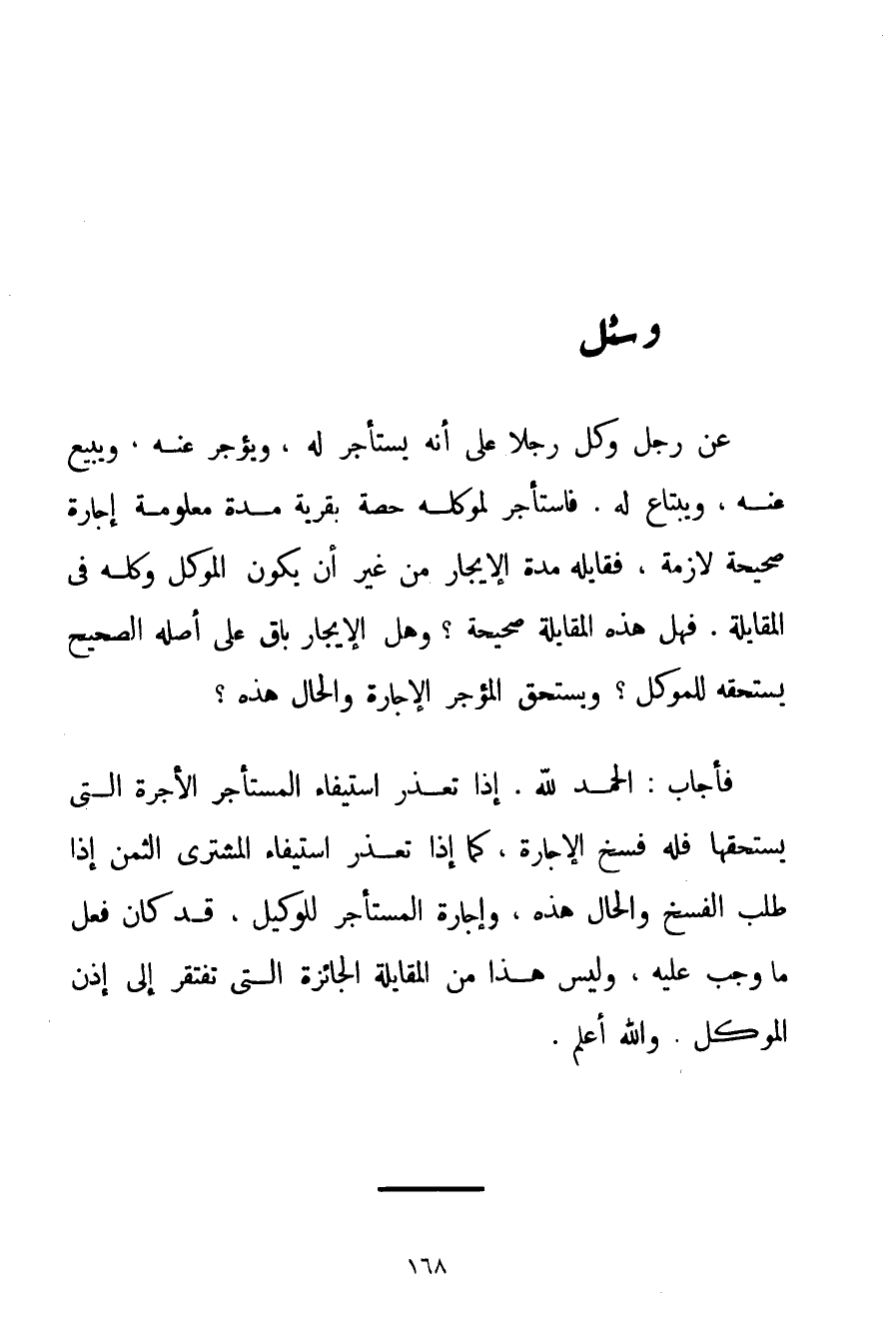 عَنْ رَجُلٍ وَكَّلَ رَجُلًا عَلَى أَنَّهُ يَسْتَأْجِرُ لَهُ وَيُؤَجِّرُ عَنْهُ وَيَبِيعُ عَنْهُ وَيَبْتَاعُ لَهُ. فَاسْتَأْجَرَ لِمُوَكِّلِهِ حِصَّةً بِقَرْيَةِ مُدَّةً مَعْلُومَةً إجَارَةً صَحِيحَةً لَازِمَةً فقايله مُدَّةَ الْإِيجَارِ مِنْ غَيْرِ أَنْ يَكُونَ الْمُوَكِّلُ وَكَّلَهُ فِي الْمُقَايَلَةِ. فَهَلْ هَذِهِ الْمُقَايَلَةُ صَحِيحَةٌ؟ وَهَلْ الْإِيجَارُ بَاقٍ عَلَى أَصْلِهِ الصَّحِيحِ يَسْتَحِقُّهُ لِلْمُوَكِّلِ؟ وَيَسْتَحِقُّ الْمُؤَجِّرُ الْإِجَارَةَ وَالْحَالُ هَذِهِ؟