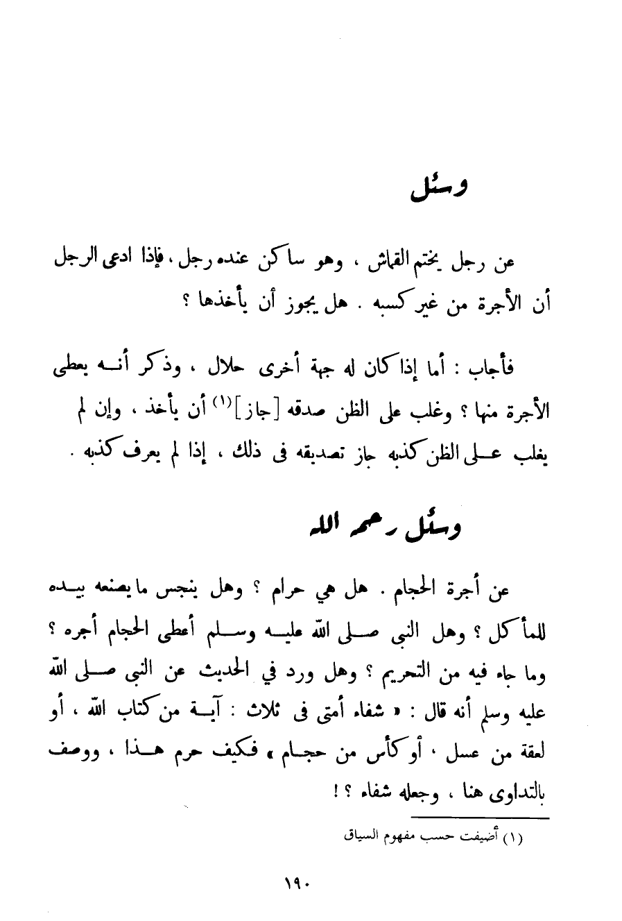 عَنْ رَجُلٍ يَخْتِمُ الْقُمَاشَ وَهُوَ سَاكِنٌ عِنْدَهُ رَجُلٌ فَإِذَا ادَّعَى الرَّجُلُ أَنَّ الْأُجْرَةَ مِنْ غَيْرِ كَسْبِهِ. هَلْ يَجُوزُ أَنْ يَأْخُذَهَا؟