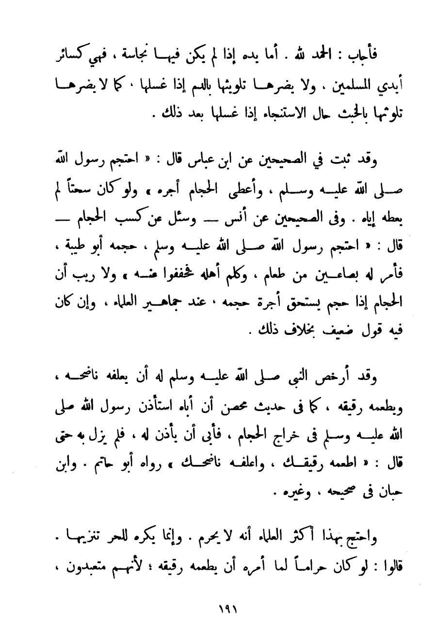 الْحَمْدُ لِلَّهِ، أَمَّا يَدُهُ إذَا لَمْ يَكُنْ فِيهَا نَجَاسَةٌ فَهِيَ كَسَائِرِ أَيْدِي الْمُسْلِمِينَ وَلَا يَضُرُّهَا تَلْوِيثُهَا بِالدَّمِ إذَا غَسَلَهَا كَمَا لَا يَضُرُّهَا تَلَوُّثُهَا بِالْخَبَثِ حَالَ الِاسْتِنْجَاءِ إذَا غَسَلَهَا بَعْدَ ذَلِكَ. وَقَدْ ثَبَتَ فِي الصَّحِيحَيْنِ عَنْ ابْنِ عَبَّاسٍ قَالَ: {احْتَجَمَ رَسُولُ اللَّهِ صَلَّى اللَّهُ عَلَيْهِ وَسَلَّمَ وَأَعْطَى الْحَجَّامَ أَجْرَهُ} وَلَوْ كَانَ سُحْتًا لَمْ يُعْطِهِ إيَّاهُ. وَفِي الصَّحِيحَيْنِ عَنْ {أَنَسٍ - وَسُئِلَ عَنْ كَسْبِ الْحَجَّامِ - قَالَ: احْتَجَمَ رَسُولُ اللَّهِ صَلَّى اللَّهُ عَلَيْهِ وَسَلَّمَ حَجَمَهُ أَبُو طِيبَةَ فَأَمَرَ لَهُ بِصَاعَيْنِ مِنْ طَعَامٍ وَكَلَّمَ أَهْلَهُ فَخَفَّفُوا عَنْهُ} وَلَا رَيْبَ أَنَّ الْحَجَّامَ إذَا حَجَمَ يَسْتَحِقُّ أُجْرَةَ حَجْمِهِ عِنْدَ جَمَاهِيرِ الْعُلَمَاءِ وَإِنْ كَانَ فِيهِ قَوْلٌ ضَعِيفُ بِخِلَافِ ذَلِكَ. وَقَدْ أَرْخَصَ النَّبِيُّ صَلَّى اللَّهُ عَلَيْهِ وَسَلَّمَ لَهُ أَنْ يَعْلِفَهُ نَاضِحَهُ وَيُطْعِمَهُ رَقِيقَهُ كَمَا فِي حَدِيثِ {مُحْصَنٍ أَنَّ أَبَاهُ اسْتَأْذَنَ رَسُولَ اللَّهِ صَلَّى اللَّهُ عَلَيْهِ وَسَلَّمَ فِي خَرَاجِ الْحَجَّامِ فَأَبَى أَنْ يَأْذَنَ لَهُ فَلَمْ يَزَلْ بِهِ حَتَّى قَالَ: أَطْعِمْهُ رَقِيقَك وَاعْلِفْهُ نَاضِحَك} رَوَاهُ أَبُو حَاتِمٍ ابْنُ حِبَّانَ فِي صَحِيحِهِ وَغَيْرُهُ. وَاحْتَجَّ بِهَذَا أَكْثَرُ الْعُلَمَاءِ أَنَّهُ لَا يَحْرُمُ. وَإِنَّمَا يُكْرَهُ لِلْحَرِّ تَنْزِيهًا. قَالُوا: لَوْ كَانَ حَرَامًا لَمَا أَمَرَهُ أَنْ يُطْعِمَهُ رَقِيقَهُ؛ لِأَنَّهُمْ مُتَعَبِّدُونَ