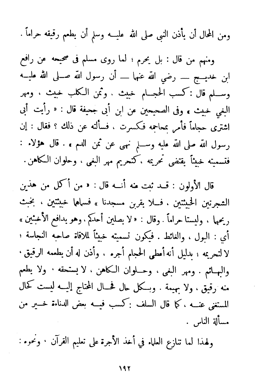 وَمِنْ الْمُحَالِ أَنْ يَأْذَنَ النَّبِيُّ صَلَّى اللَّهُ عَلَيْهِ وَسَلَّمَ أَنْ يُطْعِمَ رَقِيقَهُ حَرَامًا. وَمِنْهُمْ مَنْ قَالَ: بَلْ يَحْرُمُ؛ لِمَا رَوَى مُسْلِمٌ فِي صَحِيحِهِ عَنْ رَافِعِ بْنِ خَدِيجٍ - رَضِيَ اللَّهُ عَنْهُمَا - أَنَّ رَسُولَ اللَّهِ صَلَّى اللَّهُ عَلَيْهِ وَسَلَّمَ قَالَ: {كَسْبُ الْحَجَّامِ خَبِيثٌ وَثَمَنُ الْكَلْبِ خَبِيثٌ وَمَهْرُ الْبَغِيِّ خَبِيثٌ} " وَفِي الصَّحِيحَيْنِ عَنْ {ابْنِ أَبِي جحيفة قَالَ: رَأَيْت أَبِي اشْتَرَى حَجَّامًا فَأَمَرَ بِمَحَاجِمِهِ فَكُسِرَتْ فَسَأَلْته عَنْ ذَلِكَ؟ فَقَالَ: إنَّ رَسُولَ اللَّهِ صَلَّى اللَّهُ عَلَيْهِ وَسَلَّمَ نَهَى عَنْ ثَمَنِ الدَّمِ} . قَالَ هَؤُلَاءِ: فَتَسْمِيَتُهُ خَبِيثًا يَقْتَضِي تَحْرِيمَهُ كَتَحْرِيمِ مَهْرِ الْبَغِيِّ وَحُلْوَانِ الْكَاهِنِ. قَالَ الْأَوَّلُونَ: قَدْ ثَبَتَ عَنْهُ أَنَّهُ قَالَ: " {مَنْ أَكَلَ مِنْ هَذَيْنِ الشَّجَرَتَيْنِ الْخَبِيثَتَيْنِ فَلَا يَقْرَبَن مَسْجِدَنَا} " فَسَمَّاهُمَا خَبِيثَتَيْنِ بِخُبْثِ رِيحِهِمَا وَلَيْسَتَا حَرَامًا. وَقَالَ: " {لَا يُصَلِّيَن أَحَدُكُمْ وَهُوَ يُدَافِعُ الْأَخْبَثِينَ} أَيْ: الْبَوْلُ وَالْغَائِطُ. فَيَكُونُ تَسْمِيَتُهُ خَبِيثًا لِمُلَاقَاةِ صَاحِبِهِ النَّجَاسَةَ؛ لَا لِتَحْرِيمِهِ؛ بِدَلِيلِ أَنَّهُ أَعْطَى الْحَجَّامَ أَجْرَهُ وَأَذِنَ لَهُ أَنْ يُطْعِمَهُ الرَّقِيقَ وَالْبَهَائِمَ. وَمَهْرُ الْبَغِيِّ وَحُلْوَانُ الْكَاهِنِ لَا يَسْتَحِقُّهُ وَلَا يُطْعَمُ مِنْهُ رَقِيقٌ وَلَا بَهِيمَةٌ. وَبِكُلِّ حَالٍ فَحَالُ الْمُحْتَاجِ إلَيْهِ لَيْسَتْ كَحَالِ الْمُسْتَغْنِي عَنْهُ كَمَا قَالَ السَّلَفُ: كَسْبٌ فِيهِ بَعْضُ الدَّنَاءَةِ خَيْرٌ مِنْ مَسْأَلَةِ النَّاسِ. وَلِهَذَا لَمَّا تَنَازَعَ الْعُلَمَاءُ فِي أَخْذِ الْأُجْرَةِ عَلَى تَعْلِيمِ الْقُرْآنِ وَنَحْوِهِ: