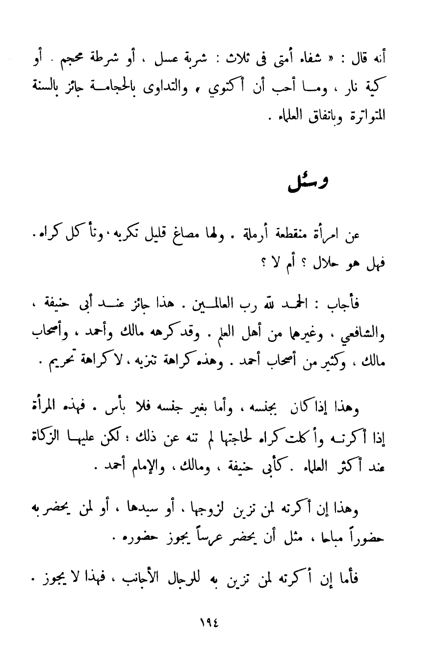 أَنَّهُ قَالَ: {شِفَاءُ أُمَّتِي فِي ثَلَاثٍ: شَرْبَةُ عَسَلٍ أَوْ شَرْطَةُ مِحْجَمٍ. أَوْ كَيَّةُ نَارٍ وَمَا أُحِبُّ أَنْ أَكْتَوِيَ} وَالتَّدَاوِي بِالْحِجَامَةِ جَائِزٌ بِالسُّنَّةِ الْمُتَوَاتِرَةِ وَبِاتِّفَاقِ الْعُلَمَاءِ.