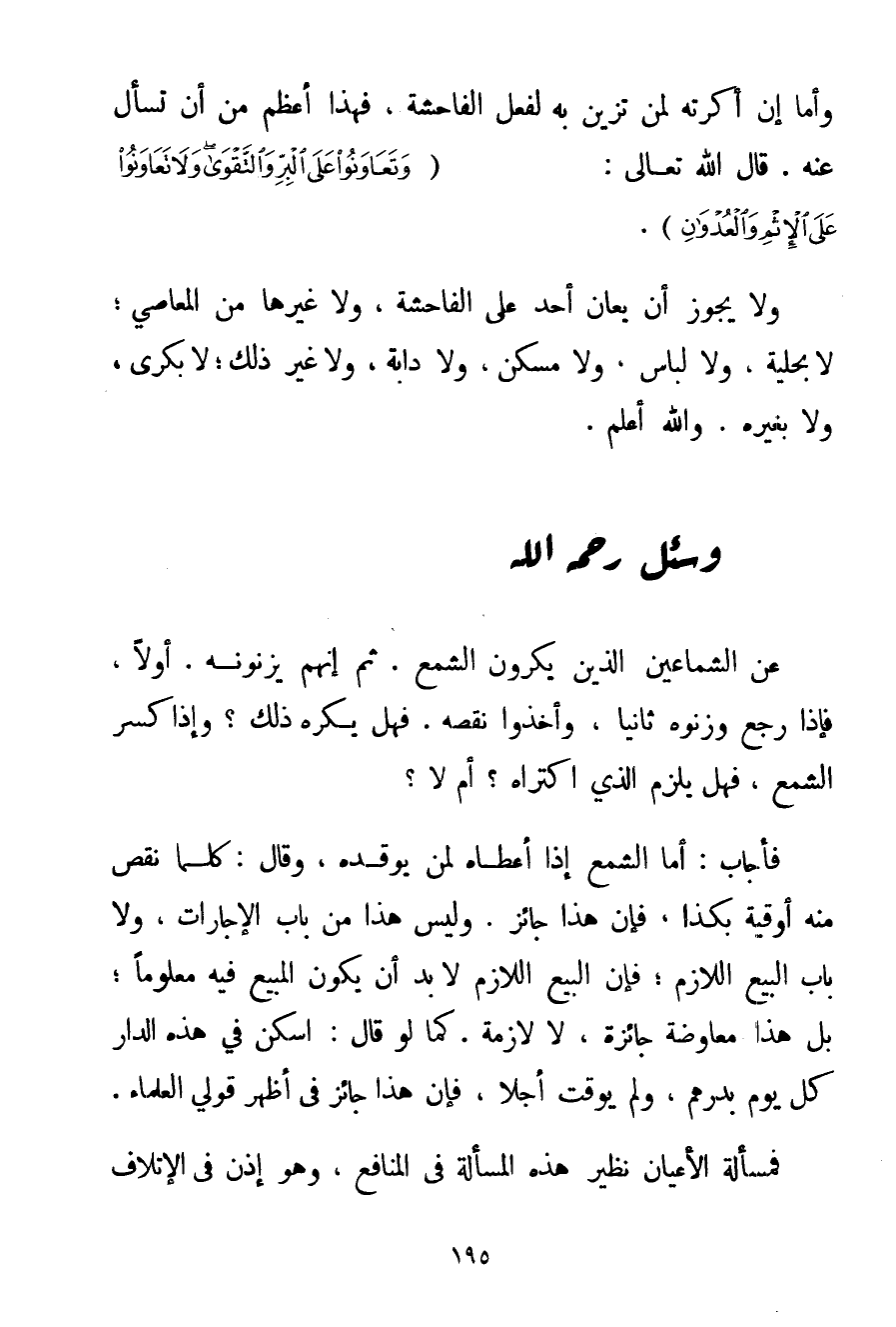 أَمَّا الشَّمْعُ إذَا أَعْطَاهُ لِمَنْ يُوقِدُهُ وَقَالَ: كُلَّمَا نَقَصَ مِنْهُ أُوقِيَّةٌ بِكَذَا فَإِنَّ هَذَا جَائِزٌ. وَلَيْسَ هَذَا مِنْ بَابِ الْإِجَارَاتِ وَلَا بَابِ الْبَيْعِ اللَّازِمِ؛ فَإِنَّ الْبَيْعَ اللَّازِمَ لَا بُدَّ أَنْ يَكُونَ الْمَبِيع فِيهِ مَعْلُومًا؛ بَلْ هَذَا مُعَاوَضَةٌ جَائِزَةٌ لَا لَازِمَةٌ. كَمَا لَوْ قَالَ: اُسْكُنْ فِي هَذِهِ الدَّارِ كُلَّ يَوْمٍ بِدِرْهَمِ وَلَمْ يُوَقِّتْ أَجَلًا فَإِنَّ هَذَا جَائِزٌ فِي أَظْهَرِ قَوْلَيْ الْعُلَمَاءِ. فَمَسْأَلَةُ الْأَعْيَانِ نَظِيرُ هَذِهِ الْمَسْأَلَةِ فِي الْمَنَافِعِ وَهُوَ إذْنٌ فِي الْإِتْلَافِ
