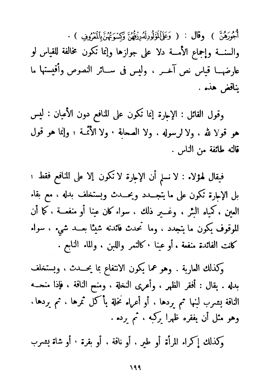 أُجُورَهُنَّ} وَقَالَ: {وَعَلَى الْمَوْلُودِ لَهُ رِزْقُهُنَّ وَكِسْوَتُهُنَّ بِالْمَعْرُوفِ} . وَالسُّنَّةُ وَإِجْمَاعُ الْأُمَّةِ دَلَّا عَلَى جَوَازِهَا وَإِنَّمَا تَكُونُ مُخَالِفَةً لِلْقِيَاسِ لَوْ عَارَضَهَا قِيَاسُ نَصٍّ آخَرَ وَلَيْسَ فِي سَائِر النُّصُوصِ وَأَقْيِسَتِهَا مَا يُنَاقِضُ هَذِهِ. وَقَوْلُ الْقَائِلِ: الْإِجَارَةُ إنَّمَا تَكُونُ عَلَى الْمَنَافِعِ دُونَ الْأَعْيَانِ: لَيْسَ هُوَ قَوْلًا لِلَّهِ وَلَا لِرَسُولِهِ وَلَا الصَّحَابَةِ وَلَا الْأَئِمَّةِ؛ وَإِنَّمَا هُوَ قَوْلٌ قَالَتْهُ طَائِفَةٌ مِنْ النَّاسِ. فَيُقَالُ لِهَؤُلَاءِ: لَا نُسَلِّمُ أَنَّ الْإِجَارَةَ لَا تَكُونُ إلَّا عَلَى الْمَنَافِعِ فَقَطْ؛ بَلْ الْإِجَارَةُ تَكُونُ عَلَى مَا يَتَجَدَّدُ وَيَحْدُثُ وَيُسْتَخْلَفُ بَدَلُهُ مَعَ بَقَاءِ الْعَيْنِ كَمِيَاهِ الْبِئْرِ وَغَيْرِ ذَلِكَ سَوَاءٌ كَانَ عَيْنًا أَوْ مَنْفَعَةً كَمَا أَنَّ الْمَوْقُوفَ يَكُونُ مَا يَتَجَدَّدُ وَمَا تَحْدُثُ فَائِدَتُهُ شَيْئًا بَعْدَ شَيْءٍ سَوَاءٌ كَانَتْ الْفَائِدَةُ مَنْفَعَةً أَوْ عَيْنًا كَالتَّمْرِ وَاللَّبَنِ وَالْمَاءِ النَّابِعِ. وَكَذَلِكَ الْعَارِيَةُ. وَهُوَ عَمَّا يَكُونُ الِانْتِفَاعُ بِمَا يَحْدُثُ وَيُسْتَخْلَفُ بَدَلُهُ. يُقَالُ: أَفْقَرَ الظَّهْرَ وَأَعْرَى النَّخْلَةَ وَمَنَحَ النَّاقَةَ فَإِذَا مَنَحَهُ النَّاقَةَ يَشْرَبُ لَبَنَهَا ثُمَّ يَرُدُّهَا أَوْ أَعْرَاهُ نَخْلَةً يَأْكُلُ ثَمَرَهَا ثُمَّ يَرُدُّهَا وَهُوَ مِثْلُ أَنْ يُفْقِرَهُ ظَهْرًا يَرْكَبُهُ ثُمَّ يَرُدُّهُ. وَكَذَلِكَ إكْرَاءُ الْمَرْأَةِ أَوْ طَيْرٍ أَوْ نَاقَةٍ أَوْ بَقَرَةٍ أَوْ شَاةٍ يَشْرَبُ